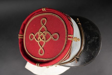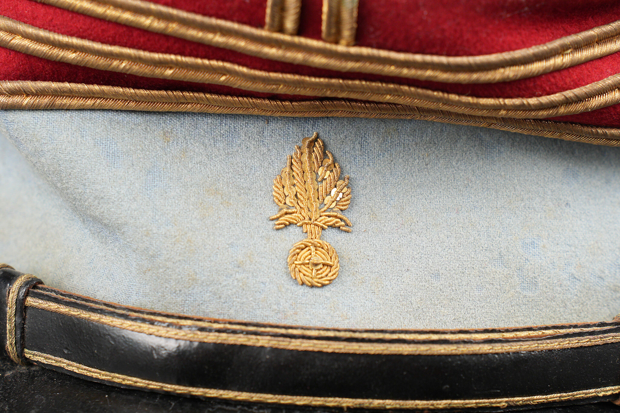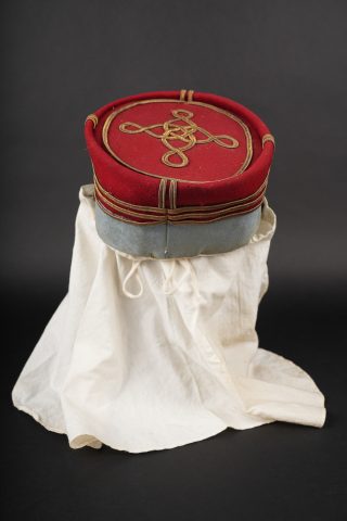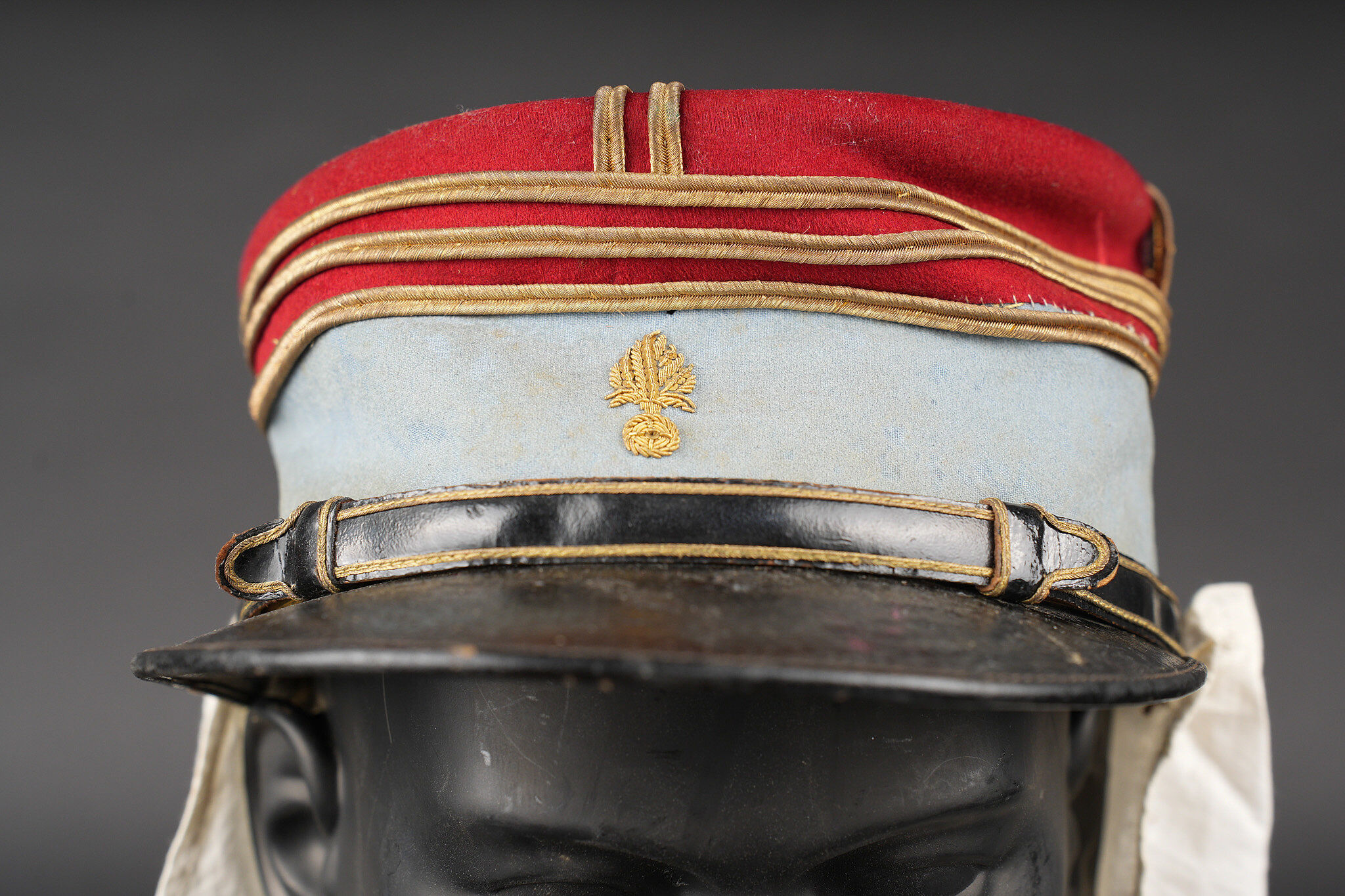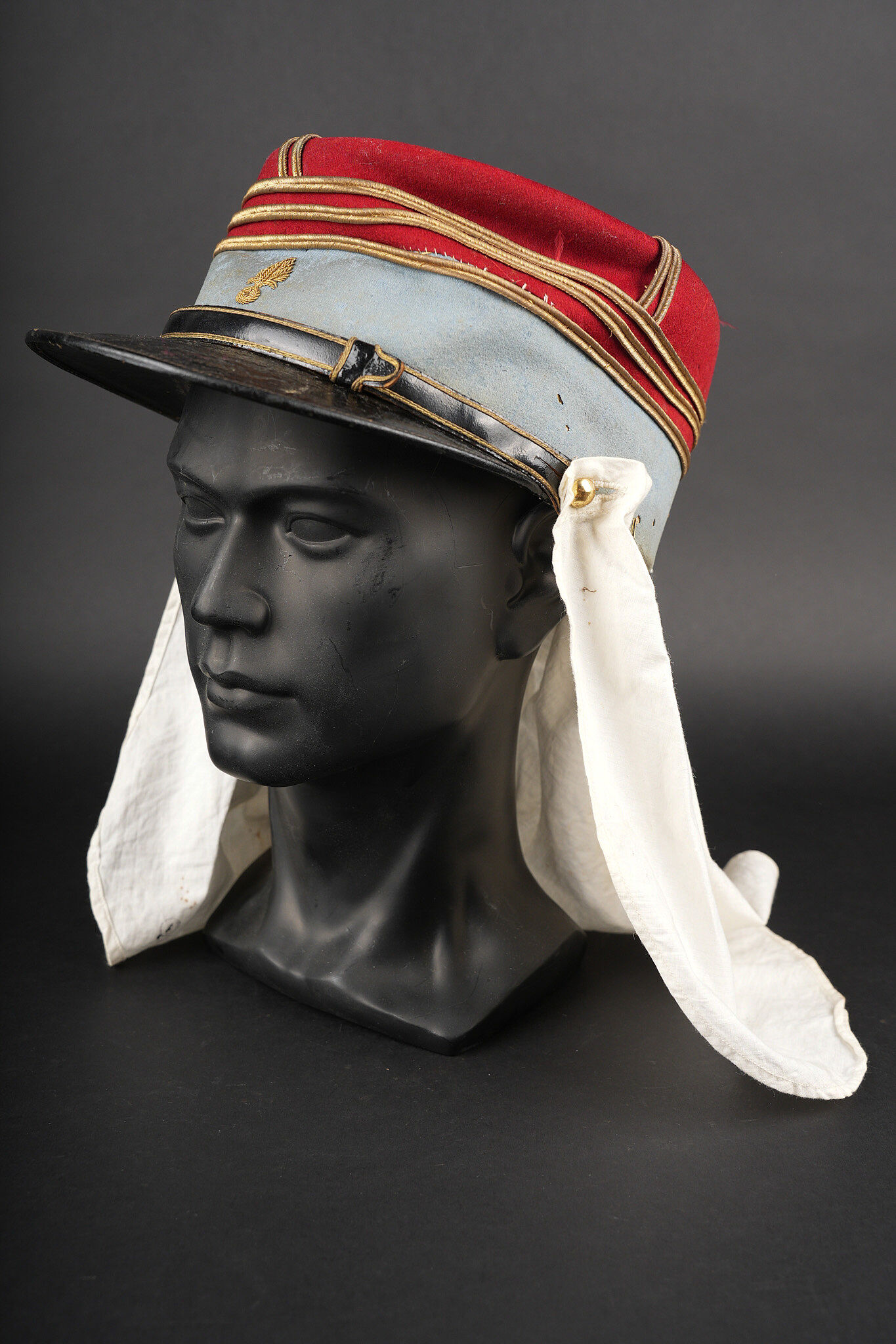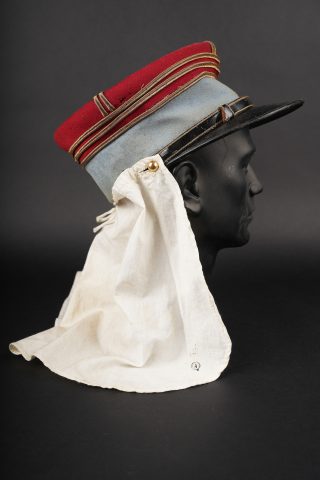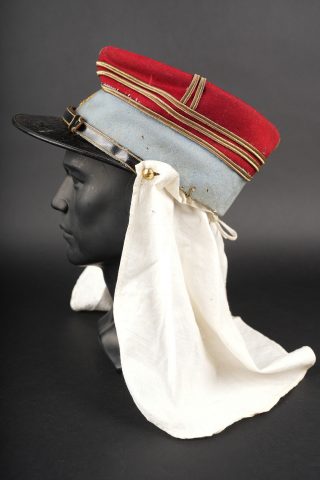 Képi d’un capitaine des tirailleurs. Képi de capitaine tirailleurs et troupes indigènes rattaché à un état major, confectionné en drap garance, bandeau bleu clair. Grenade frontale brodée cannetille, galons de capitaine cousus d’origine. Fausse jugulaire en cuir laquée bordé d’un fil cannetille retenue par deux boutons lisses dorés, recouvrant une fausse jugulaire dorée. Visière en cuir doublée d’un maroquin portant les initiales P.P. Doublure en soie noire, le bandeau de sudation en cuir marron possède le marquage du tailleur Ruettard à Lyon. Un couvre nuque en toile blanche est fixé au képi par trois crochets et deux fenes pour le passage des boutons. Tirailleur captain’s kepi (staff attachment). Garance cloth with light-blue band. Bullion grenade badge, captain’s rank lace sewn in place. Black patent-leather false chinstrap edged with cannetille and secured by two plain gilt buttons, covering a gilt chinstrap. Leather visor lined in morocco stamped with the initials P.P. Black silk lining. Brown leather sweatband with tailor’s mark Ruettard, Lyon. White canvas neck curtain attached by three hooks and two buttonholes.