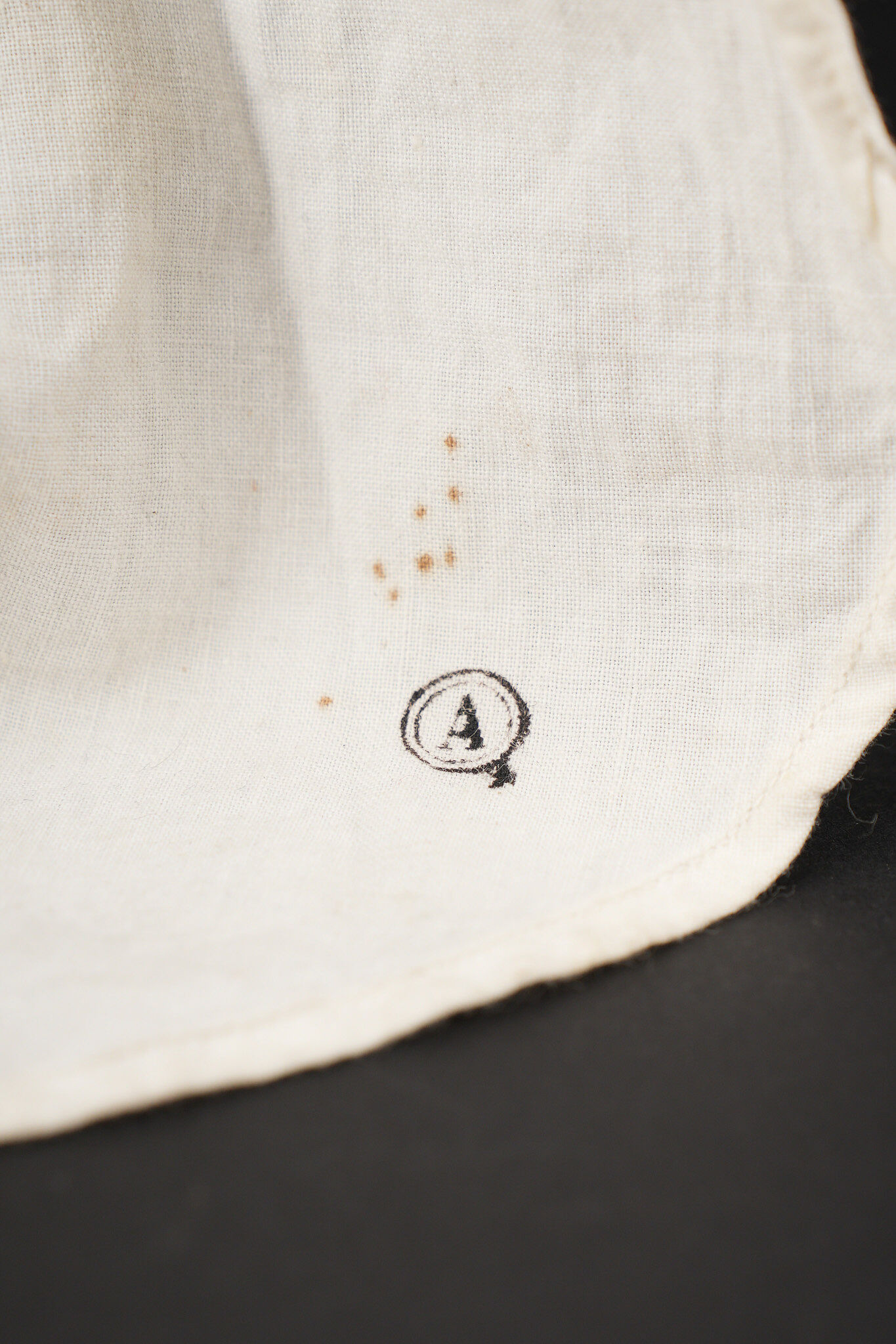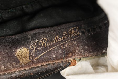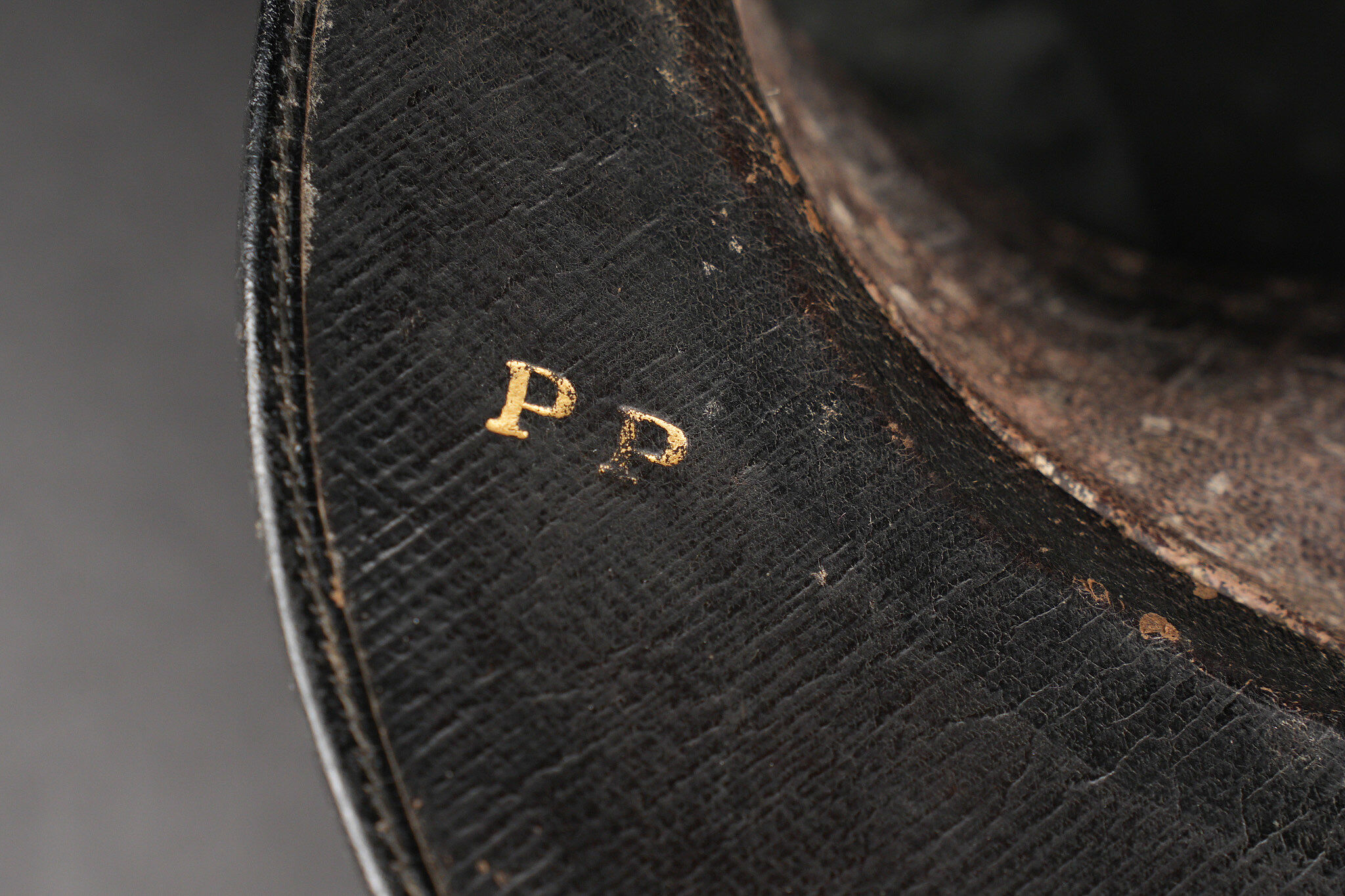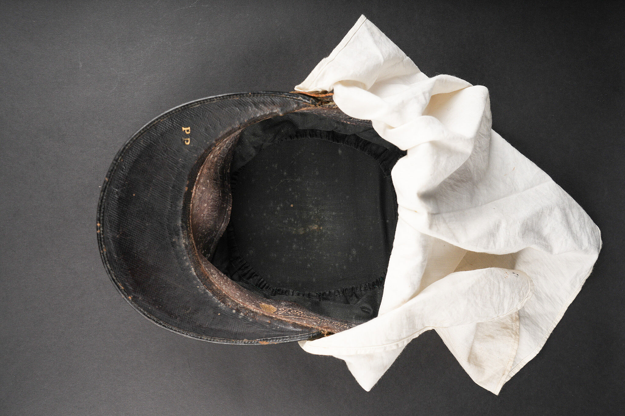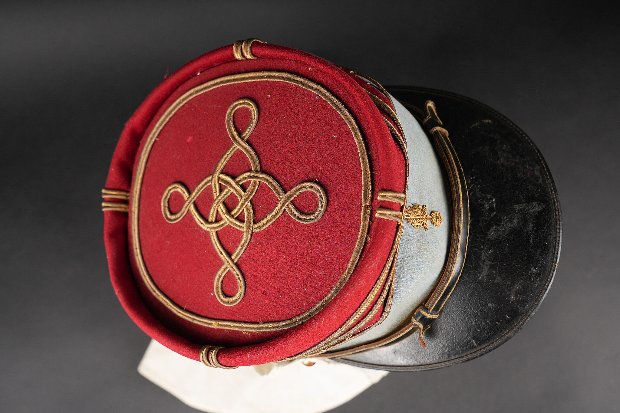 Képi d’un capitaine des tirailleurs. Képi de capitaine tirailleurs et troupes indigènes rattaché à un état major, confectionné en drap garance, bandeau bleu clair. Grenade frontale brodée cannetille, galons de capitaine cousus d’origine. Fausse jugulaire en cuir laquée bordé d’un fil cannetille retenue par deux boutons lisses dorés, recouvrant une fausse jugulaire dorée. Visière en cuir doublée d’un maroquin portant les initiales P.P. Doublure en soie noire, le bandeau de sudation en cuir marron possède le marquage du tailleur Ruettard à Lyon. Un couvre nuque en toile blanche est fixé au képi par trois crochets et deux fenes pour le passage des boutons. Tirailleur captain’s kepi (staff attachment). Garance cloth with light-blue band. Bullion grenade badge, captain’s rank lace sewn in place. Black patent-leather false chinstrap edged with cannetille and secured by two plain gilt buttons, covering a gilt chinstrap. Leather visor lined in morocco stamped with the initials P.P. Black silk lining. Brown leather sweatband with tailor’s mark Ruettard, Lyon. White canvas neck curtain attached by three hooks and two buttonholes.