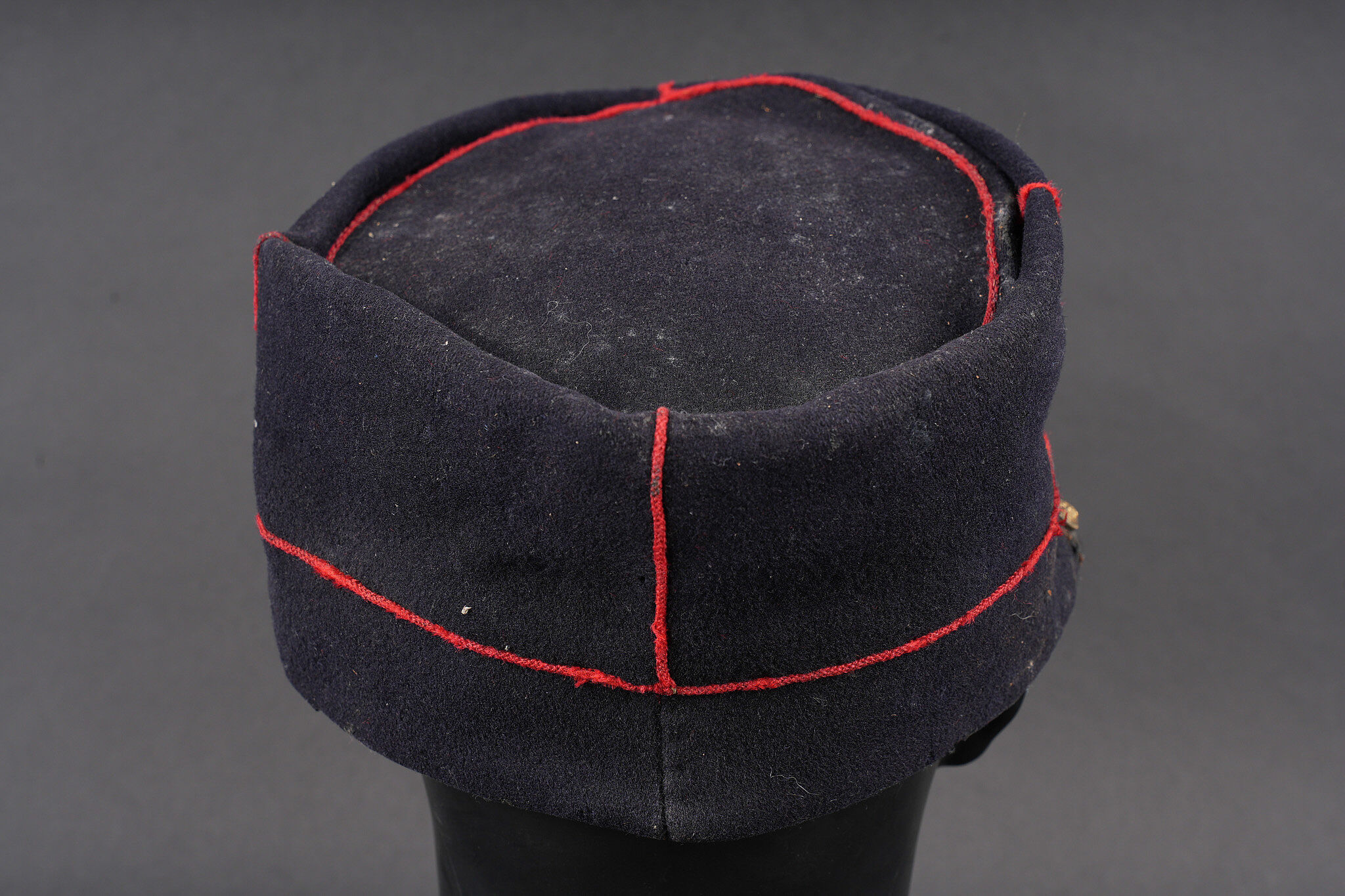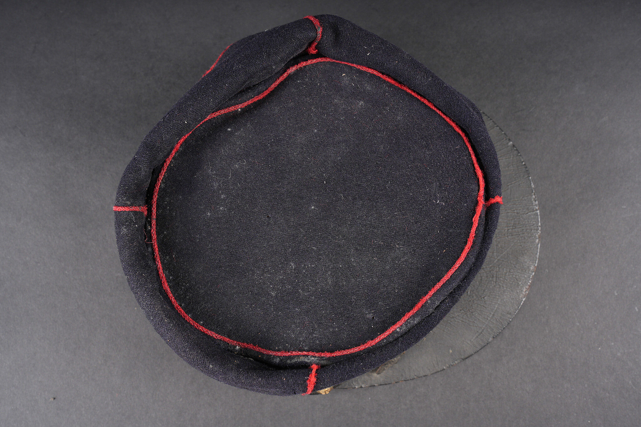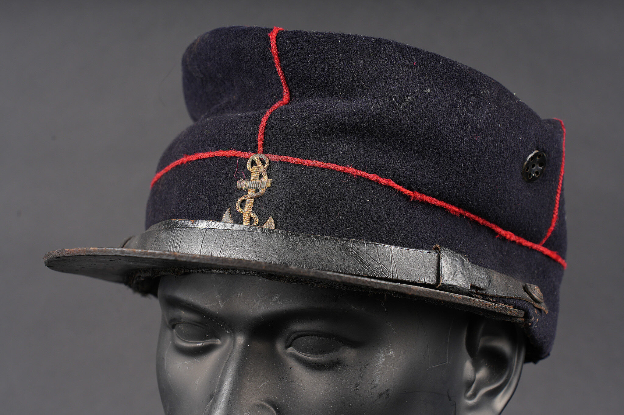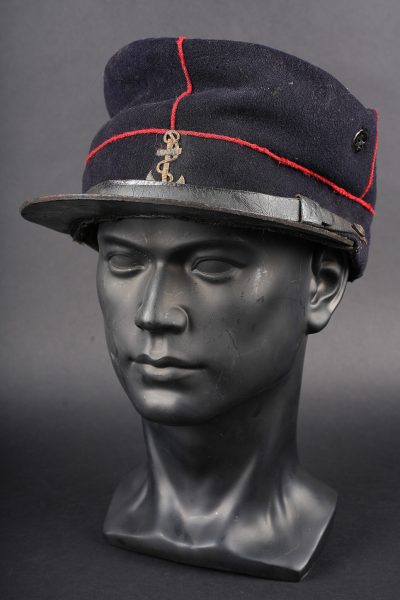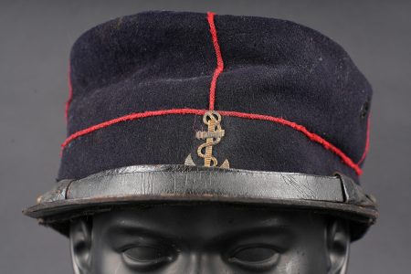 Képi tailleur infanterie coloniale. Képi type 1893 fabriqué en drap bleu foncé, passepoil écarlate, ancre de marine en laiton rapportée. Fausse jugulaire en cuir noir retenue par deux boutons aux armes de la coloniale. Visière en cuir recousue à sa jonction avec une basane en cuir haute. Fond en cuir possédant un tampon indiquant l’année 1902. Képi, tailor-made, Colonial Infantry. Pattern 1893 in dark blue cloth with scarlet piping and separately applied brass flaming-grenade/anchor badge. Black leather false chinstrap secured by two Colonial pattern buttons. Leather peak re-stitched at the junction with a high leather sweatband. Leather top with maker’s stamp dated 1902.