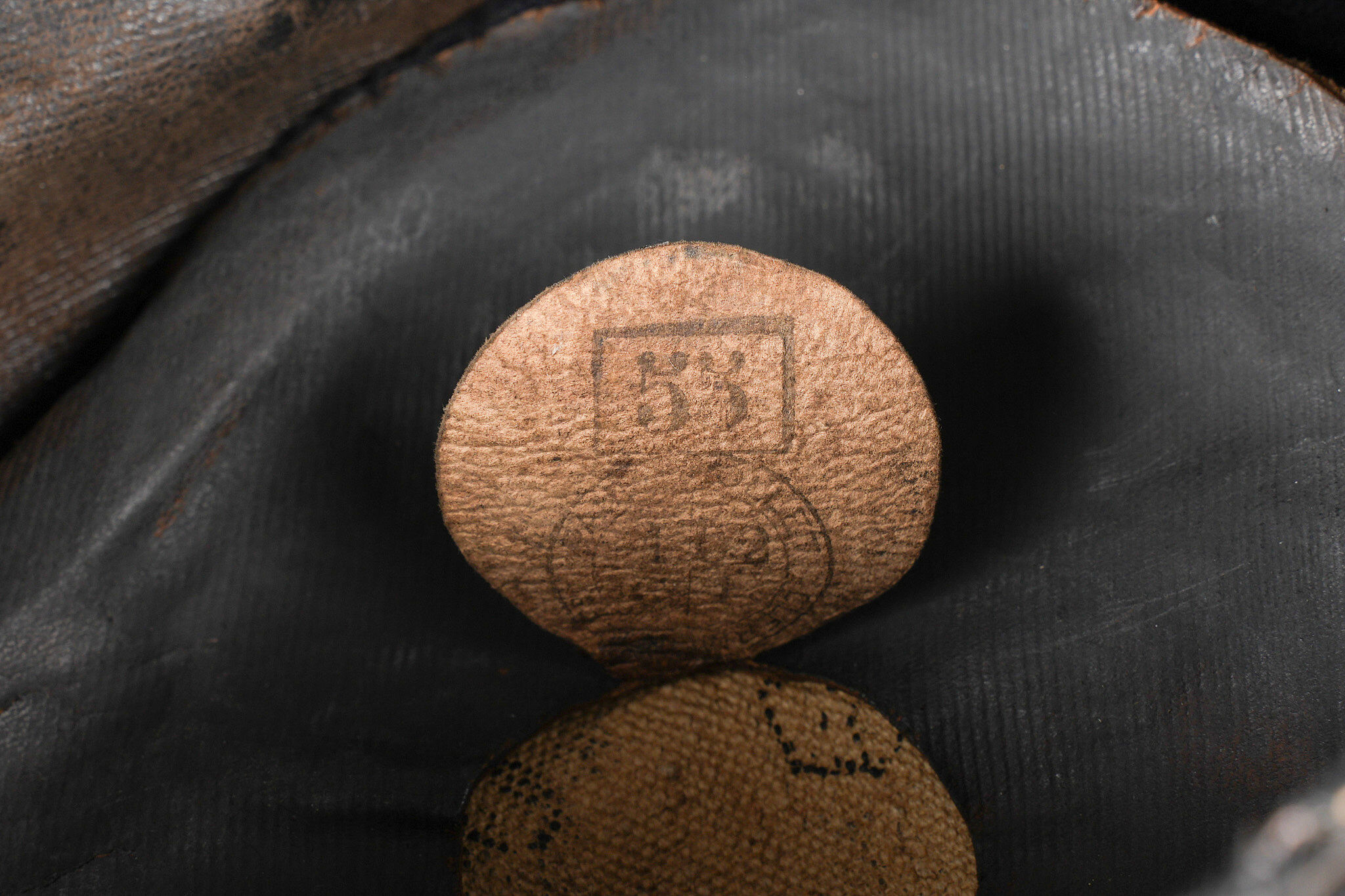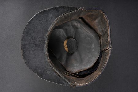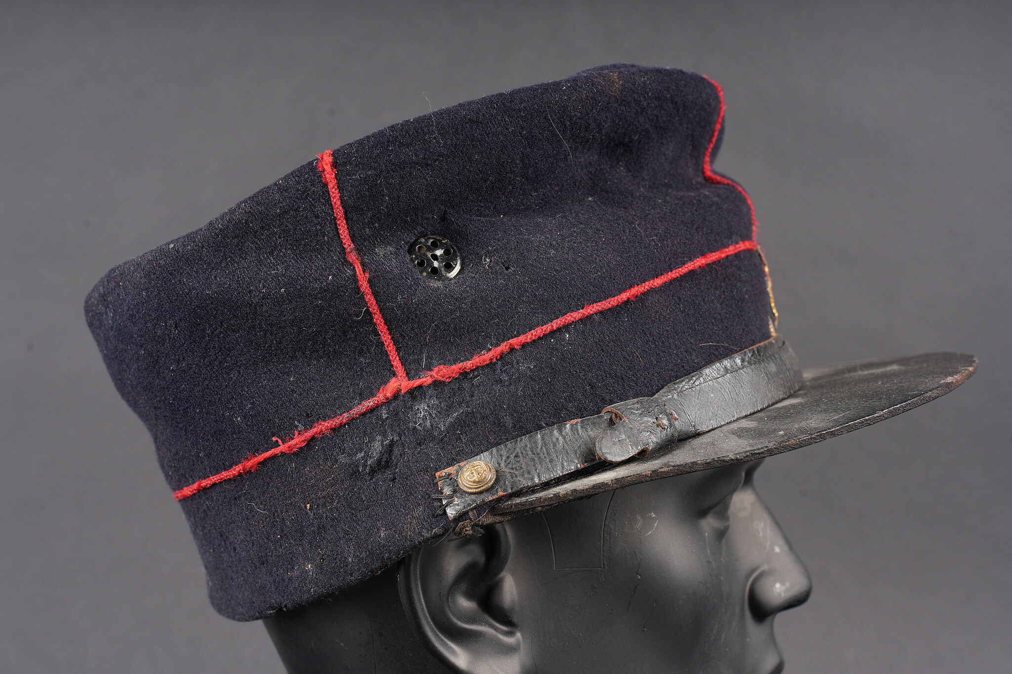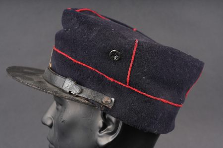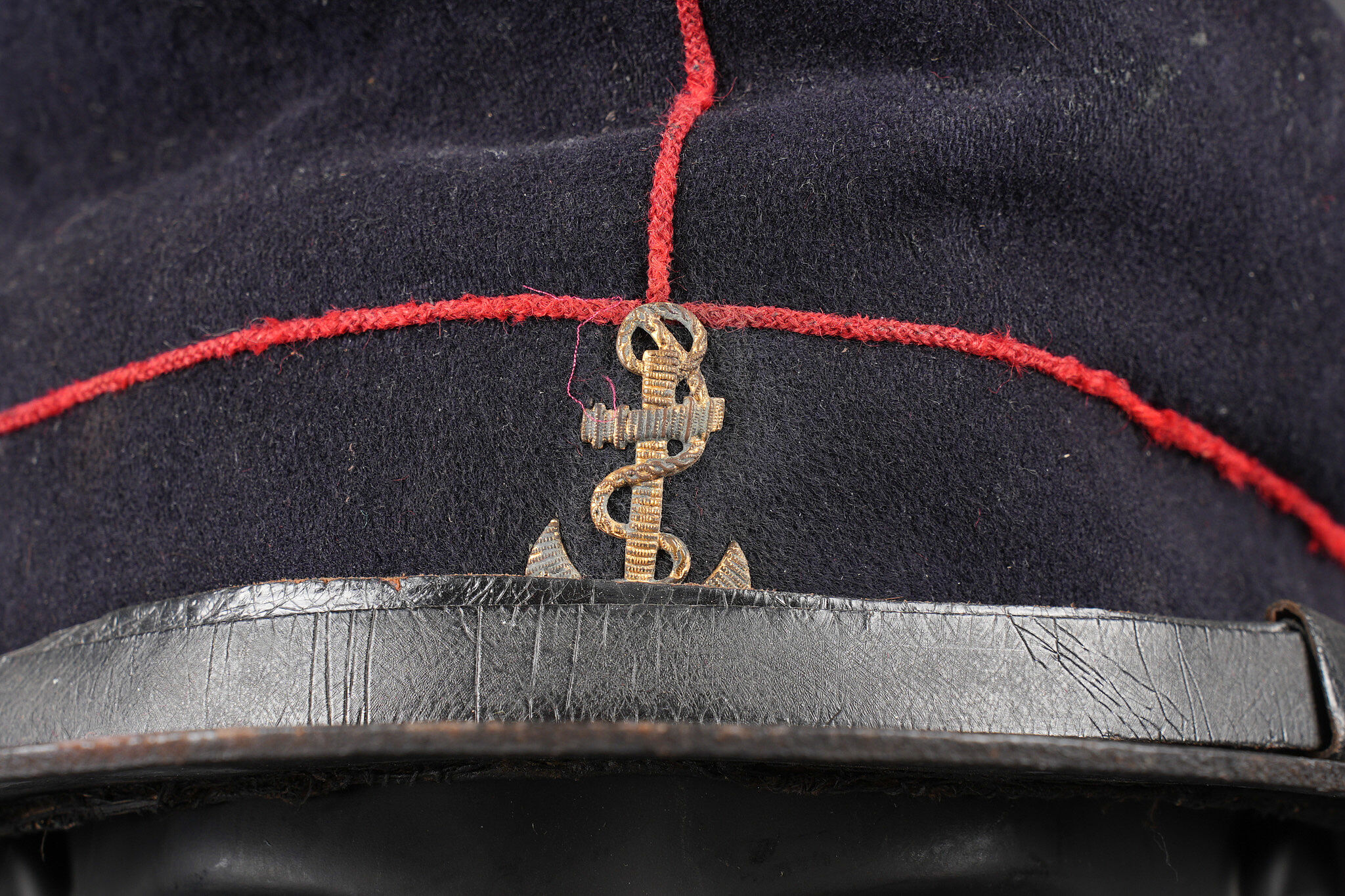 Képi tailleur infanterie coloniale. Képi type 1893 fabriqué en drap bleu foncé, passepoil écarlate, ancre de marine en laiton rapportée. Fausse jugulaire en cuir noir retenue par deux boutons aux armes de la coloniale. Visière en cuir recousue à sa jonction avec une basane en cuir haute. Fond en cuir possédant un tampon indiquant l’année 1902. Képi, tailor-made, Colonial Infantry. Pattern 1893 in dark blue cloth with scarlet piping and separately applied brass flaming-grenade/anchor badge. Black leather false chinstrap secured by two Colonial pattern buttons. Leather peak re-stitched at the junction with a high leather sweatband. Leather top with maker’s stamp dated 1902.