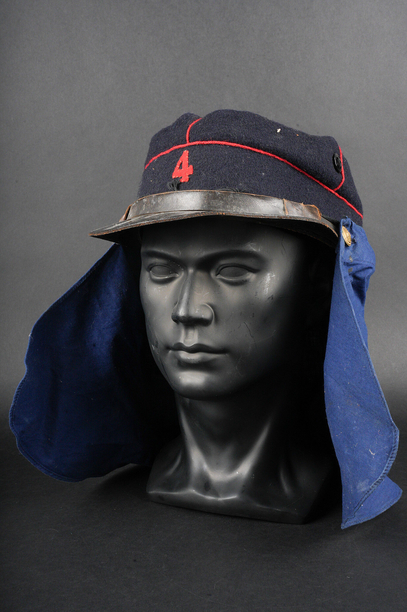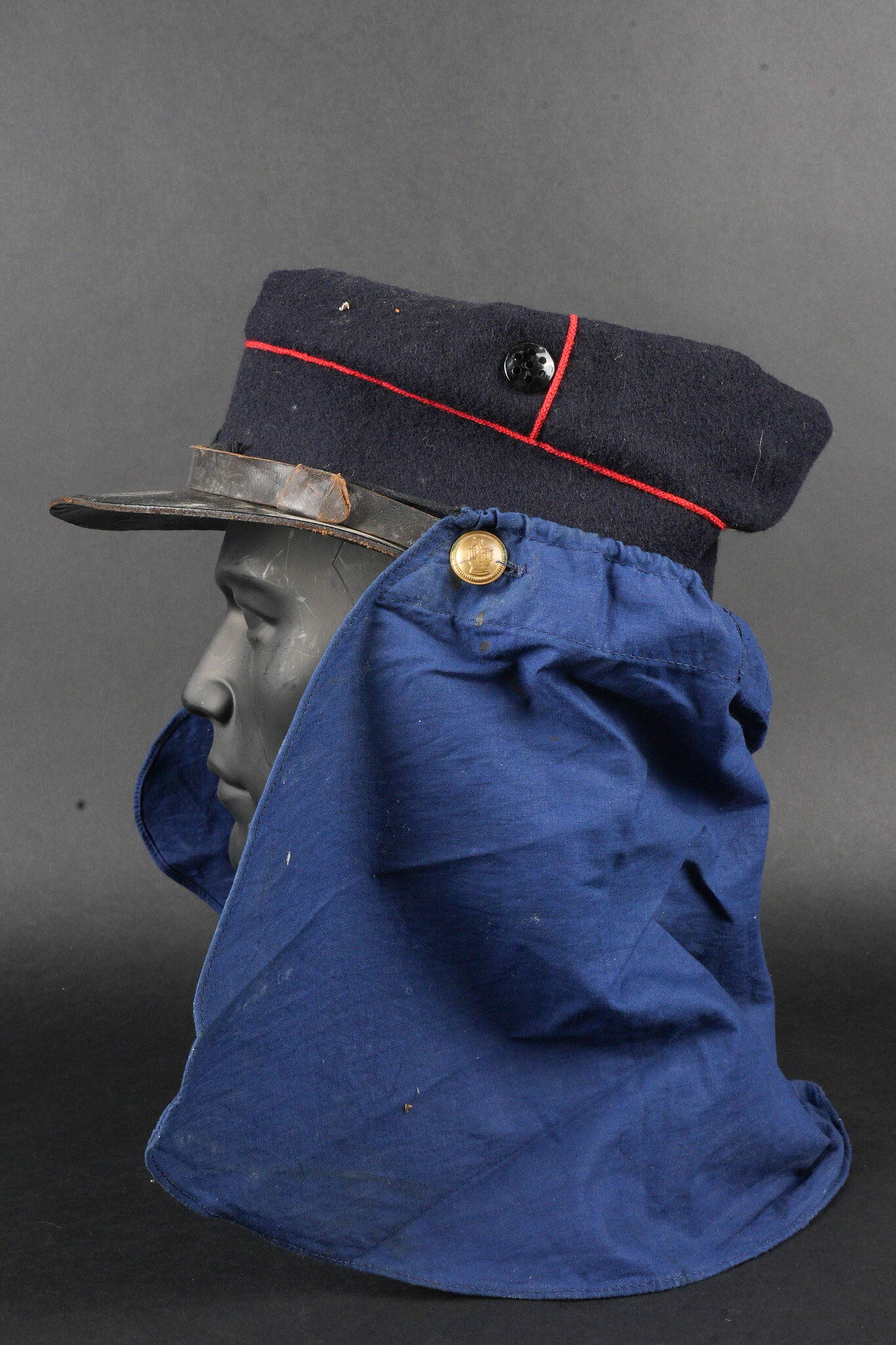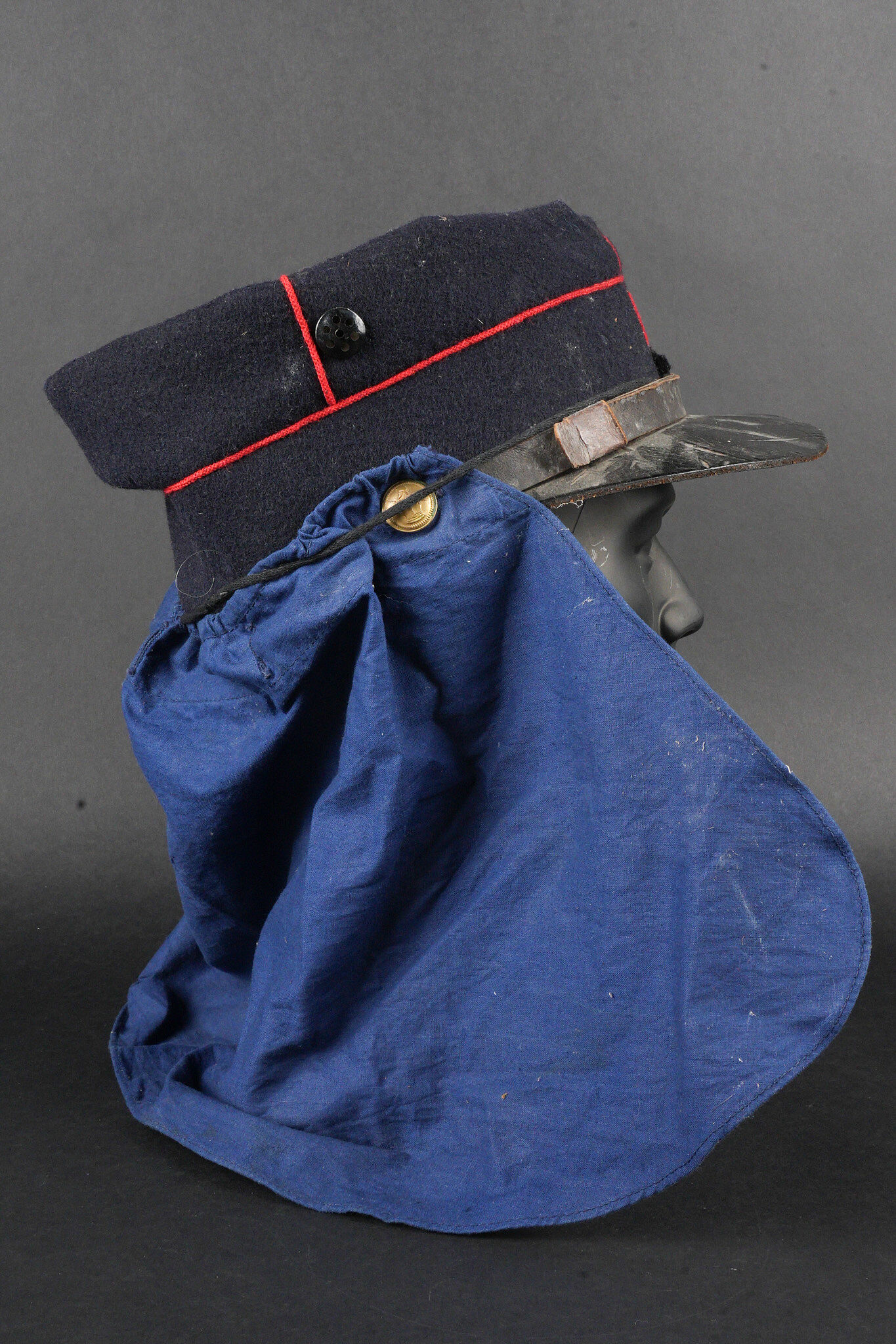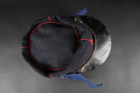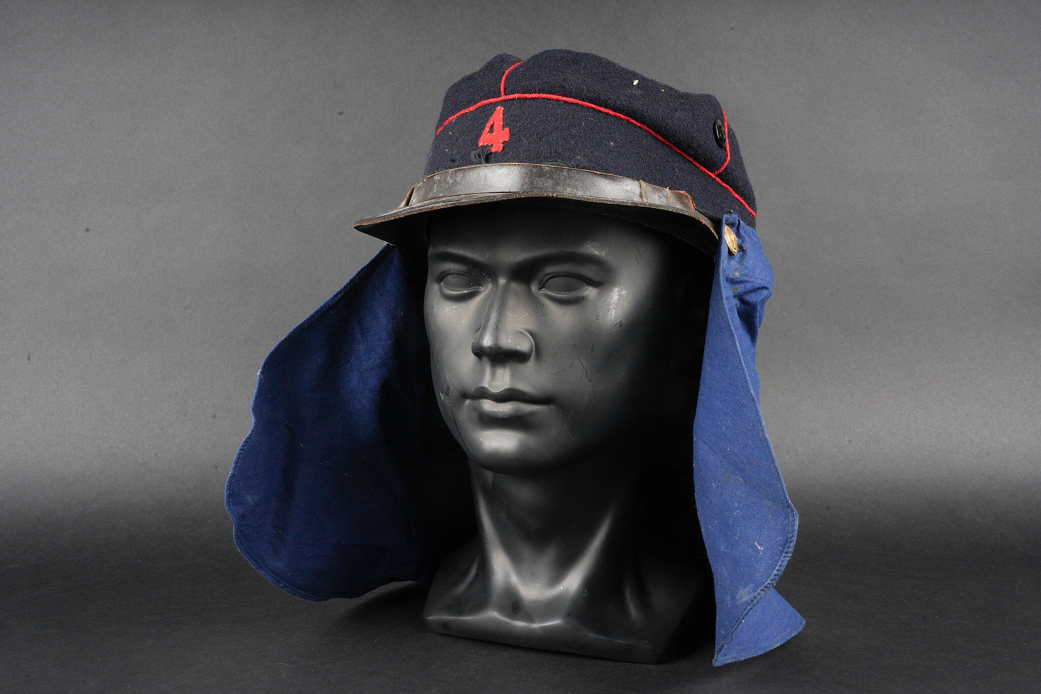 Képi type 1884 génie. Képi de fabrication tailleur type 1884, en drap bleu foncé avec passepoil écarlate, œillets d’aération en peinture. Jugulaire du type troupe, retenues par deux boutons à l’arme du génie, visière en cuir vernis. Chiffre 4 rapporté en drap garance, bandeau de cuir noir et doublure en satinette noire. Couvre nuque en toile bleue possédant cinq boutonnières et un cordon de serrage. Engineer kepi type 1884. Tailor-made dark blue cloth with scarlet piping and painted ventilation eyelets. Other ranks chinstrap secured by two engineer buttons. Black patent leather visor. Number 4 applied in garance cloth. Black leather sweatband and black satinette lining. Blue canvas neck curtain with five buttonholes and a drawstring.