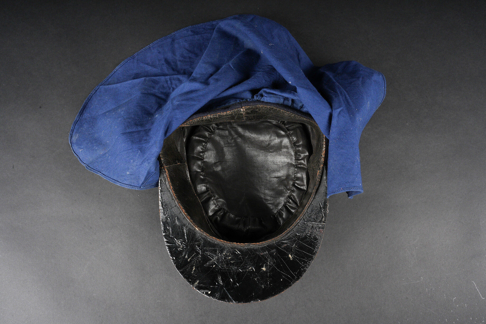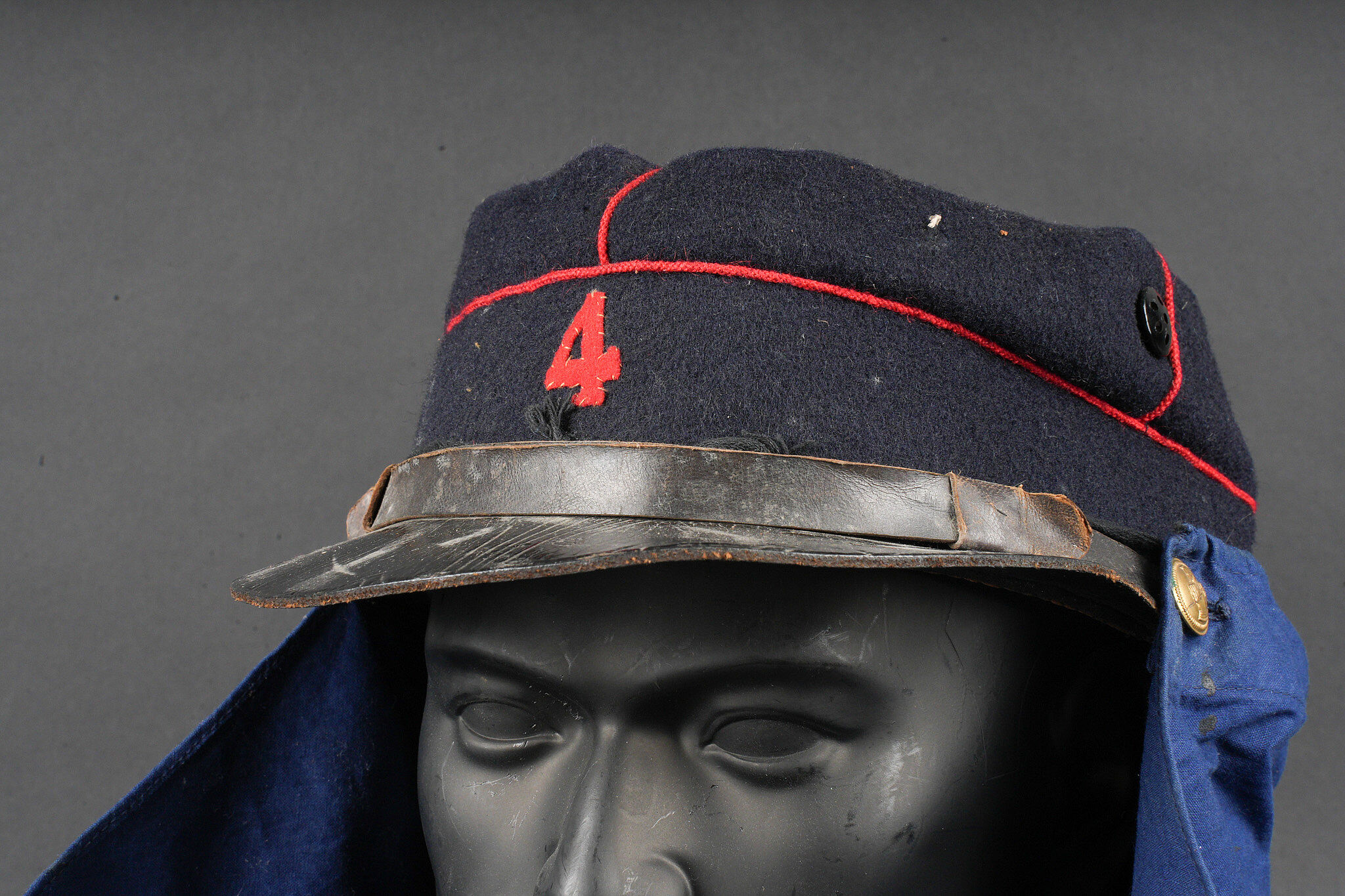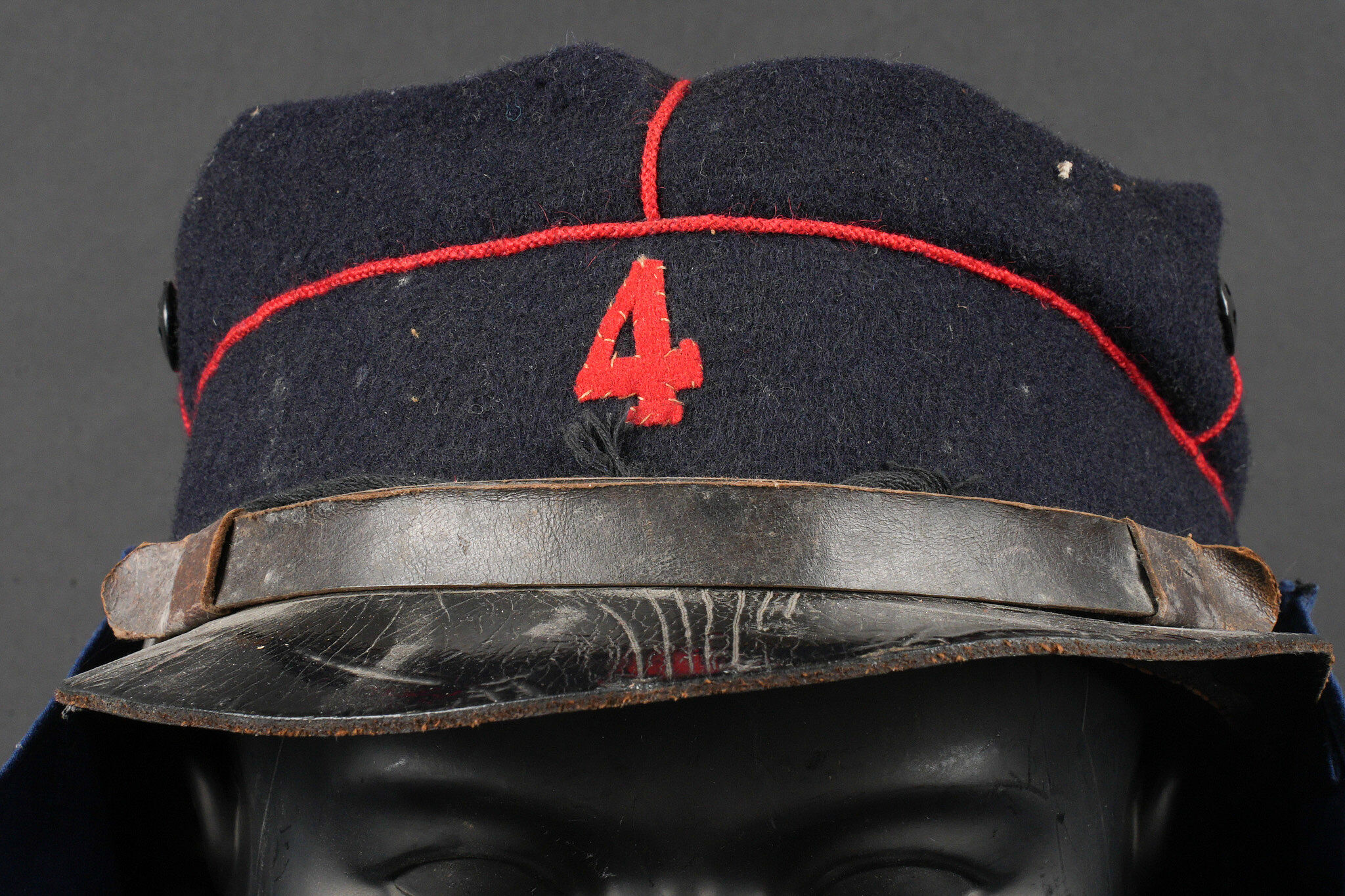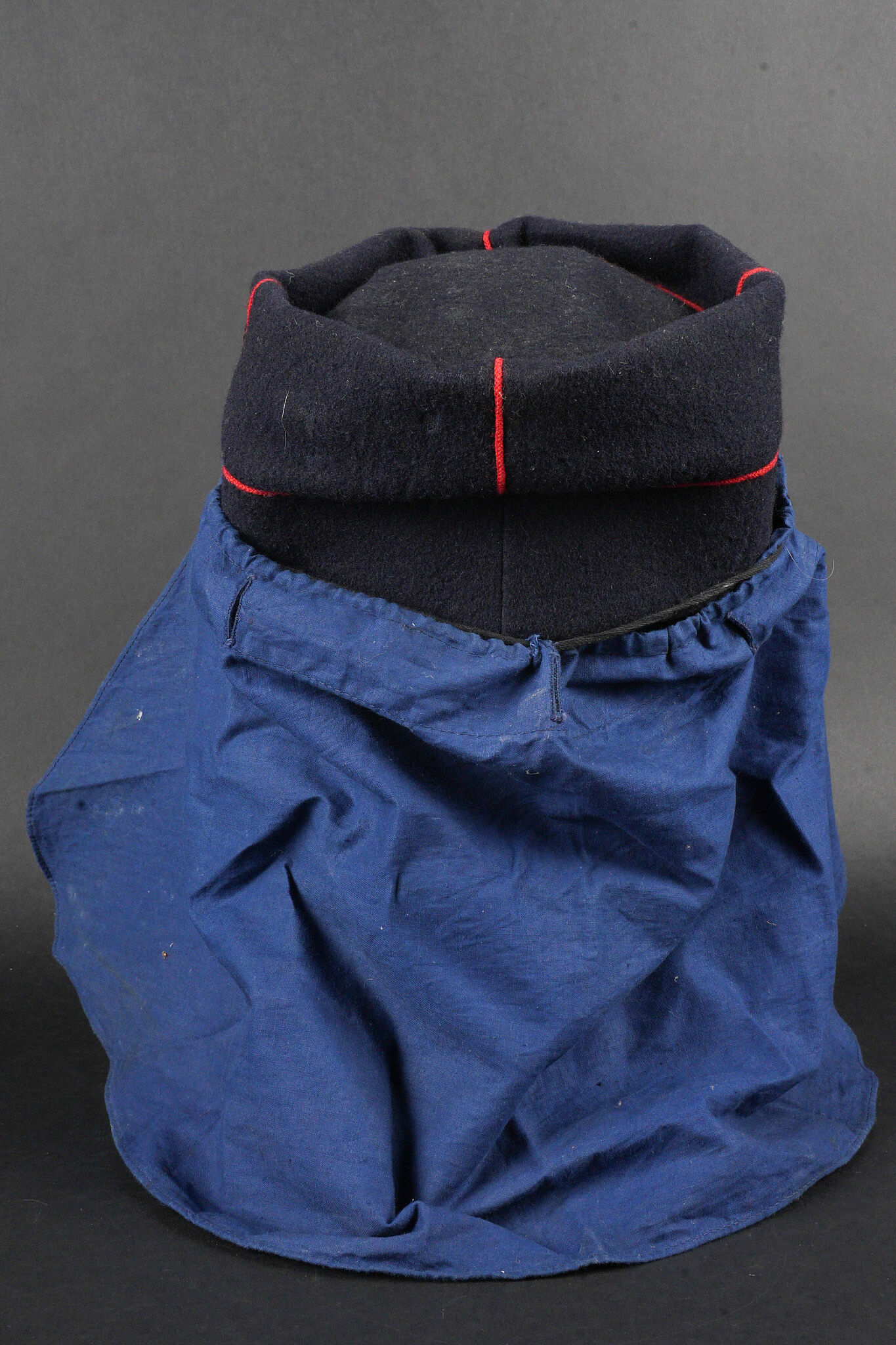 Képi type 1884 génie. Képi de fabrication tailleur type 1884, en drap bleu foncé avec passepoil écarlate, œillets d’aération en peinture. Jugulaire du type troupe, retenues par deux boutons à l’arme du génie, visière en cuir vernis. Chiffre 4 rapporté en drap garance, bandeau de cuir noir et doublure en satinette noire. Couvre nuque en toile bleue possédant cinq boutonnières et un cordon de serrage. Engineer kepi type 1884. Tailor-made dark blue cloth with scarlet piping and painted ventilation eyelets. Other ranks chinstrap secured by two engineer buttons. Black patent leather visor. Number 4 applied in garance cloth. Black leather sweatband and black satinette lining. Blue canvas neck curtain with five buttonholes and a drawstring.