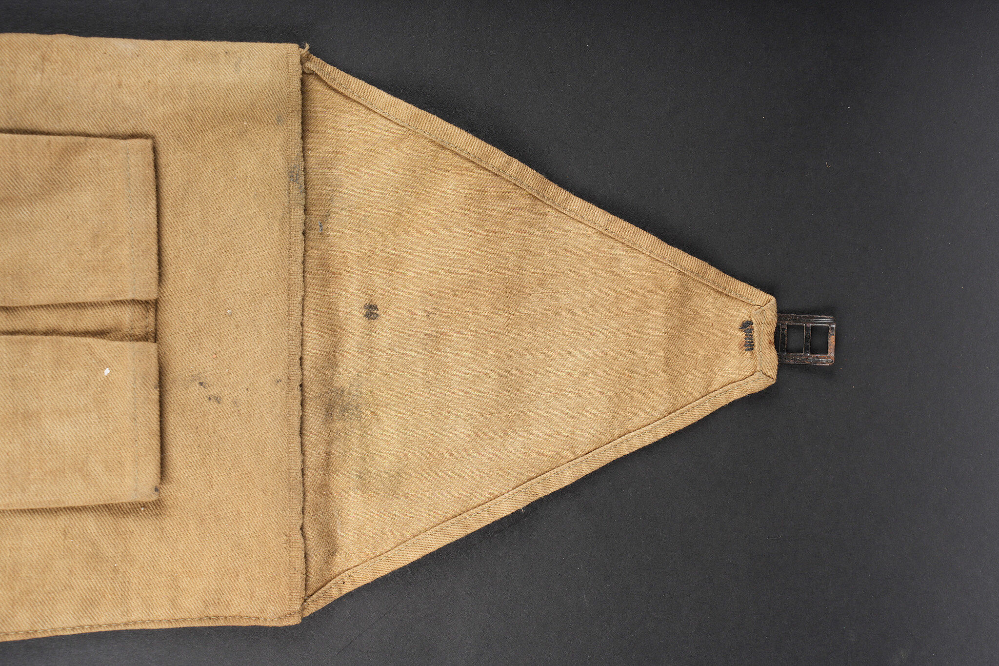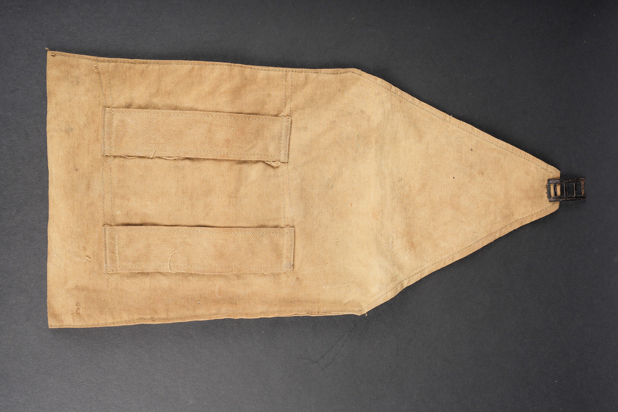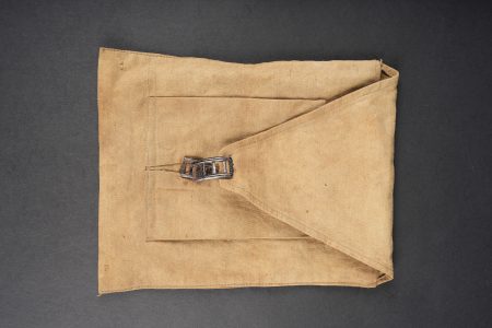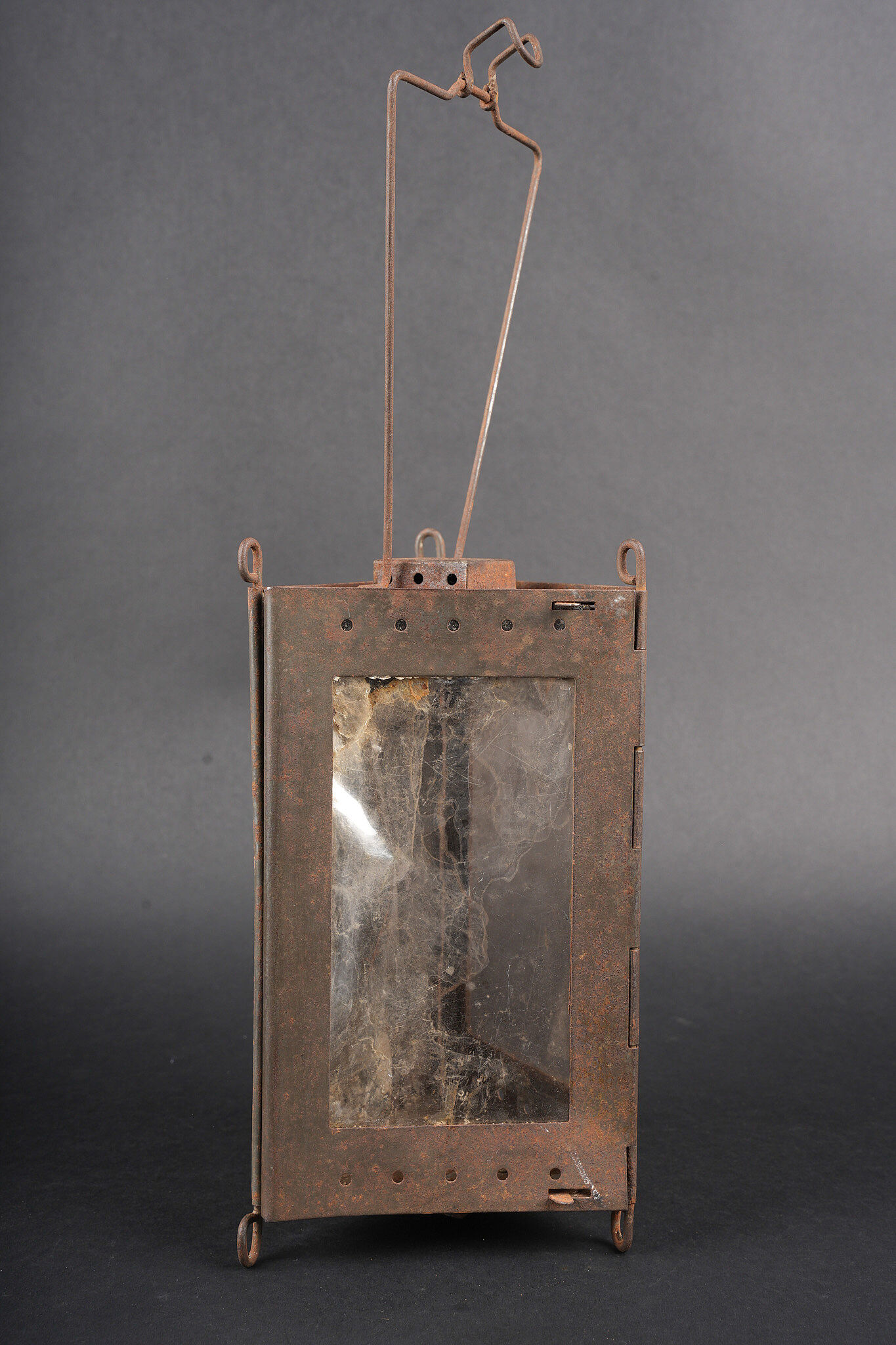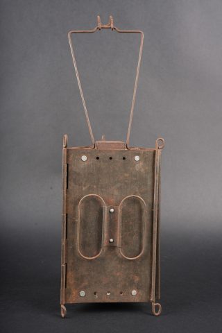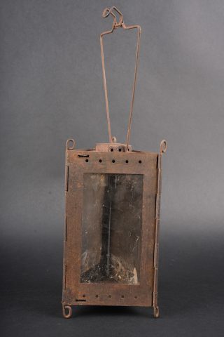 Lanterne Montjardet. Lanterne pliante en métal, complète avec ses deux micas d’origine. Un petit crochet détérioré. Dans sa housse en toile cachou, deux passants à l’arrière, deux compartiments pour les bougies. Montjardet lantern. Folding metal lantern complete with its two original mica windows. One small damaged hook. In its cachou canvas cover with two rear belt loops and two candle compartments.