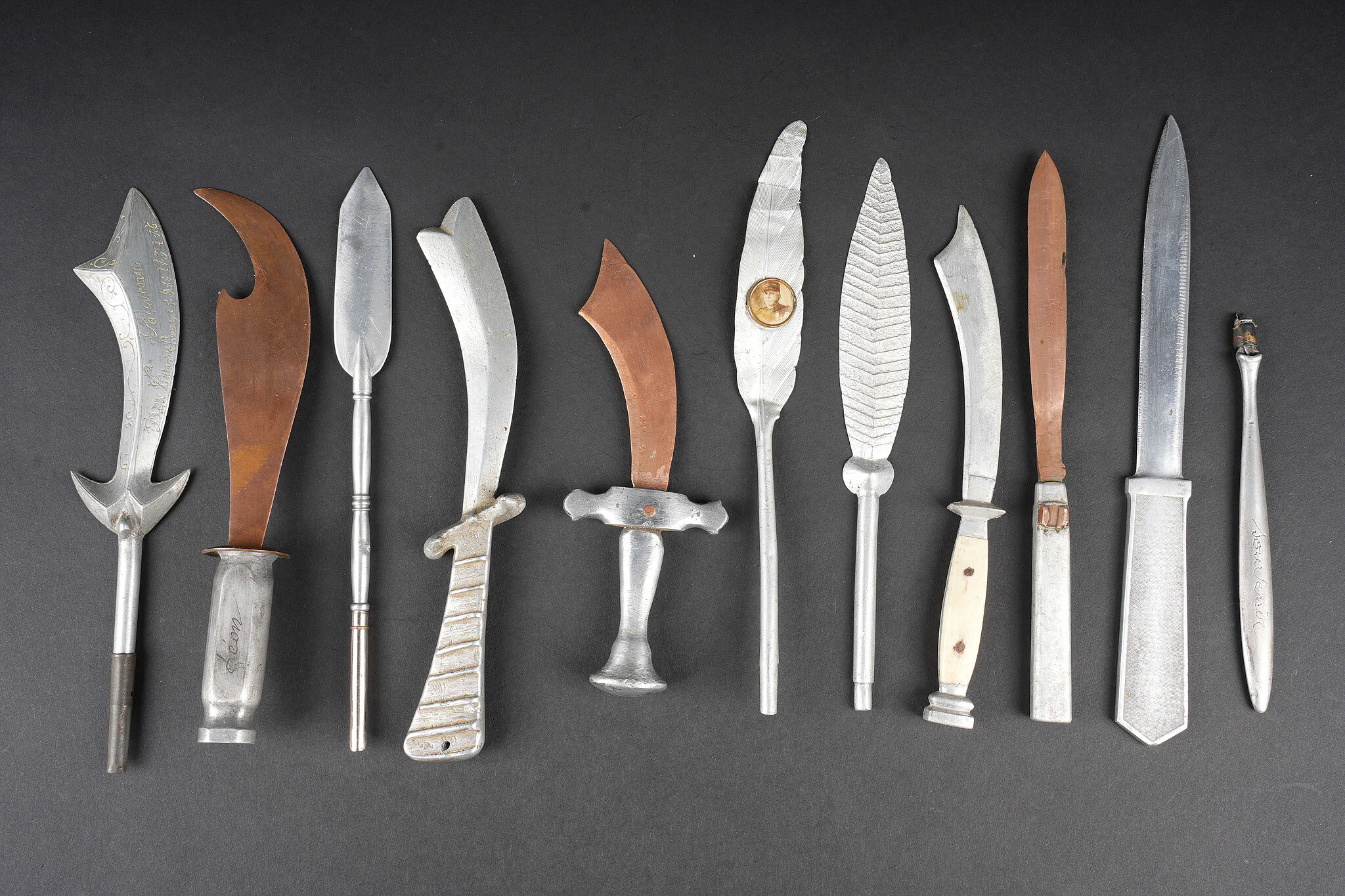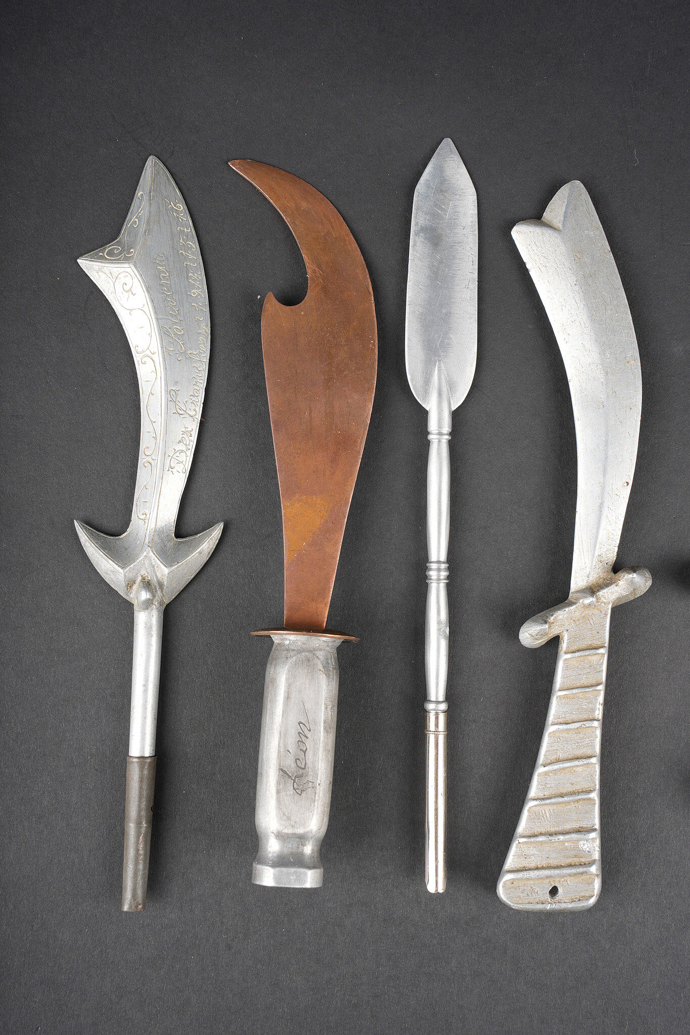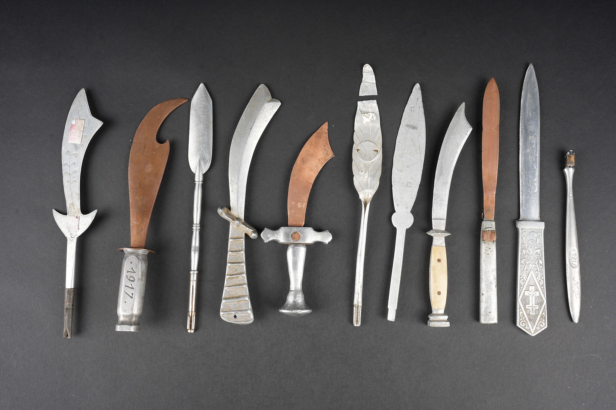 Lot artisanat de tranchées coupes papier. Comprenant 10 coupes papier dont certains gravés et portant les mentions Tranchées D’Autrèche, Léon 1917, Souvenir 1917, un TOA après guerre, Souvenir des tranchées 14, 15,16. Lot of trench art paper knives. Comprising ten examples some engraved Tranchees d Autreche Leon 1917 Souvenir 1917 one post war TOA Souvenir des tranchees 14 15 16.
