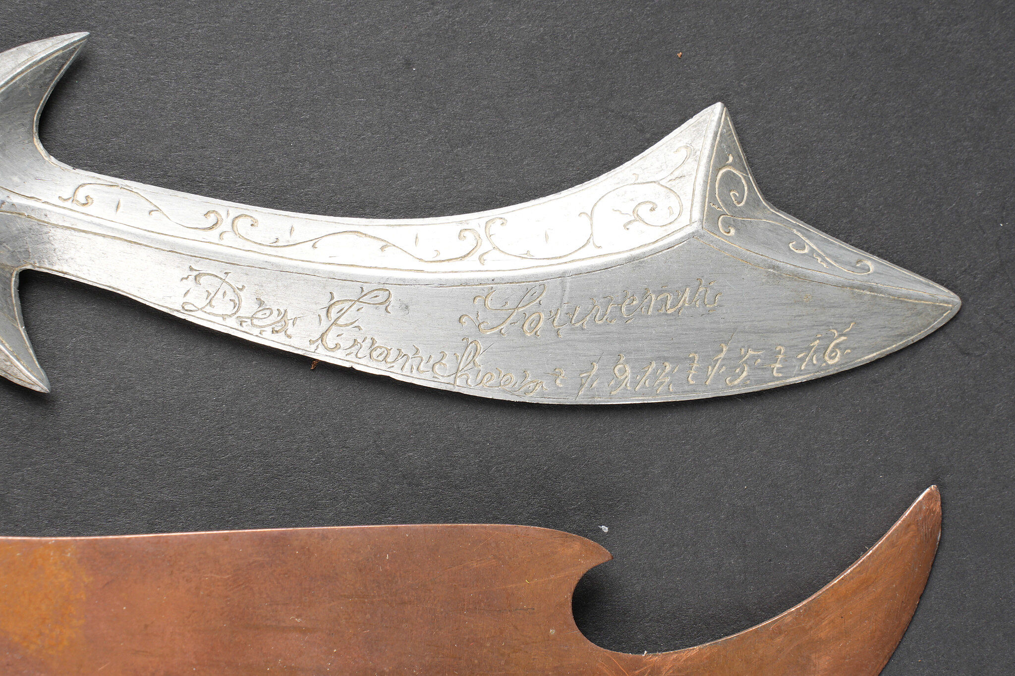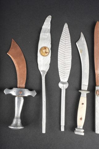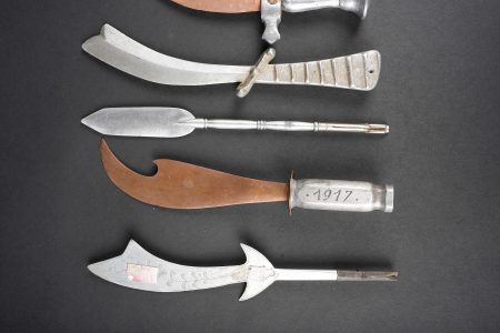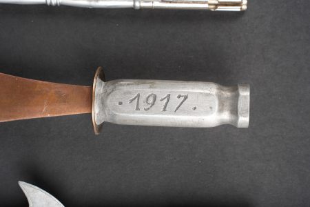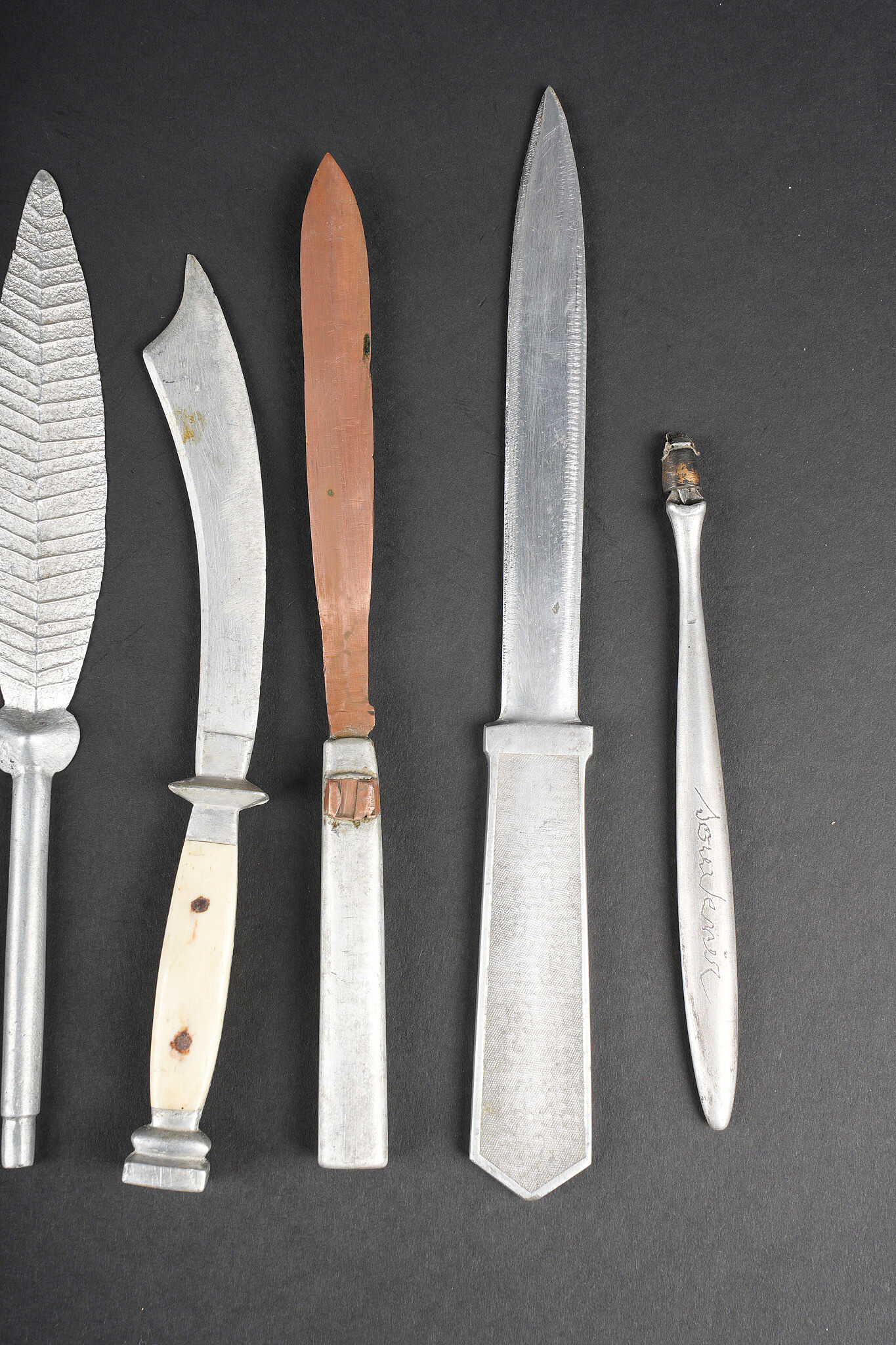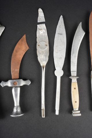 Lot artisanat de tranchées coupes papier. Comprenant 10 coupes papier dont certains gravés et portant les mentions Tranchées D’Autrèche, Léon 1917, Souvenir 1917, un TOA après guerre, Souvenir des tranchées 14, 15,16. Lot of trench art paper knives. Comprising ten examples some engraved Tranchees d Autreche Leon 1917 Souvenir 1917 one post war TOA Souvenir des tranchees 14 15 16.