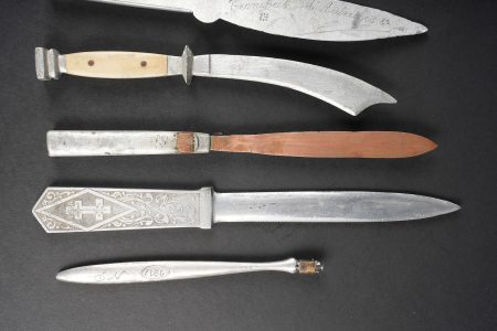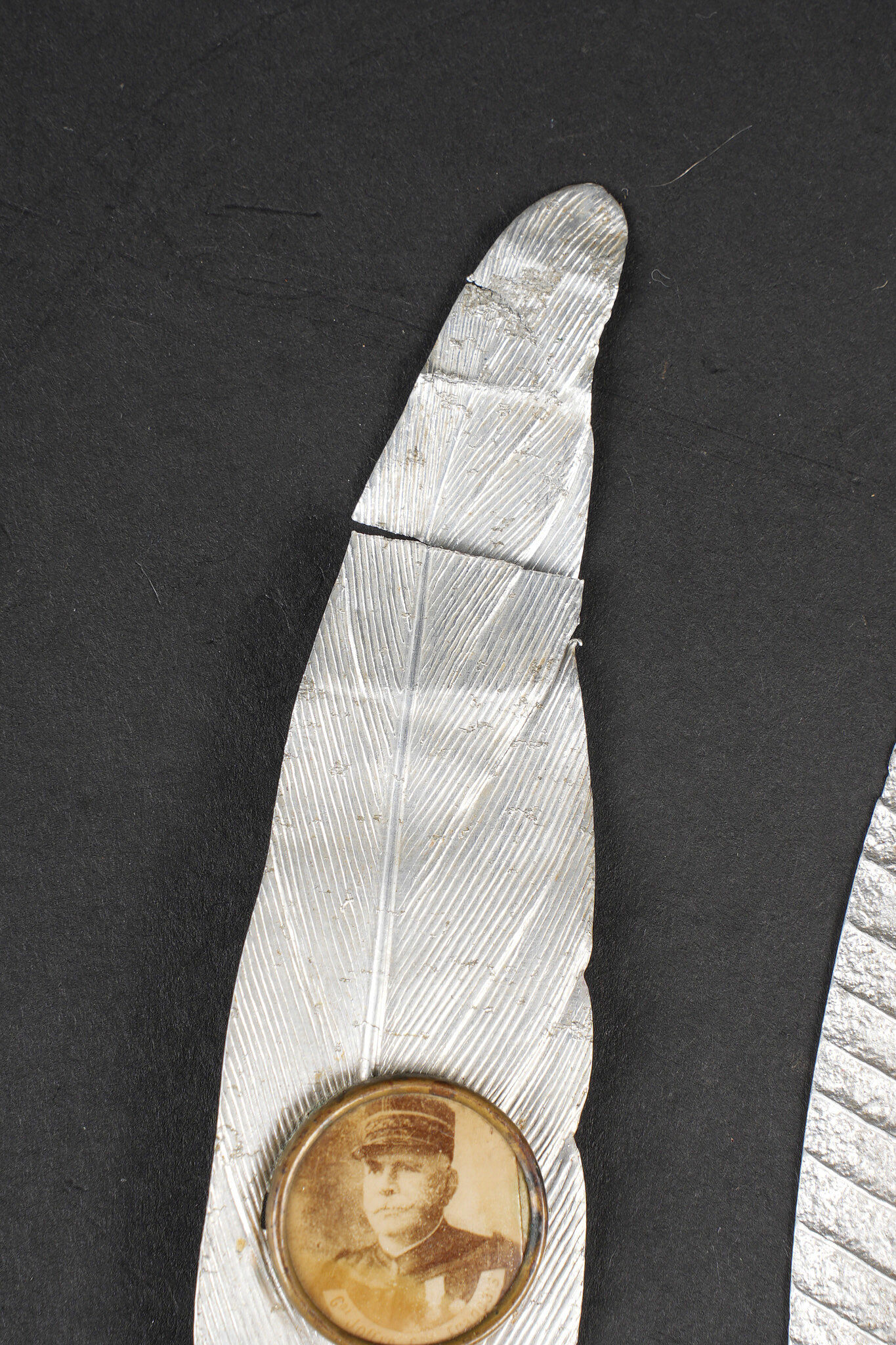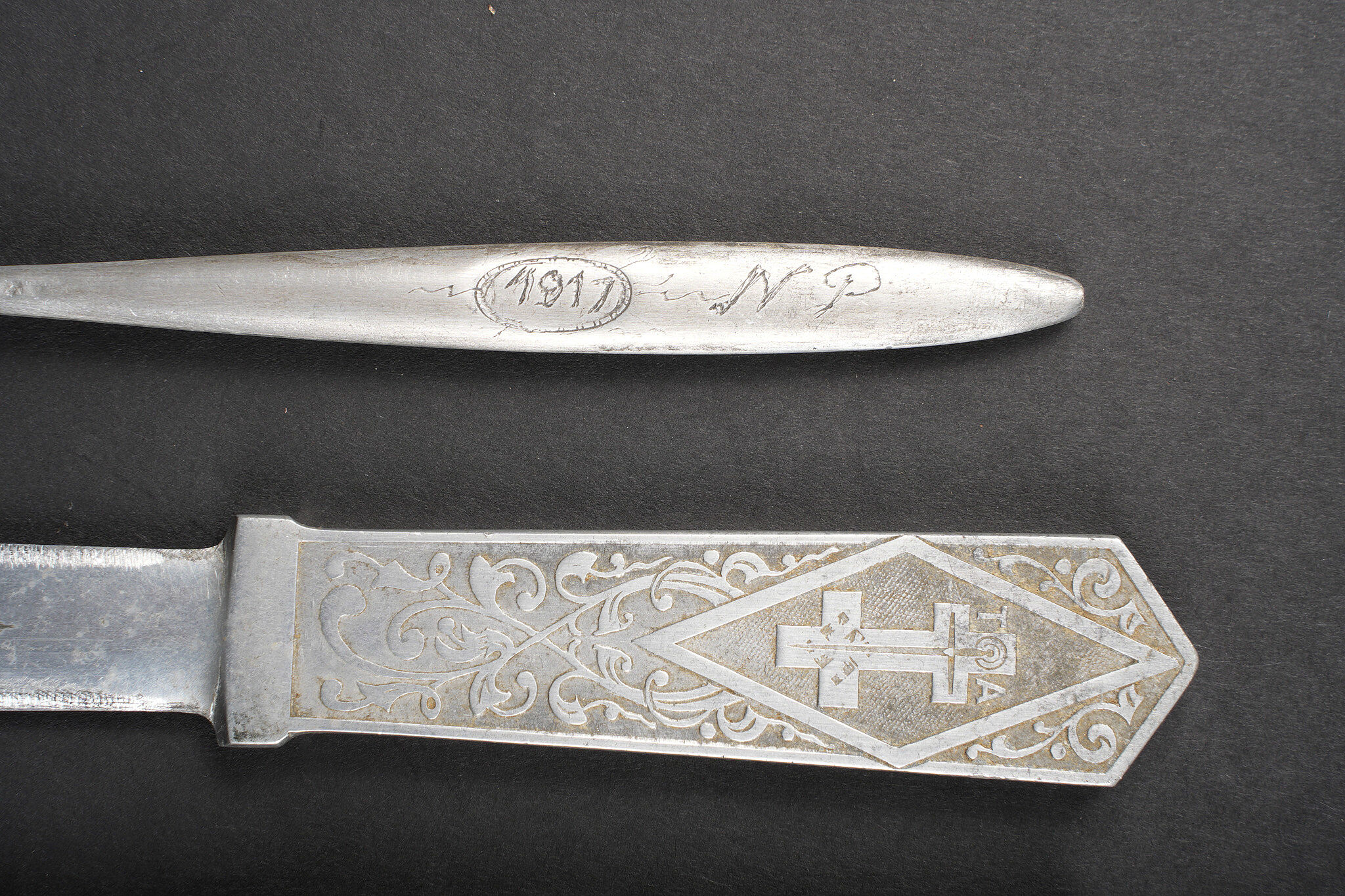 Lot artisanat de tranchées coupes papier. Comprenant 10 coupes papier dont certains gravés et portant les mentions Tranchées D’Autrèche, Léon 1917, Souvenir 1917, un TOA après guerre,... en savoir plus