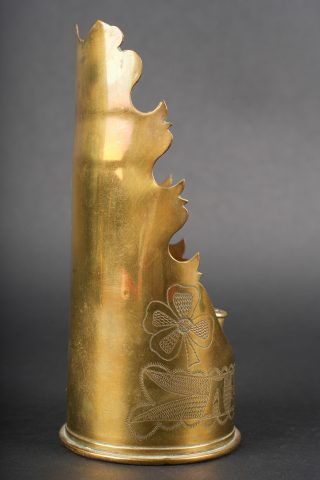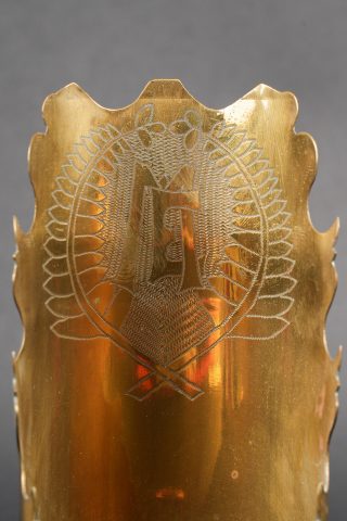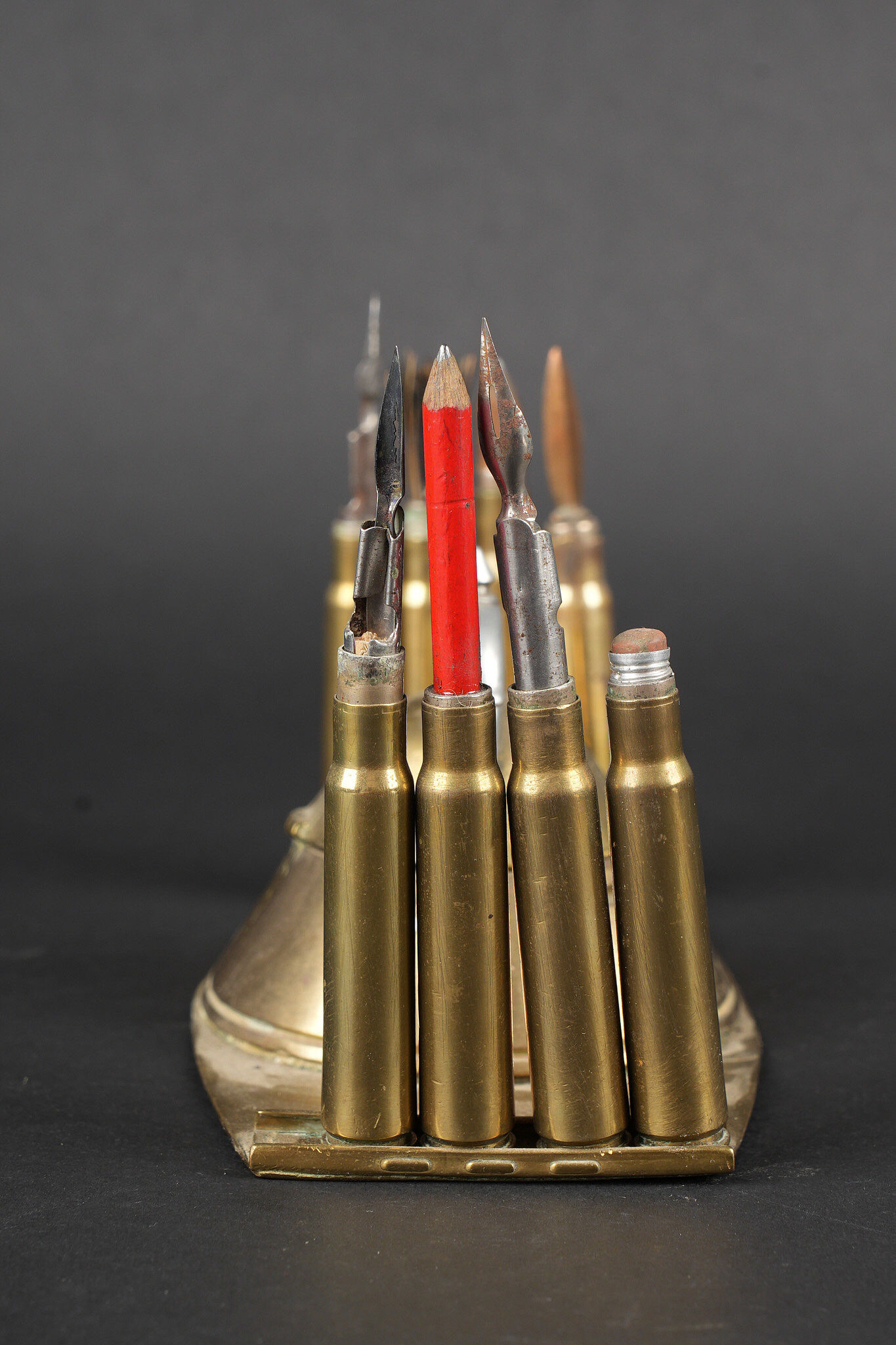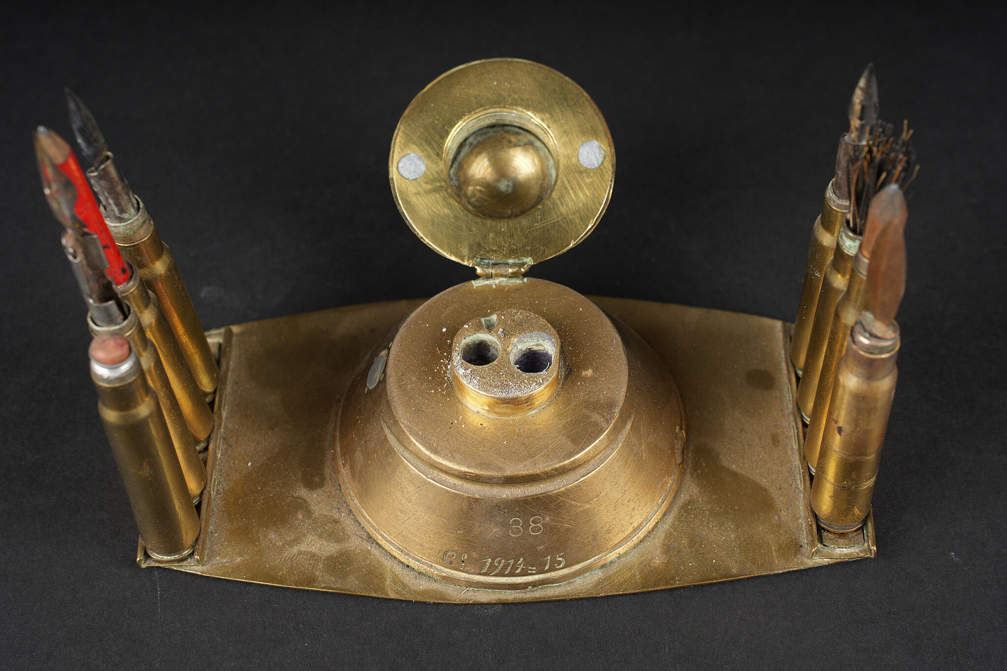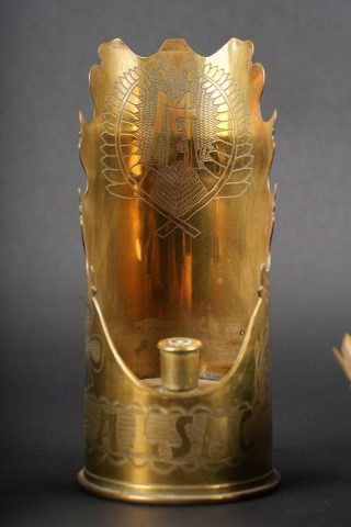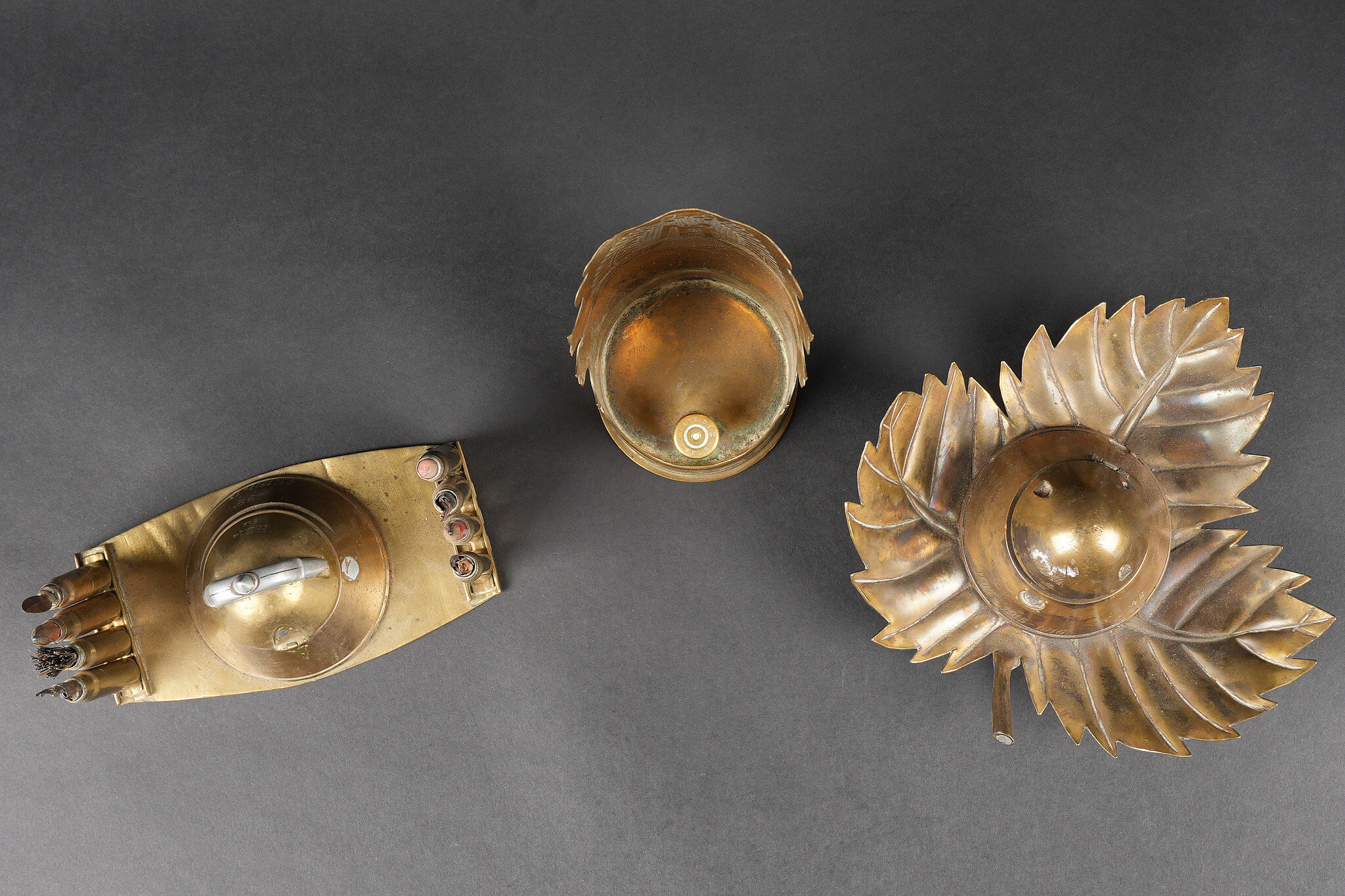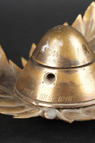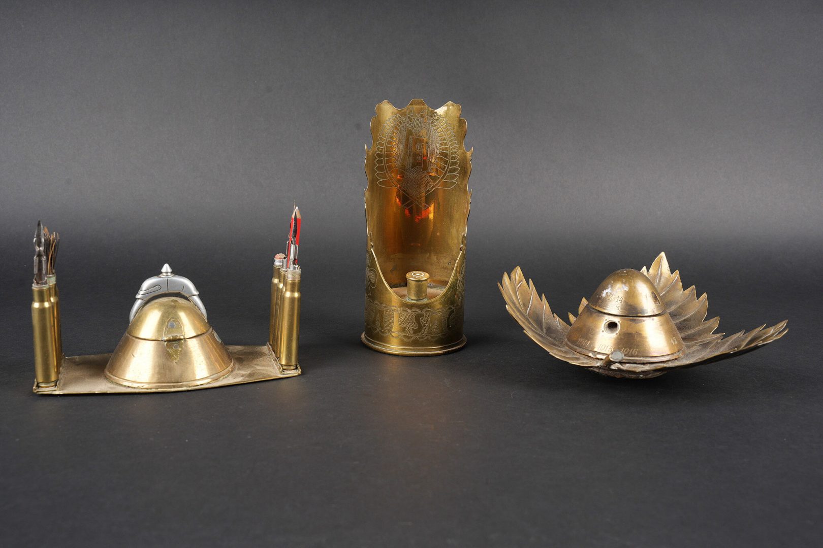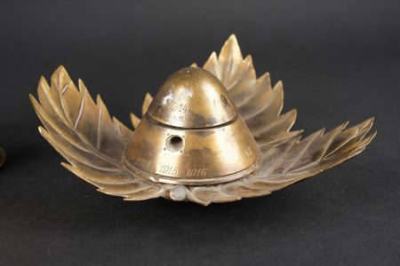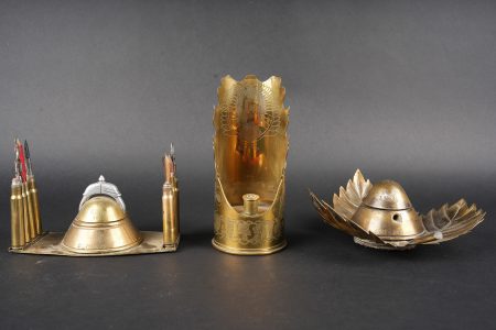 Lot artisanat de tranchées. Comprenant un encrier réalisé à partir d’une ogive avec un casque à pointe de profil en aluminium, de chaque côté on trouve des lames chargeurs de Mauser et les douilles furent transformées en porte plume. Un encrier en forme de feuille d’érable en laiton avec au centre une ogive transformée en encrier. Une douille gravée Alsace 1916 servant également d’encrier. Lot of trench art. Inkwell made from a shell with an aluminium profile Pickelhaube. On each side Mauser charger clips and cartridge cases converted into pen holders. Brass maple leaf shaped inkwell with a shell nose forming the reservoir. Cartridge case engraved Alsace 1916 also converted into an inkwell.