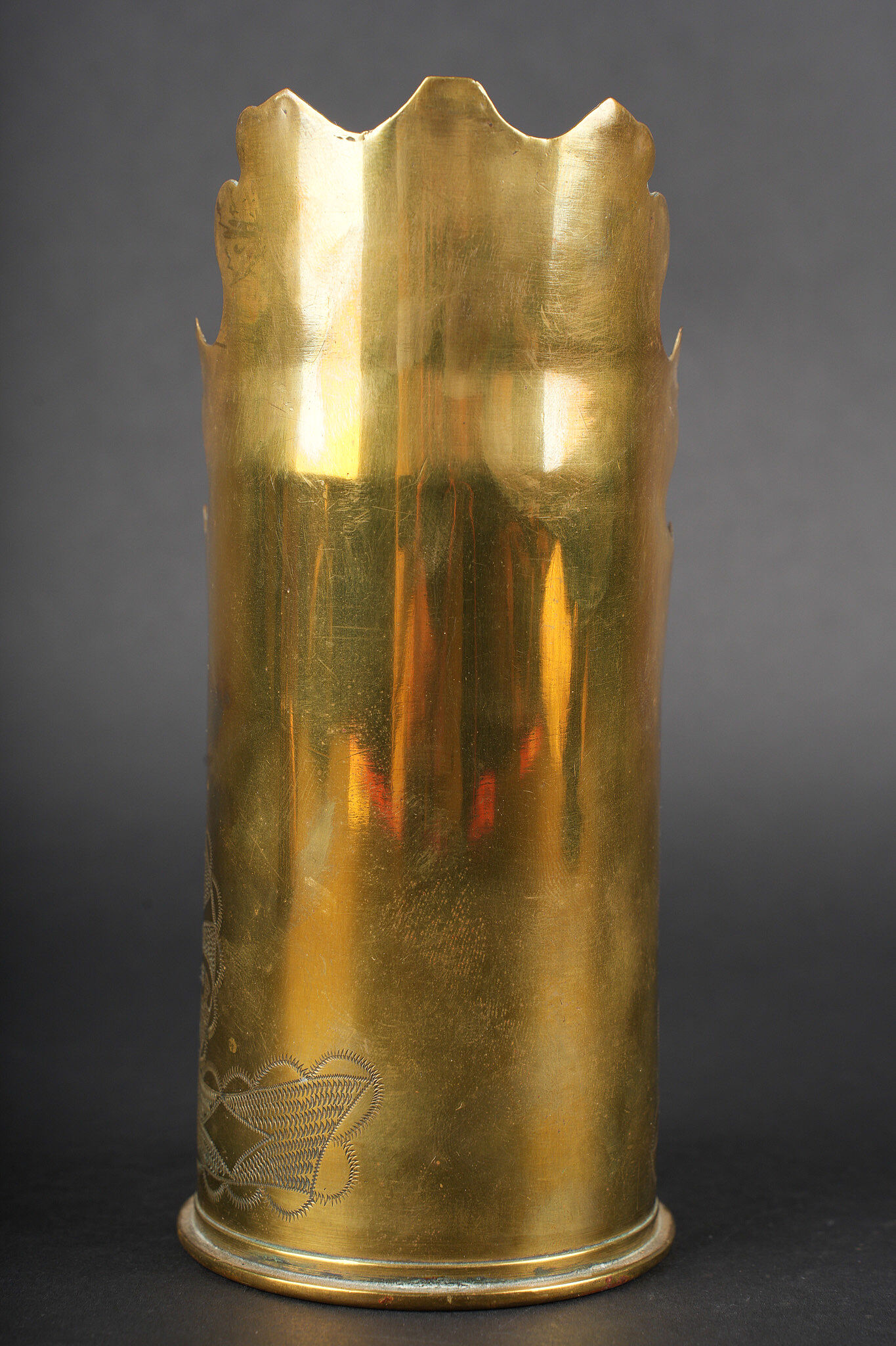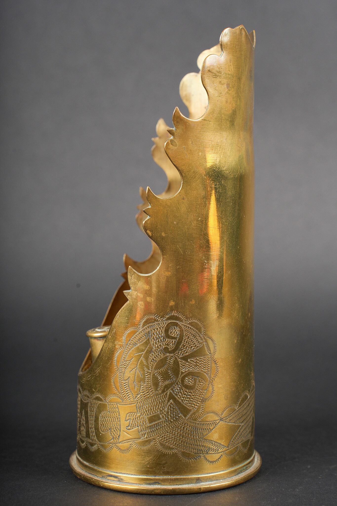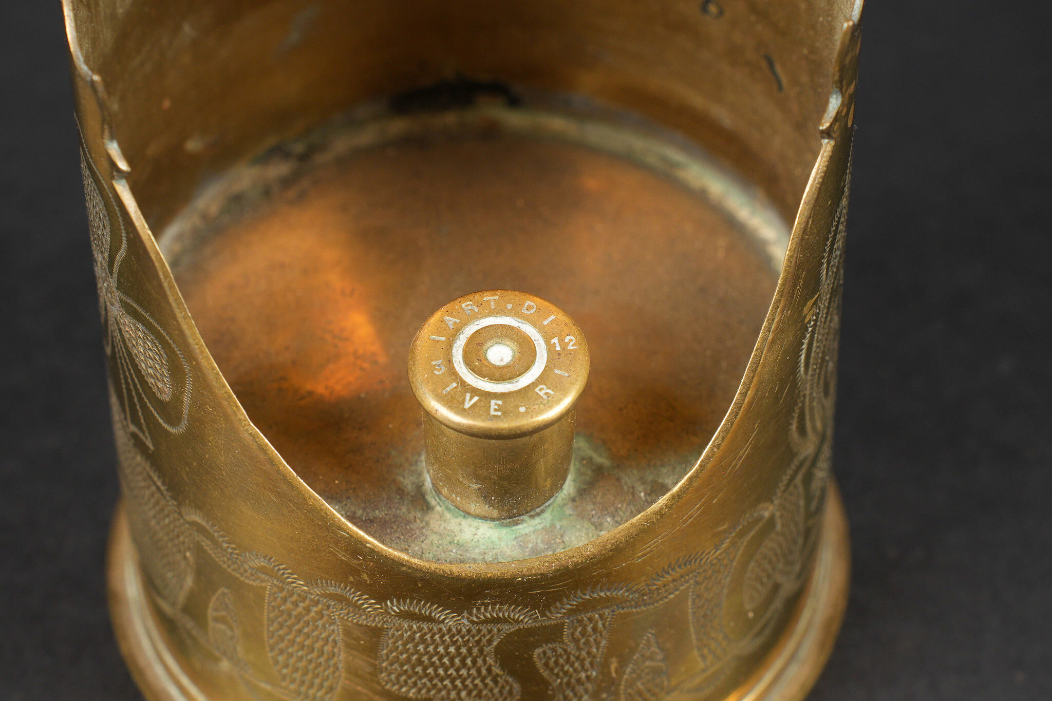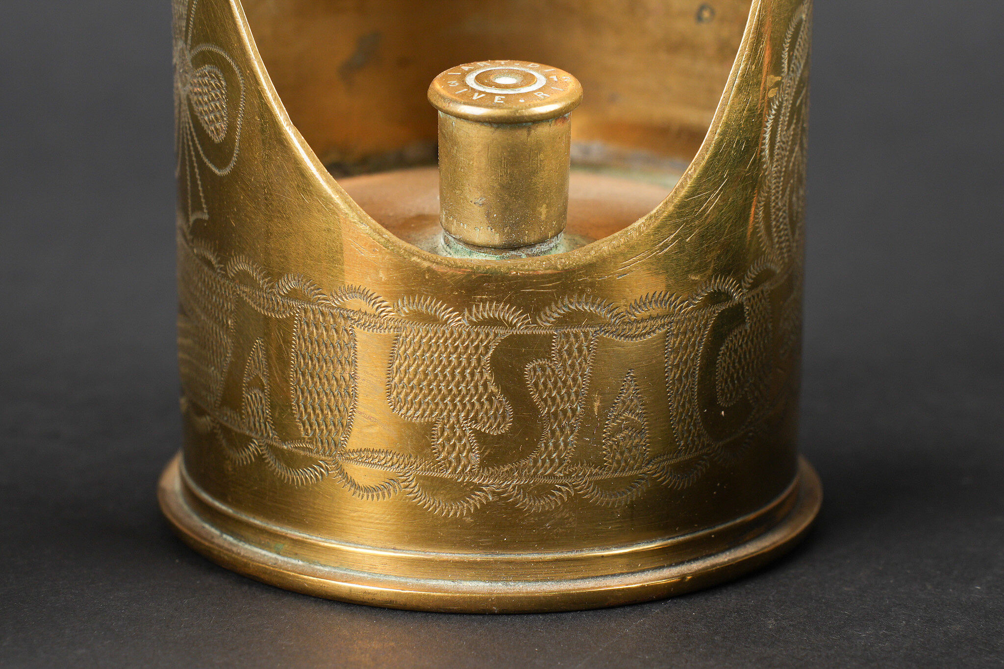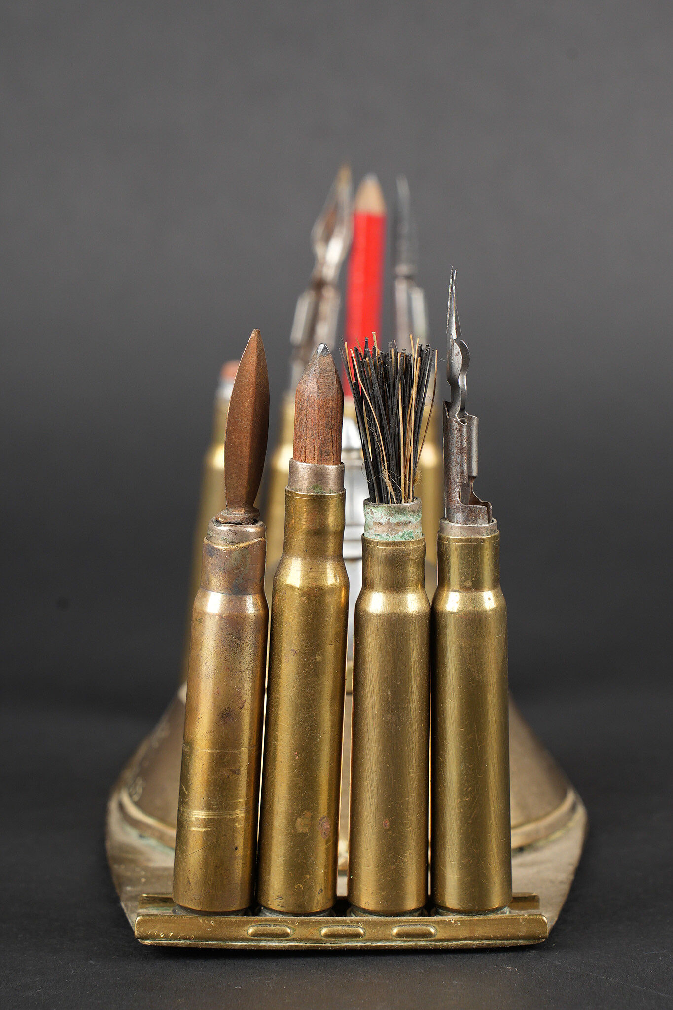 Lot artisanat de tranchées. Comprenant un encrier réalisé à partir d’une ogive avec un casque à pointe de profil en aluminium, de chaque côté on trouve des lames chargeurs de Mauser et les douilles furent transformées en porte plume. Un encrier en forme de feuille d’érable en laiton avec au centre une ogive transformée en encrier. Une douille gravée Alsace 1916 servant également d’encrier. Lot of trench art. Inkwell made from a shell with an aluminium profile Pickelhaube. On each side Mauser charger clips and cartridge cases converted into pen holders. Brass maple leaf shaped inkwell with a shell nose forming the reservoir. Cartridge case engraved Alsace 1916 also converted into an inkwell.