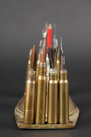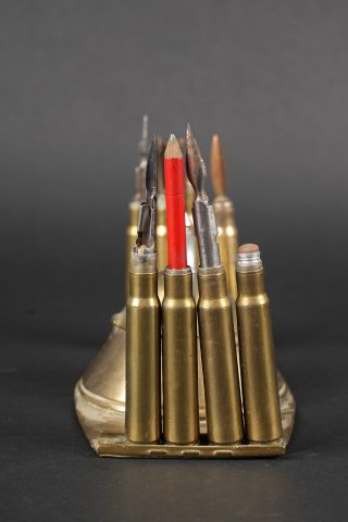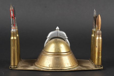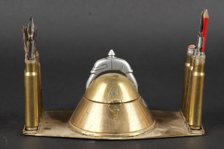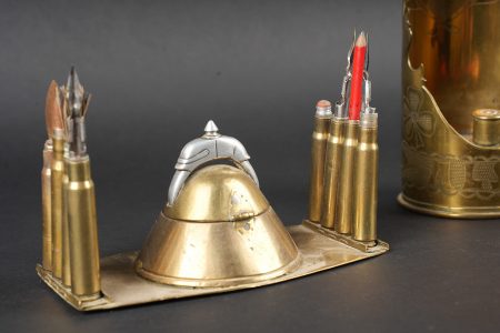 Lot artisanat de tranchées. Comprenant un encrier réalisé à partir d’une ogive avec un casque à pointe de profil en aluminium, de chaque côté on trouve des lames chargeurs de Mauser... en savoir plus