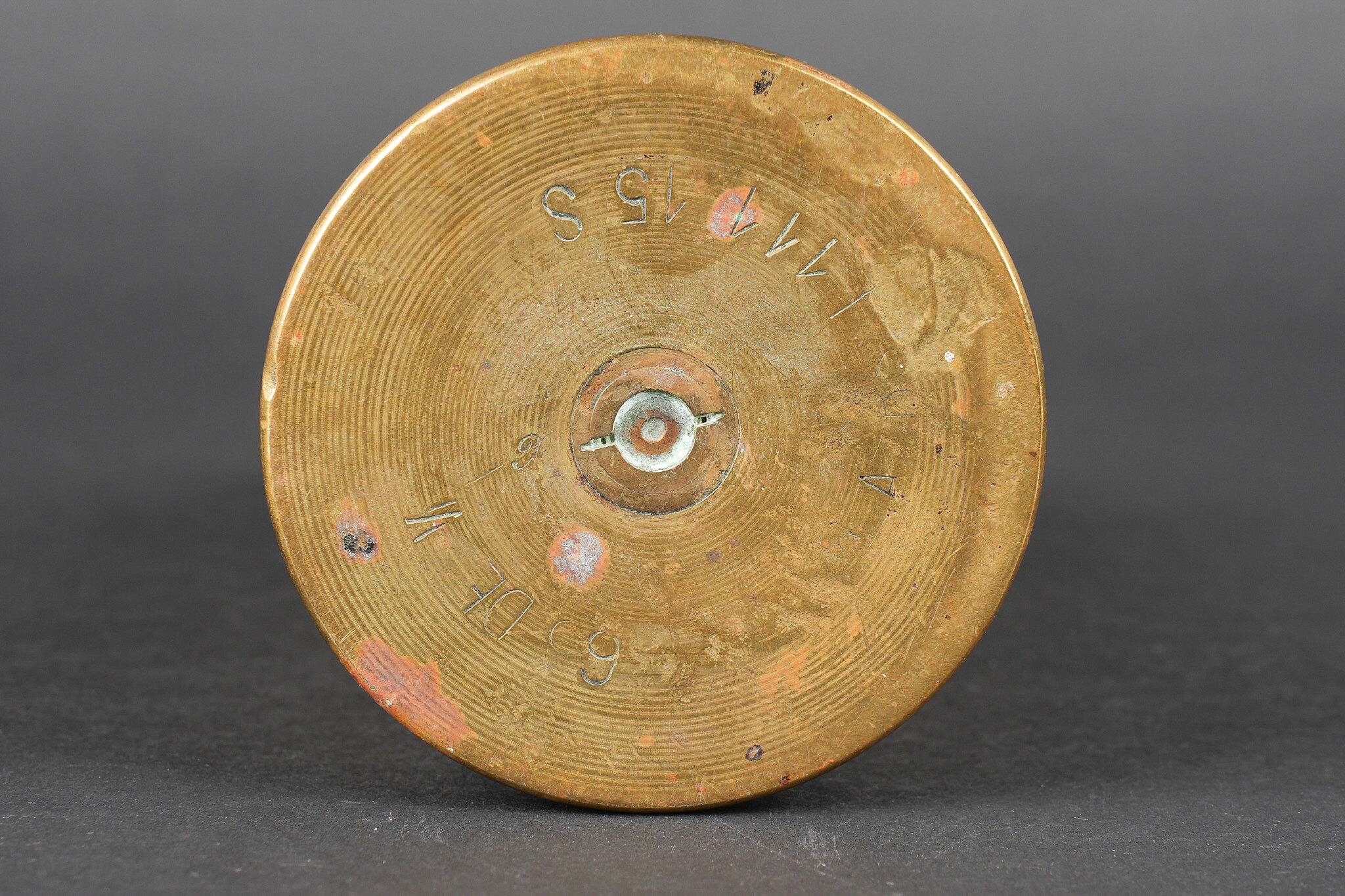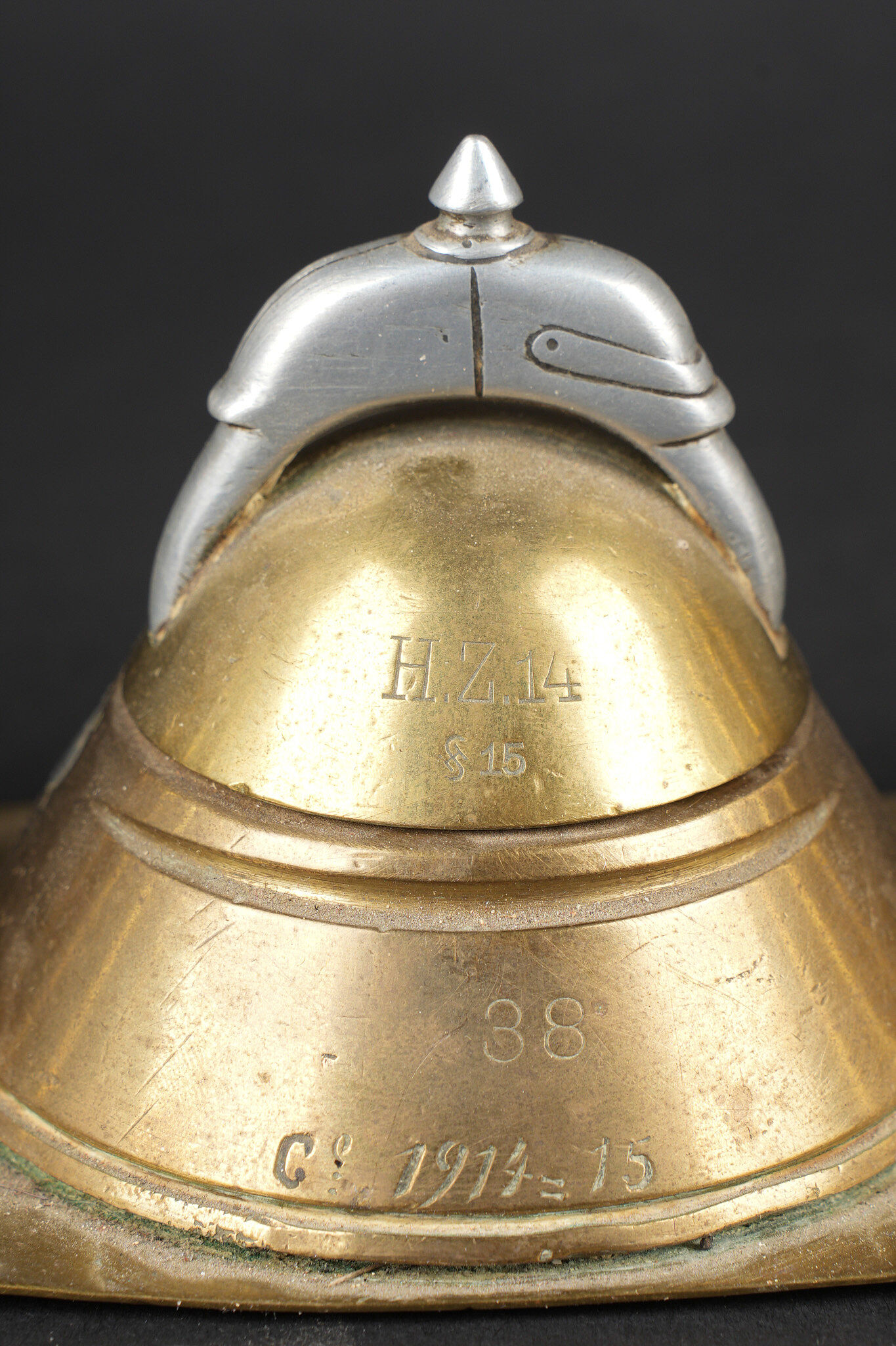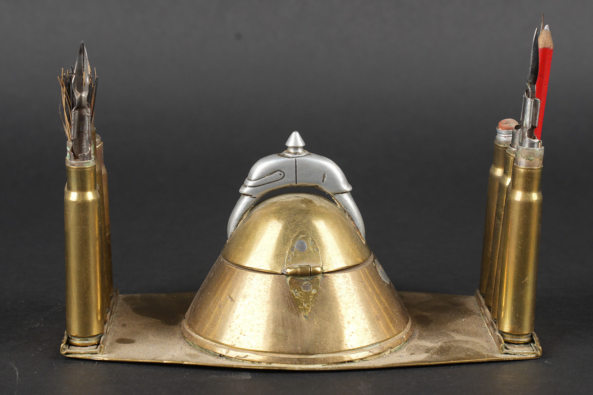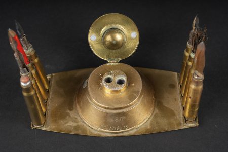 Détails de la vente >Lot artisanat de tranchées. Comprenant un encrier réalisé à partir d’une ogive avec un casque à pointe de profil en aluminium, de chaque côté on trouve des lames chargeurs de Mauser... en savoir plus
