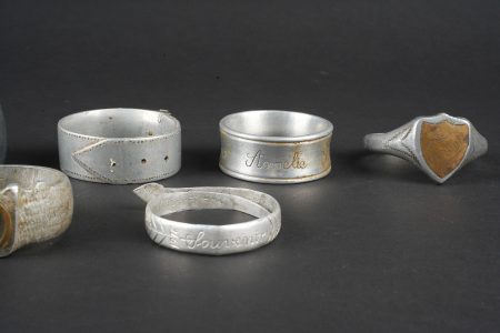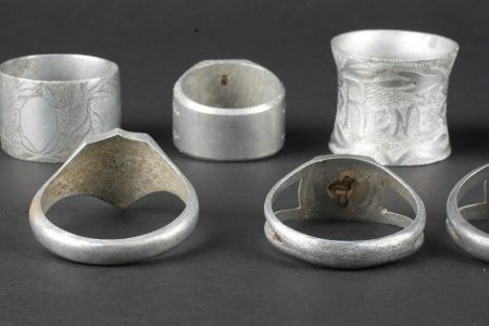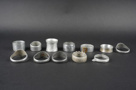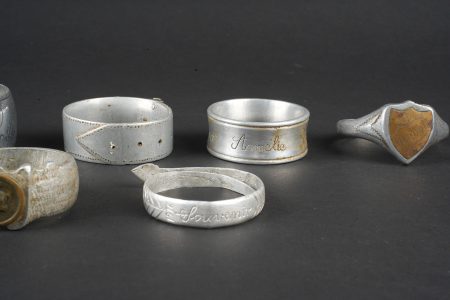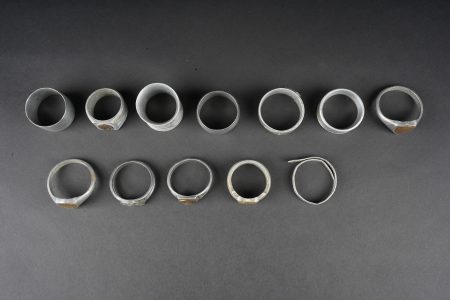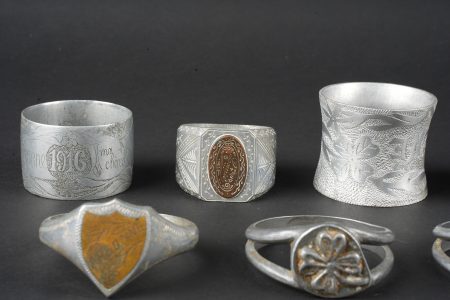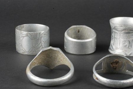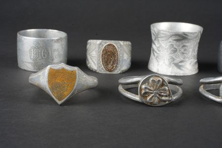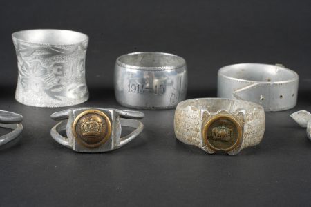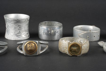 Détails de la vente >Lot artisanat de tranchées. Comprenant douze ronds de serviette, un souvenir de Verdun 1917, un René 1916, un en forme de bague ajourée avec un bouton prussien, un en forme de bague avec un... en savoir plus