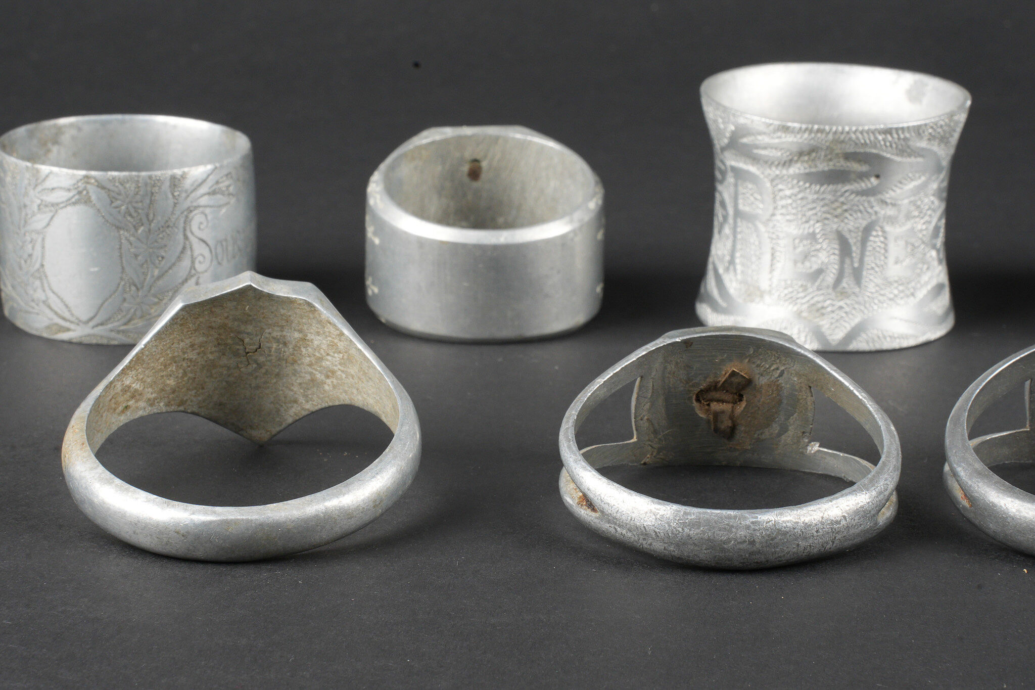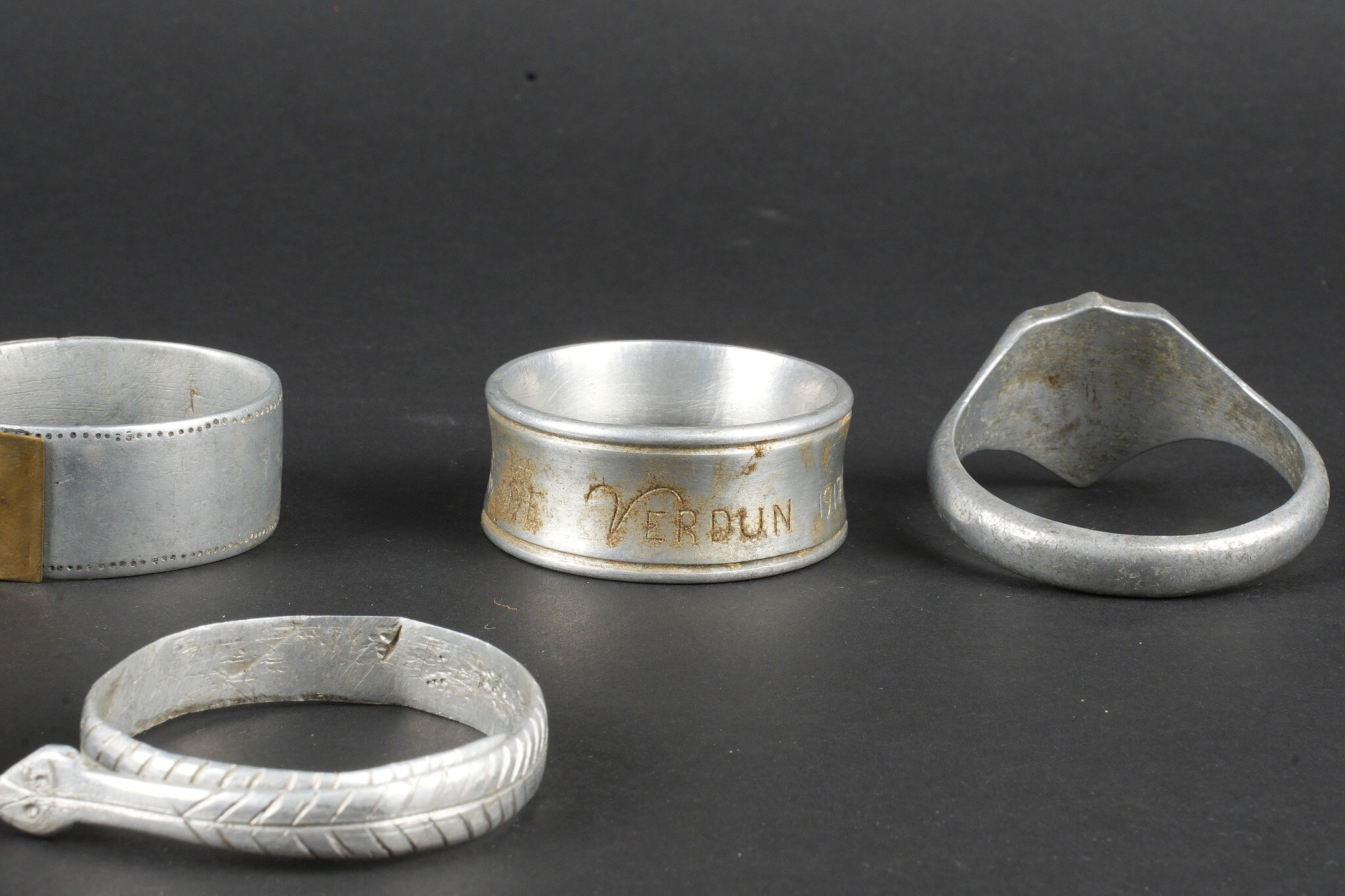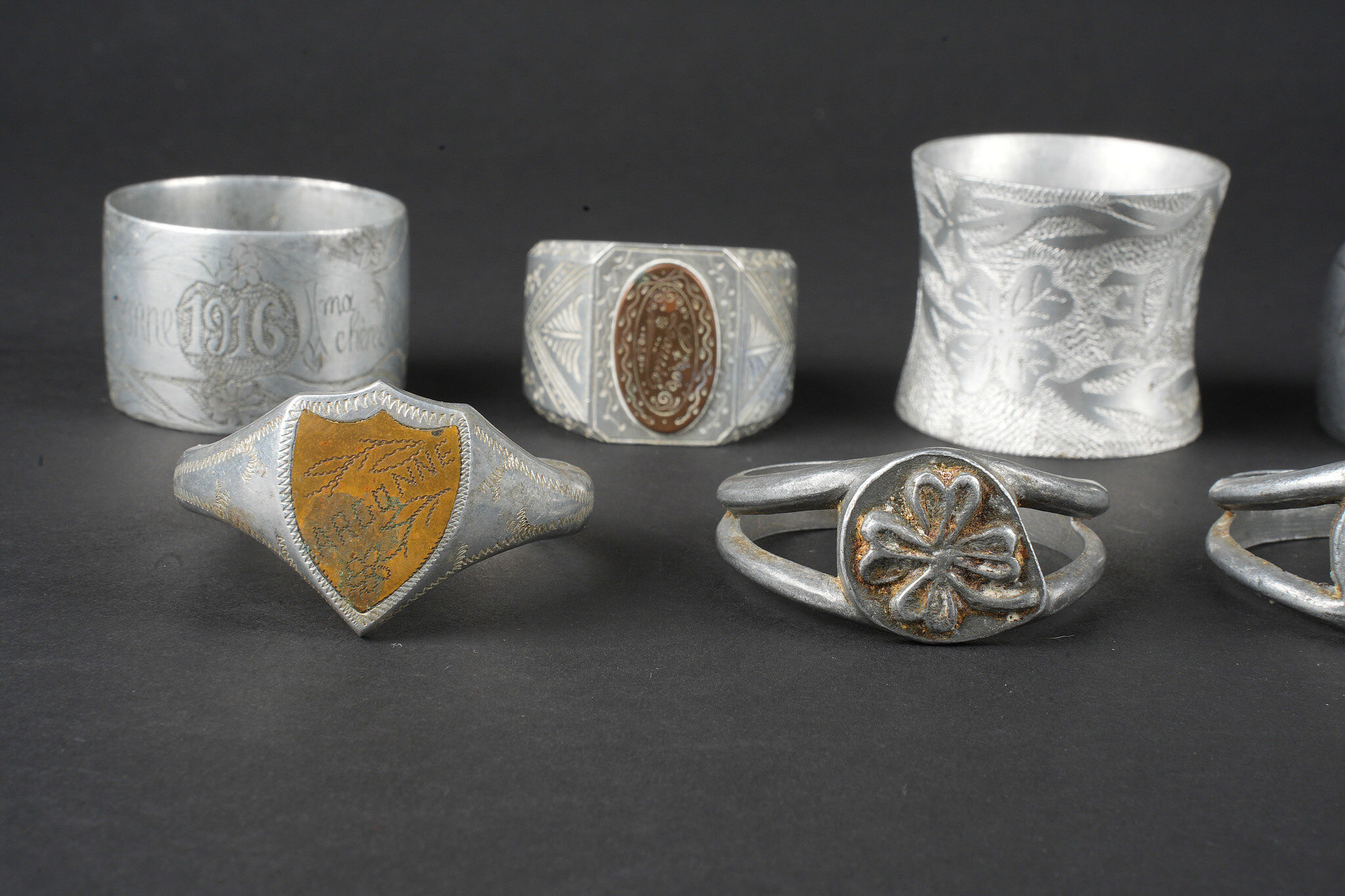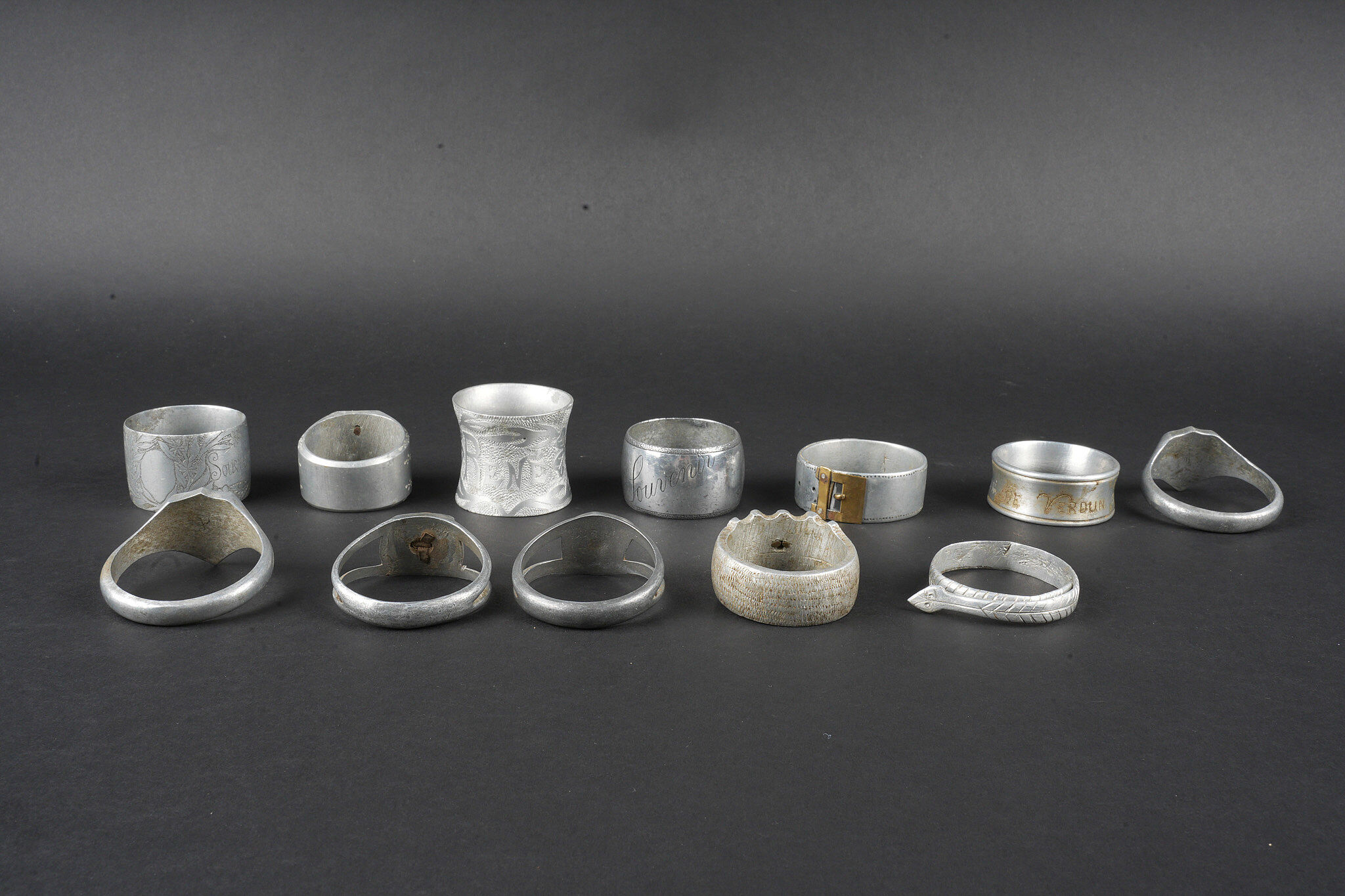 Lot artisanat de tranchées. Comprenant douze ronds de serviette, un souvenir de Verdun 1917, un René 1916, un en forme de bague ajourée avec un bouton prussien, un en forme de bague avec un bouton prussien, un représentant une ceinture des troupes coloniales, un en forme de chevalière dont le centre en laiton porte le prénom Louise, un en forme de serpent souvenir 1916, un gravé souvenir d’Argonne 1916 ma chère Marcèle, un marqué souvenir Ypres 1915, un en forme de bague avec un blason marqué Verdun, un second identique marqué Argonne et une bague ajourée avec un trèfle en son centre. Trench art lot. Twelve napkin rings including one Souvenir de Verdun 1917 one René 1916 one openwork ring with a Prussian button one ring with a Prussian button one representing a colonial troops belt one signet ring form with the name Louise in a brass centre one serpent form Souvenir 1916 one engraved Souvenir d’Argonne 1916 ma chère Marcèle one marked Souvenir Ypres 1915 one ring with a Verdun escutcheon another identical marked Argonne and one openwork ring with a central trefoil.