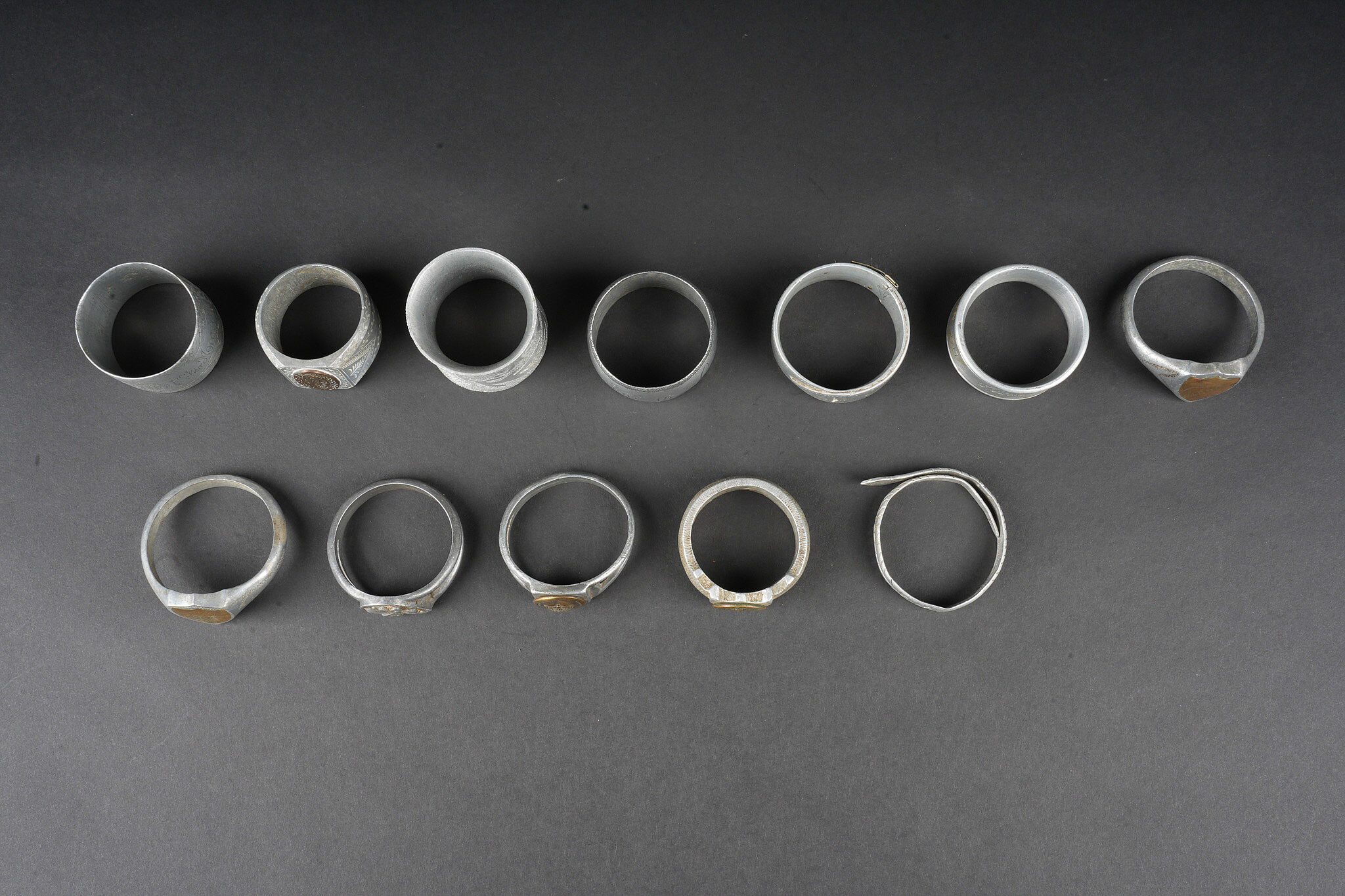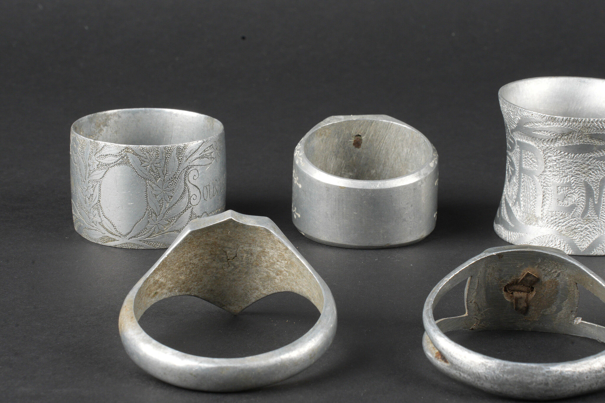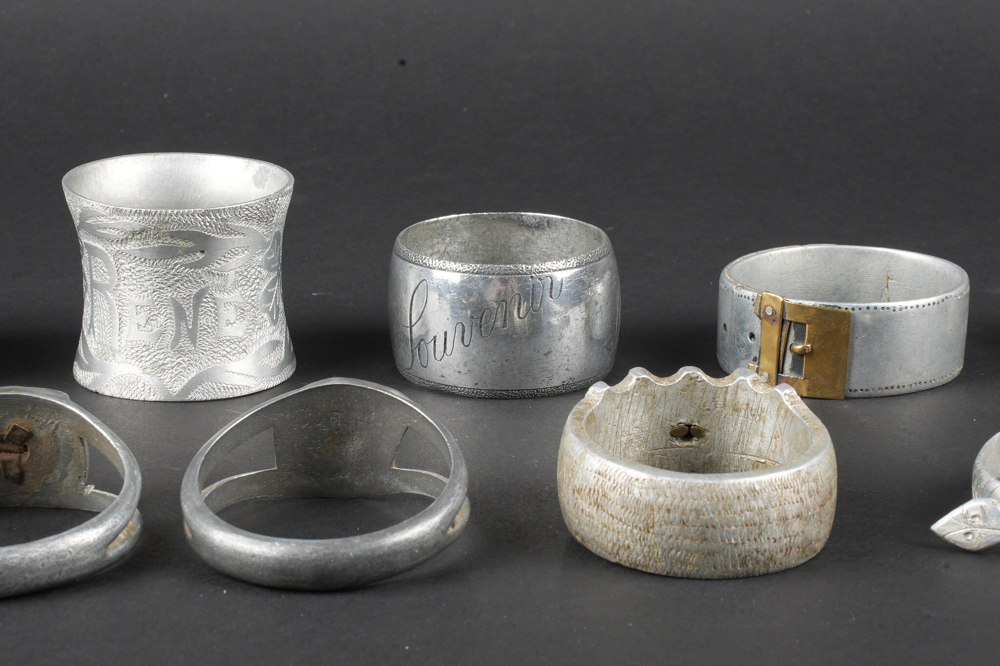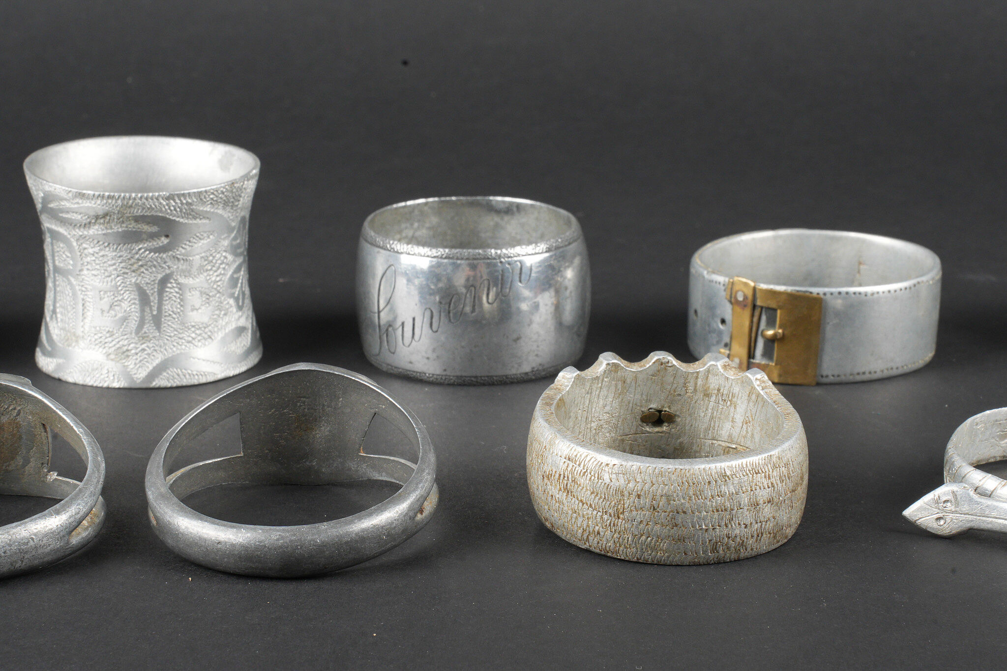 Lot artisanat de tranchées. Comprenant douze ronds de serviette, un souvenir de Verdun 1917, un René 1916, un en forme de bague ajourée avec un bouton prussien, un en forme de bague avec un bouton prussien, un représentant une ceinture des troupes coloniales, un en forme de chevalière dont le centre en laiton porte le prénom Louise, un en forme de serpent souvenir 1916, un gravé souvenir d’Argonne 1916 ma chère Marcèle, un marqué souvenir Ypres 1915, un en forme de bague avec un blason marqué Verdun, un second identique marqué Argonne et une bague ajourée avec un trèfle en son centre. Trench art lot. Twelve napkin rings including one Souvenir de Verdun 1917 one René 1916 one openwork ring with a Prussian button one ring with a Prussian button one representing a colonial troops belt one signet ring form with the name Louise in a brass centre one serpent form Souvenir 1916 one engraved Souvenir d’Argonne 1916 ma chère Marcèle one marked Souvenir Ypres 1915 one ring with a Verdun escutcheon another identical marked Argonne and one openwork ring with a central trefoil.