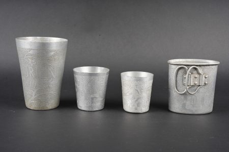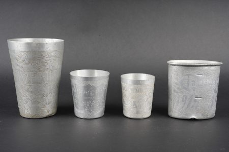 Lot artisanat de tranchées. Comprenant une timbale entièrement gravée portant l’inscription souvenir d’Orient 1915, 16, 17. Un quart allemand réglementaire entièrement gravé par... en savoir plus