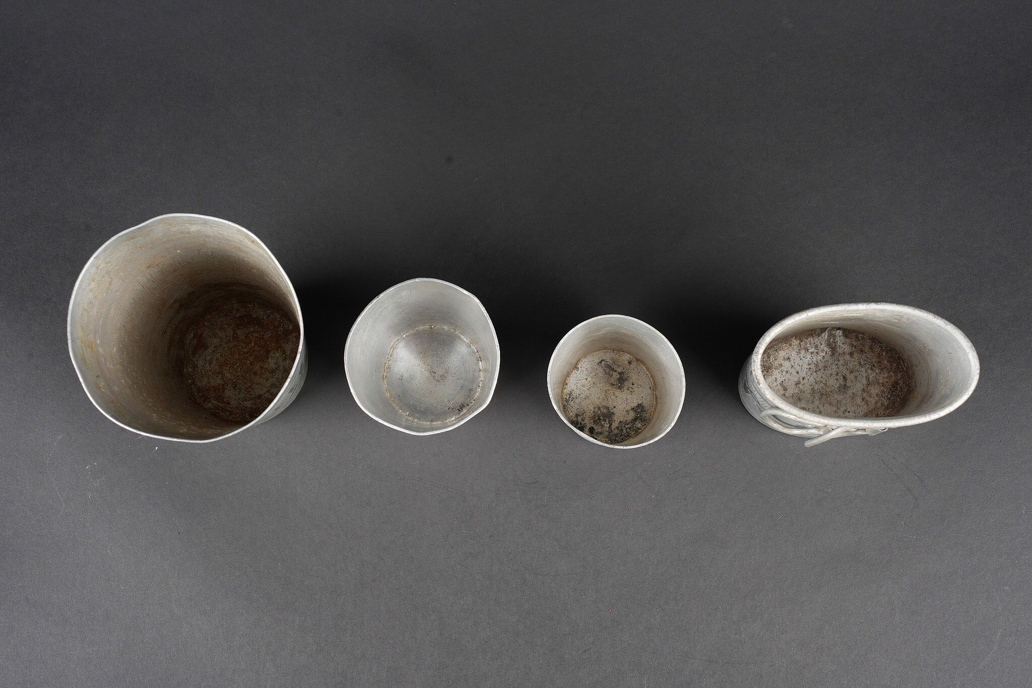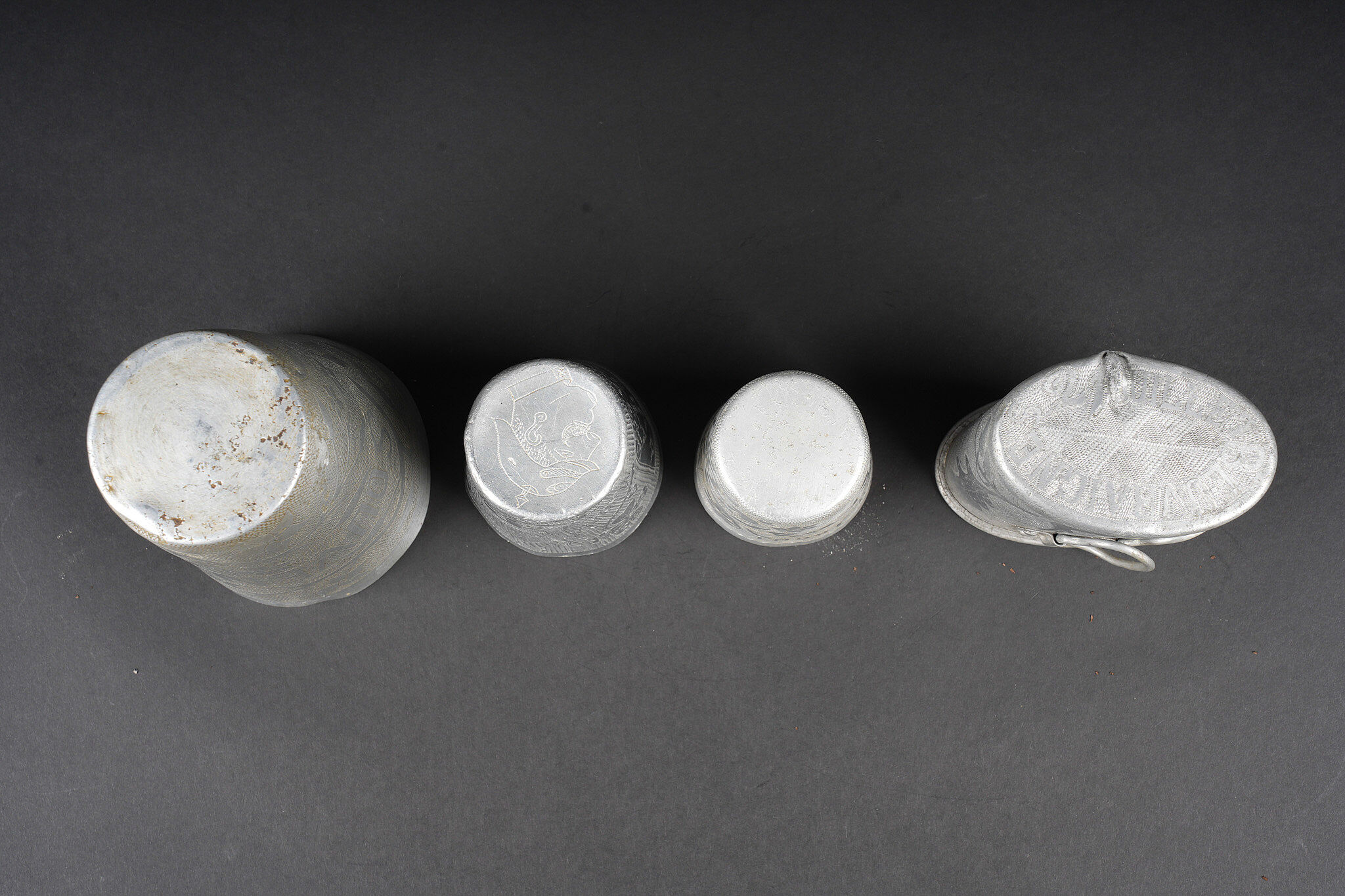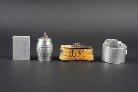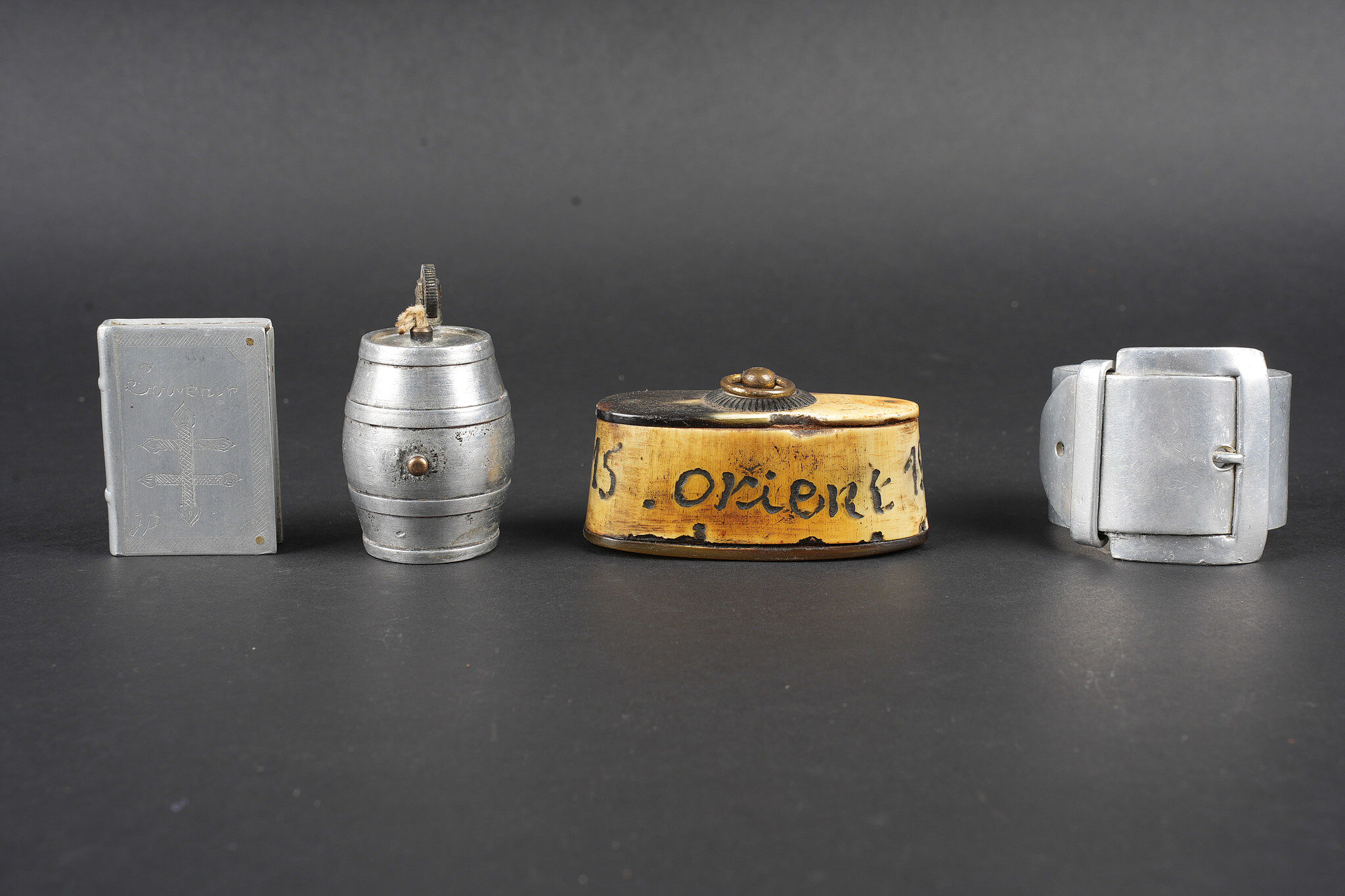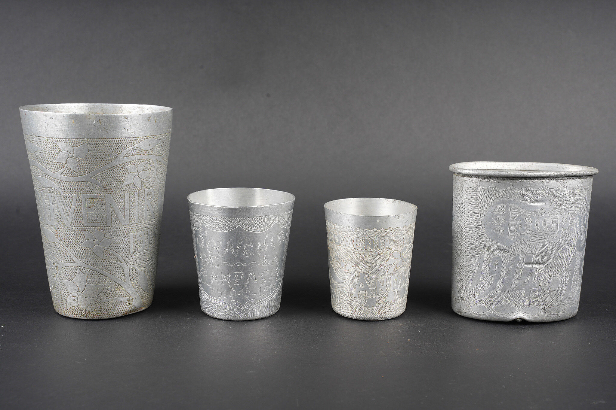 Lot artisanat de tranchées. Comprenant une timbale entièrement gravée portant l’inscription souvenir d’Orient 1915, 16, 17. Un quart allemand réglementaire entièrement gravé par un soldat français portant la mention campagne 1914, 15, Beuvraignes 21 juillet. Une petite timbale entièrement gravée Souvenir de la campagne 1914, 15, 16 ainsi que Honneur aux canons de 75 Taube Helincourt Oise 1916. Une petite timbale gravée Souvenir du front. Un briquet en forme de livre, une fleur sur une face Souvenir surmontant une croix de Lorraine sur l’autre face. Une tabatière en corne marquée Orient 1915 1918. Un briquet en forme de tonneau dont le fond est réalisé avec un bouton des équipages de la flotte. Un rond de serviette en aluminium. Regulation German cup entirely engraved by a French soldier Campagne 1914 15 Beuvraignes 21 juillet. Small beaker engraved Souvenir de la campagne 1914 15 16 Honneur aux canons de 75 Taube Helincourt Oise 1916. Small beaker engraved Souvenir du front. Book shaped lighter with flower motif and Cross of Lorraine on the reverse. Horn tobacco box marked Orient 1915 1918. Barrel shaped lighter with base made from a naval equipment button. Aluminium napkin ring.
