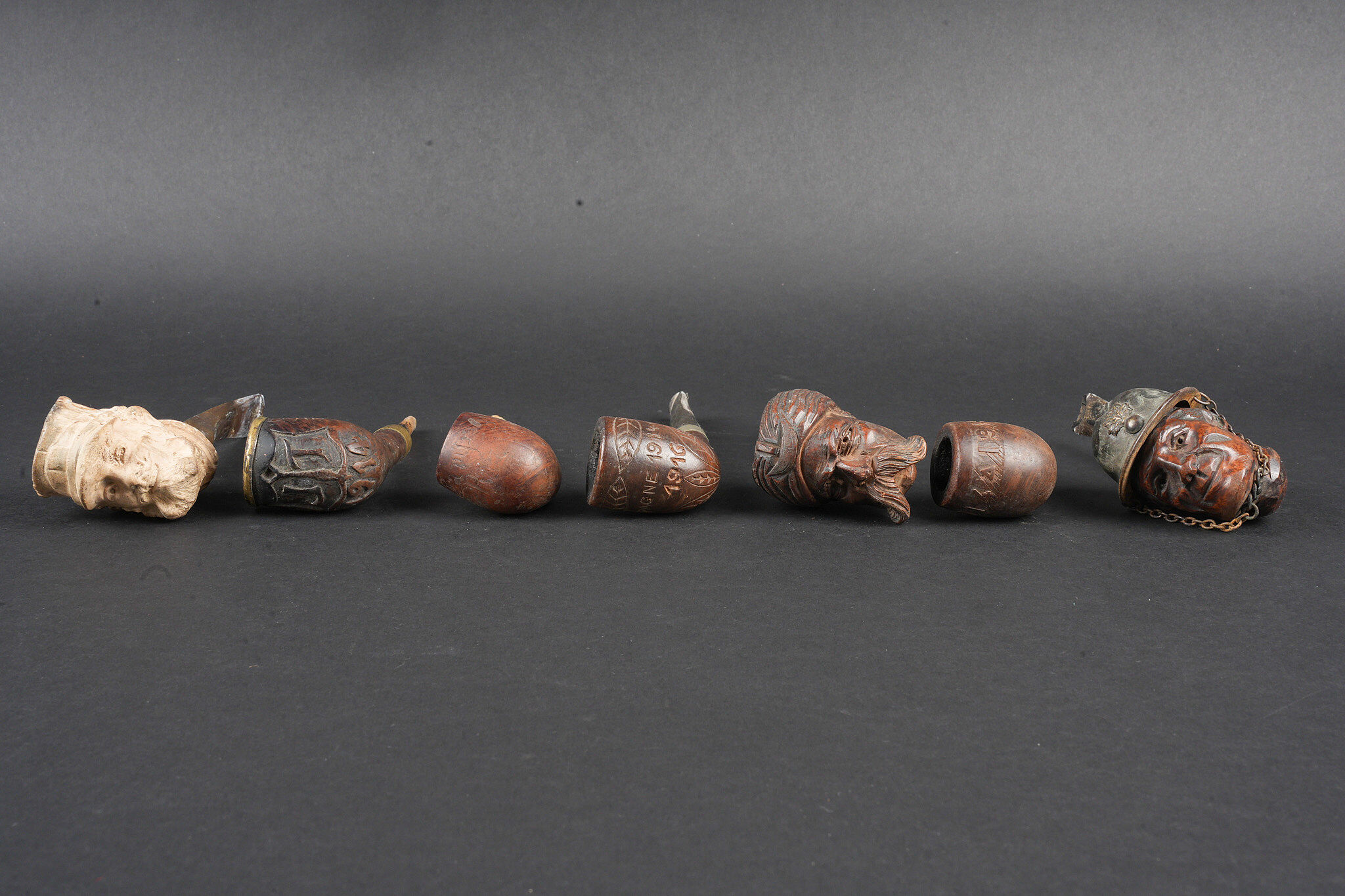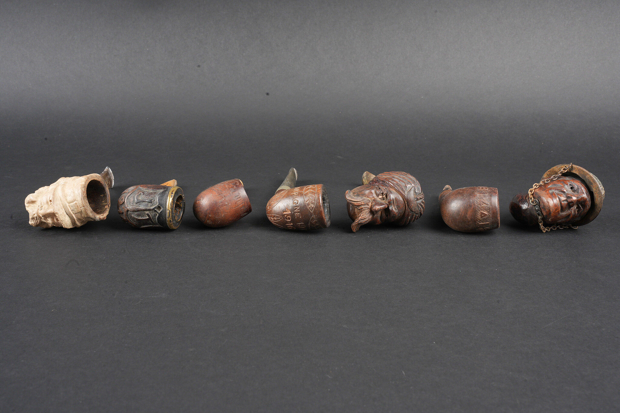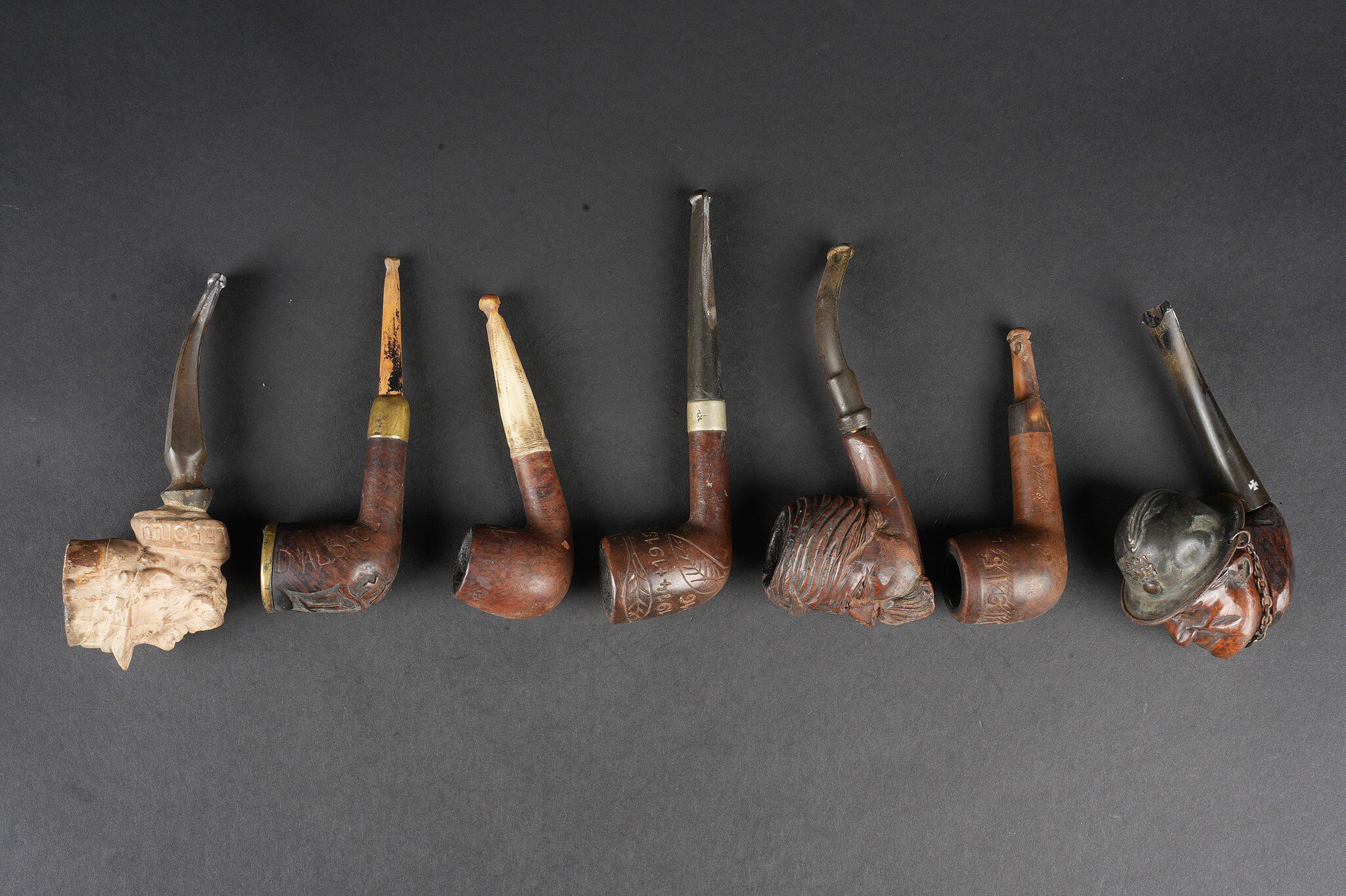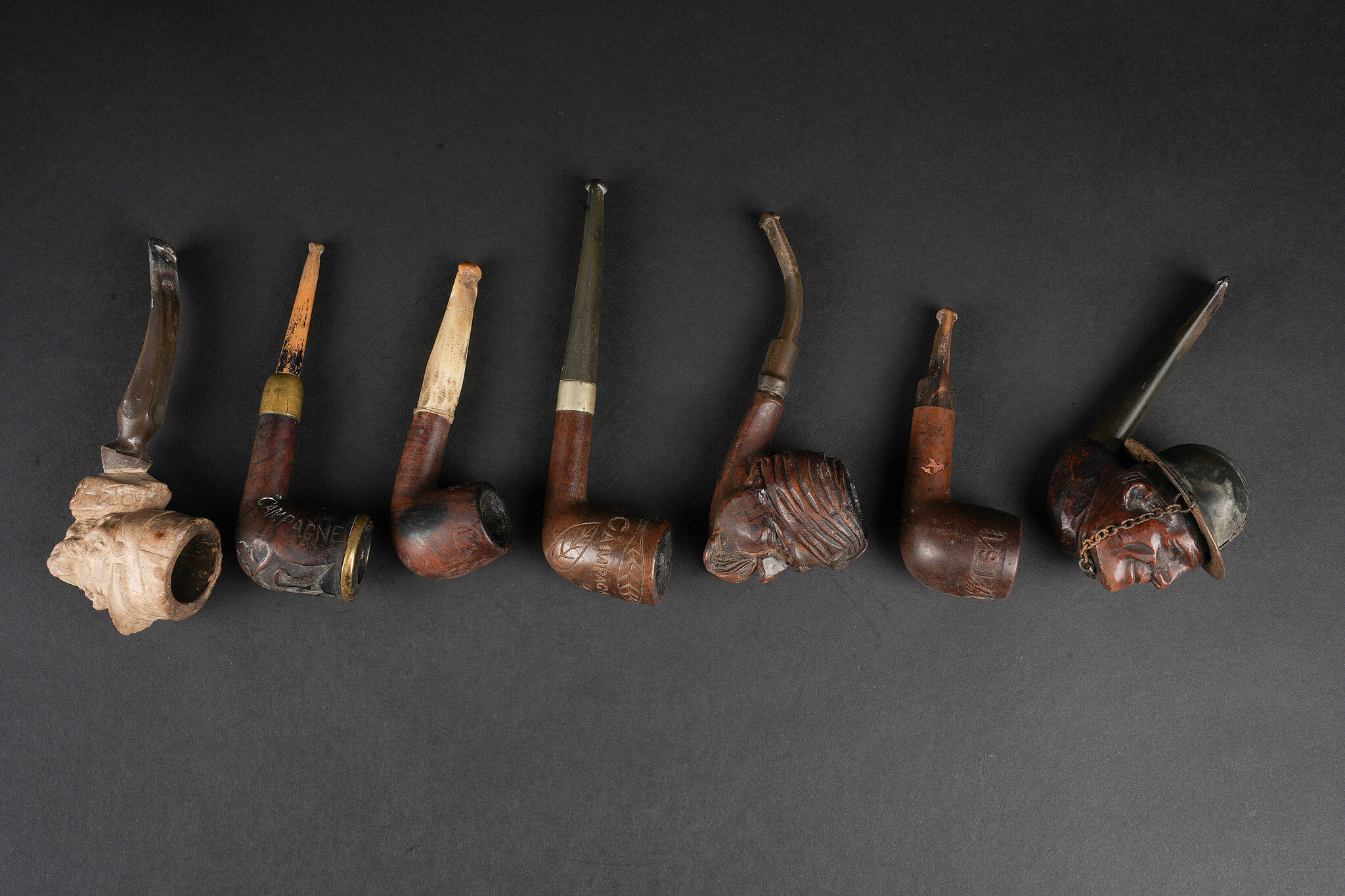 Lot artisanat de tranchées pipes. Comprenant sept pipes gravées dont une 1914-1915, une campagne 1914-1915-1916 et une croix de guerre, une 1914, une campagne d’Alsace 1914, une en terre représentant la tête d’un poilu avec 1914, 15 le poilu, une avec une tête de tirailleur et une avec la tête d’un poilu sculpté et un casque Adrian amovible en métal. Lot of trench art pipes. Comprising seven engraved pipes including one dated 1914 1915 one campaign 1914 1915 1916 with a Croix de guerre one dated 1914 one Alsace campaign 1914 one clay pipe in the form of a poilu head inscribed 1914 15 le poilu one with a tirailleur head and one with a sculpted poilu head and a detachable metal Adrian helmet.