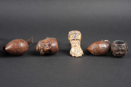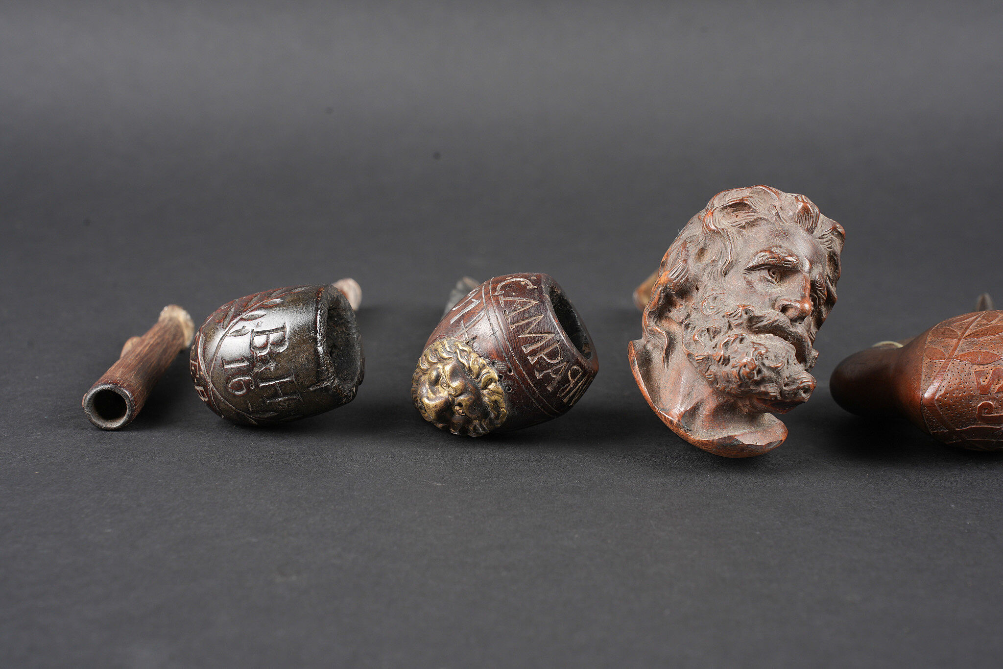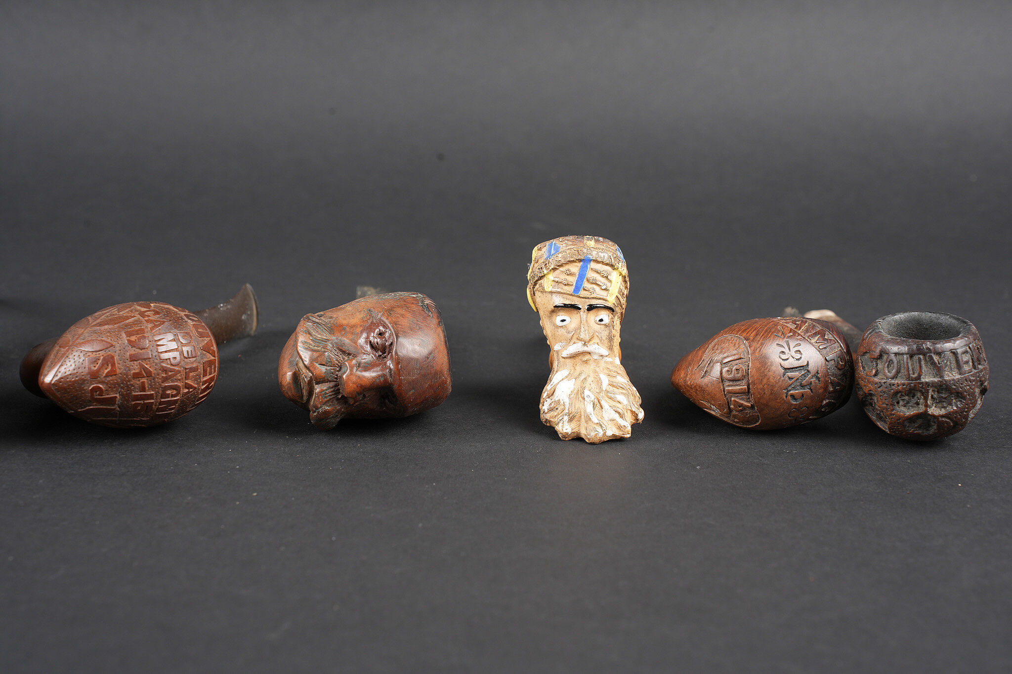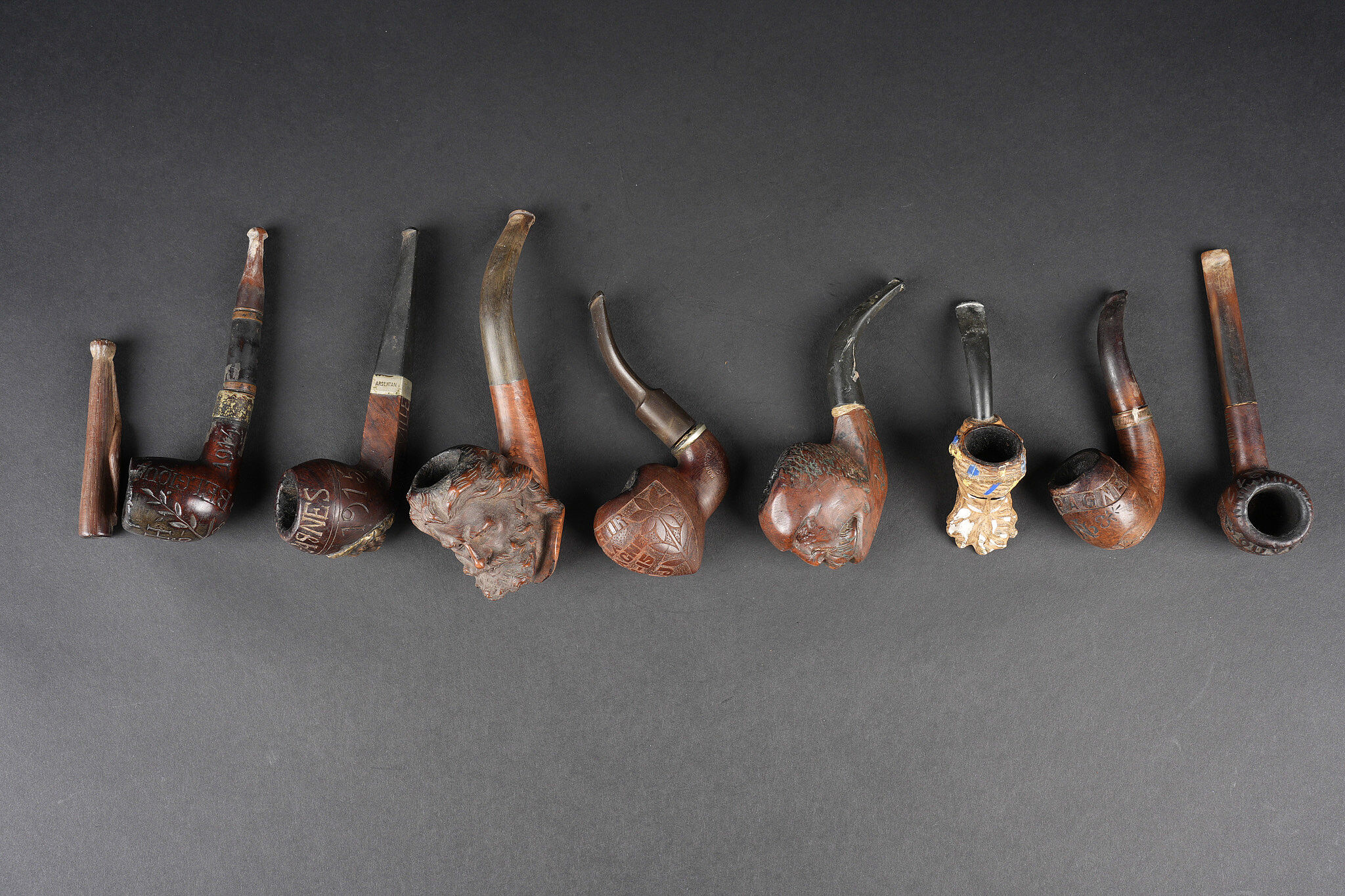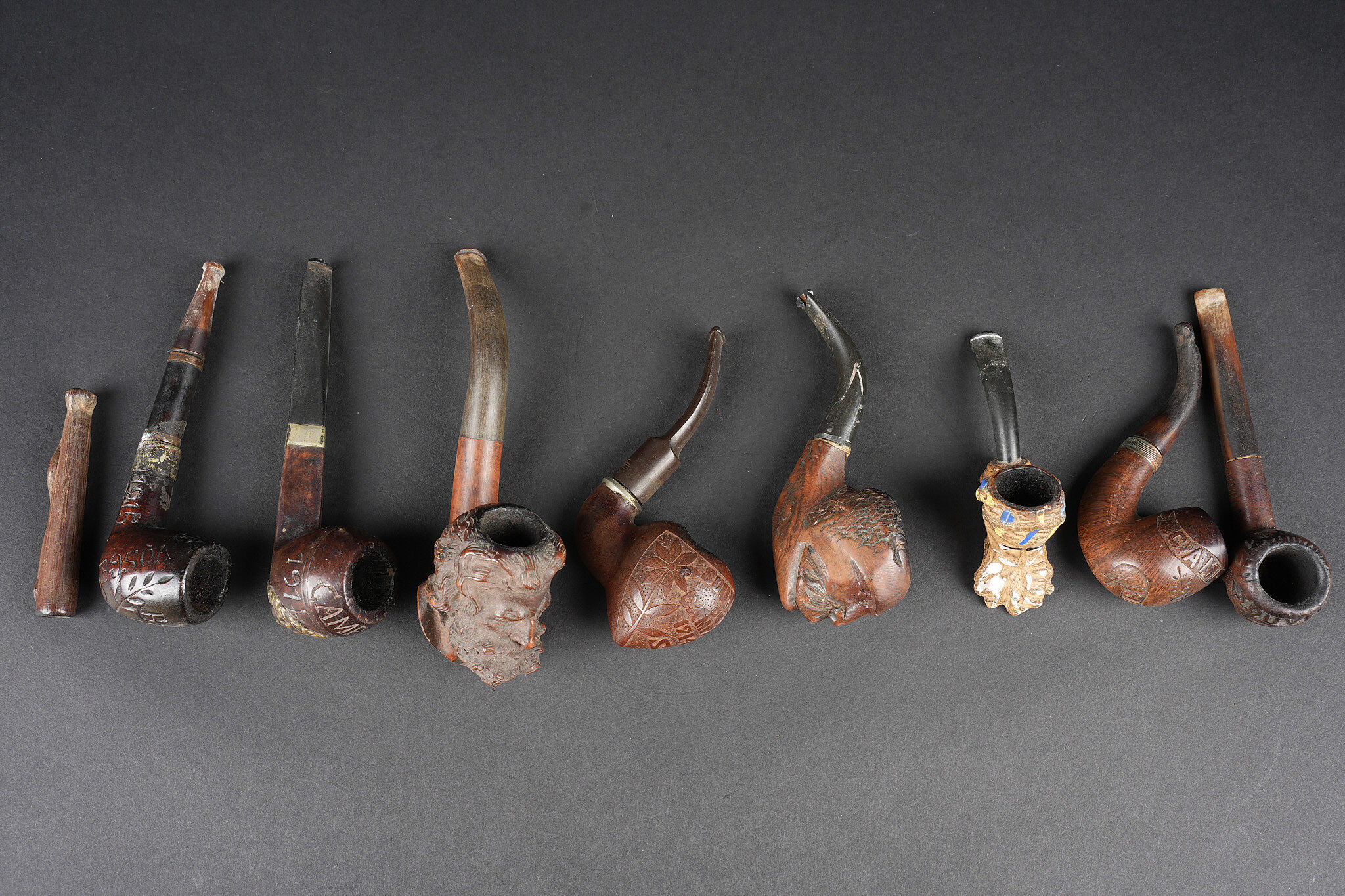 Lot artisanat de tranchées pipes. Comprenant huit pipes en bois gravées, une Vosges Belgique 1914 1915 1916, une Souvenir 1917, une Gloire Louis 1916, une Campagne 1914 1915 Champgnoux 1915 Lunéville, Campagne 1914, une Souvenir de la campagne 1914-15, une avec un visage sculpté et une Jacob 1916. On y joint un fume cigarette avec un serpent grimpant. Lot of trench art pipes. Comprising eight carved wooden pipes. One engraved Vosges Belgique 1914 1915 1916. One Souvenir 1917. One Gloire Louis 1916. One Campagne 1914 1915 Champgnoux 1915 Luneville Campagne 1914. One Souvenir de la campagne 1914 15. One with a carved face. One Jacob 1916. With a cigarette holder decorated with a climbing serpent.