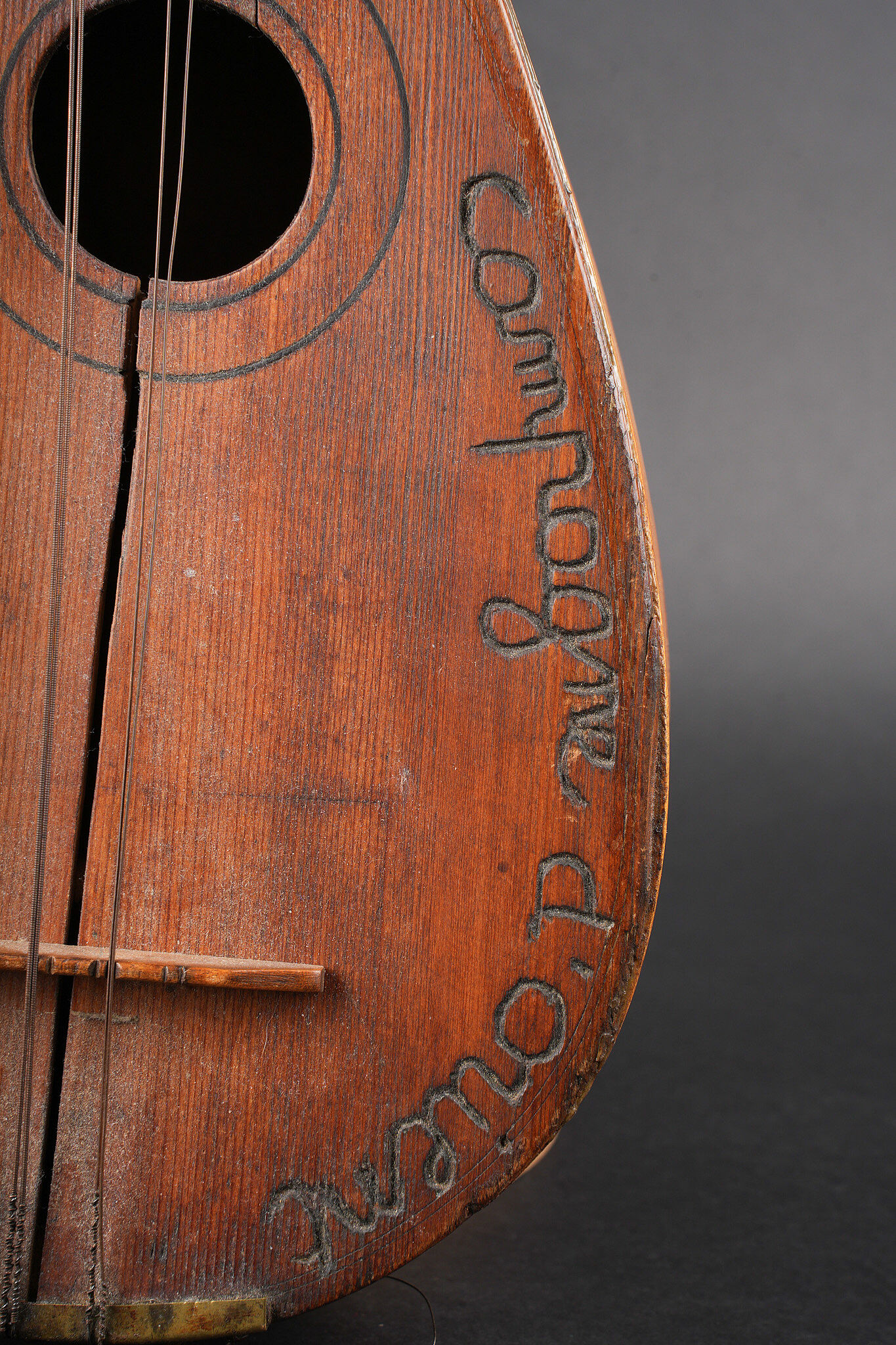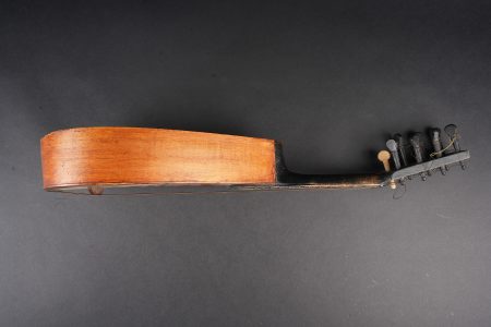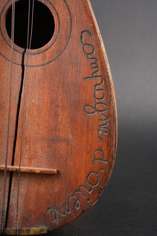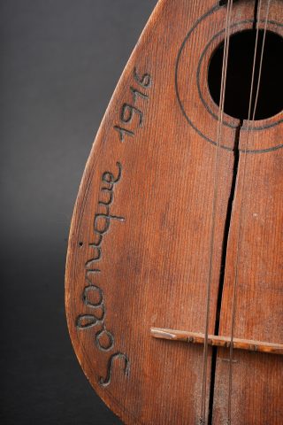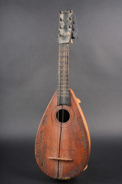 Mandoline de poilu. Réalisée de façon artisanale en bois, la caisse est fendue et gravée Campagne d’Orient Salonique 1916. Six têtes dont une non d’origine, cordes accidentées.Poilu mandolin. Hand made in wood the body split and engraved Campagne d’Orient Salonique 1916. Six tuning pegs one replaced damaged strings.