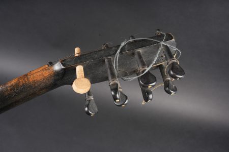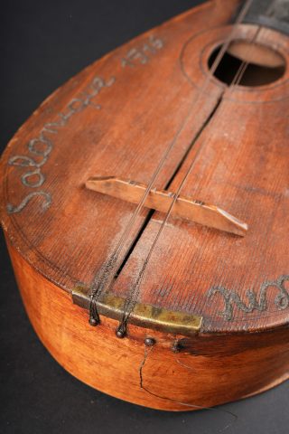 Mandoline de poilu. Réalisée de façon artisanale en bois, la caisse est fendue et gravée Campagne d’Orient Salonique 1916. Six têtes dont une non d’origine, cordes... en savoir plus
