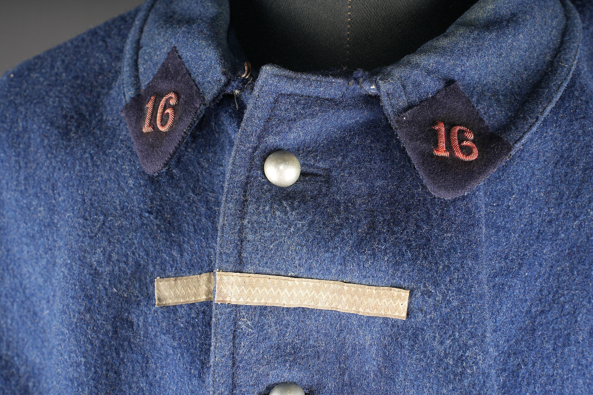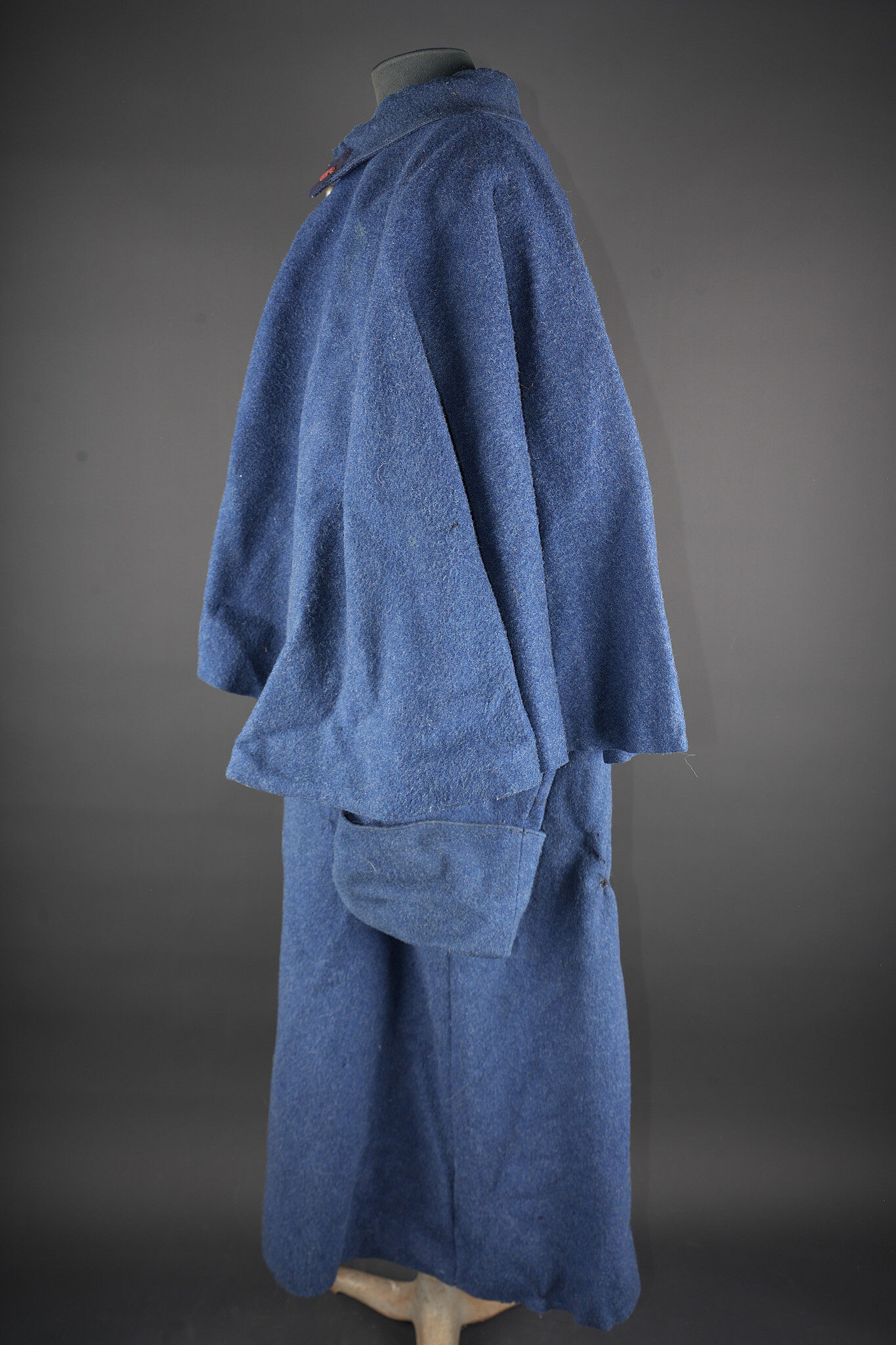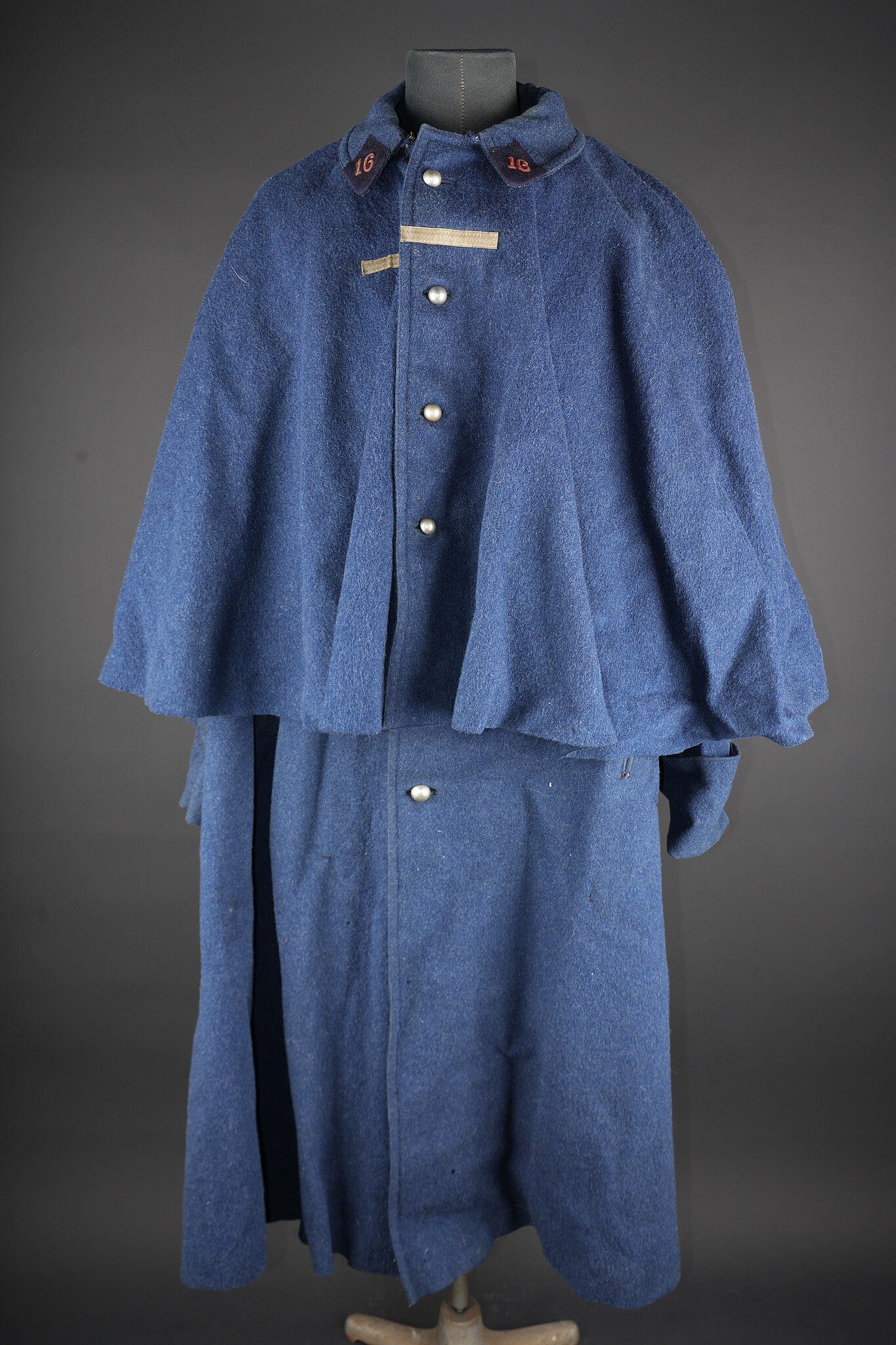 Manteau à rotonde 16ème train. Confectionné en drap gris de fer bleuté et se fermant par six boutons argentés lisses. L’intégralité de la doublure a été supprimée sauf au niveau des deux poches latérales. Deux grosses réparations d’environ 15cm à l’arrière, les retours de drap de chaque côtés sont entièrement collés afin de solidifier l’effet dû à l’absence de doublure. Pattes de col en drap noir, chiffres brodés cannetille réhaussés à la peinture rouge. Rotonde fixe également en drap gris de fer bleuté, directement cousue sur le manteau. Grade de sous lieutenant cousu d’origine. Greatcoat with cape 16th Train Battalion. Made of iron grey blue cloth and closing with six plain silvered buttons. The entire lining has been removed except in the two side pockets. Two large repairs of about 15 centimetres on the back and both cloth turn backs glued to reinforce the garment due to the missing lining. Black cloth collar patches with cannetille embroidered numerals enhanced in red paint. Fixed cape in matching cloth directly sewn to the coat. Original sub lieutenant rank insignia.