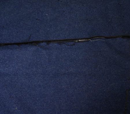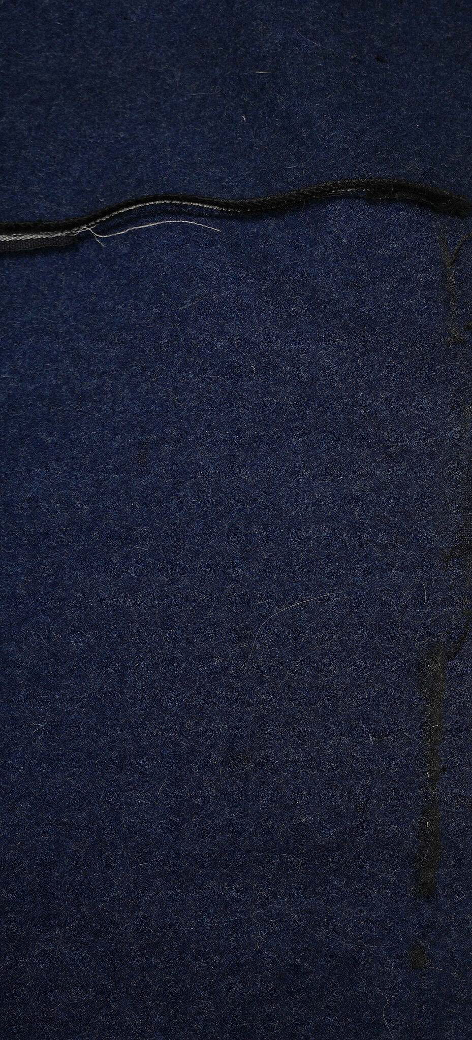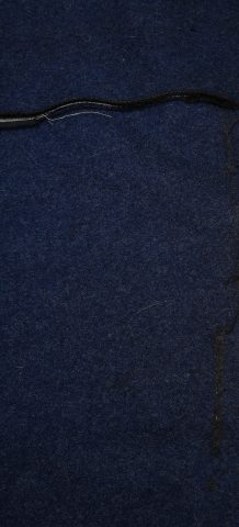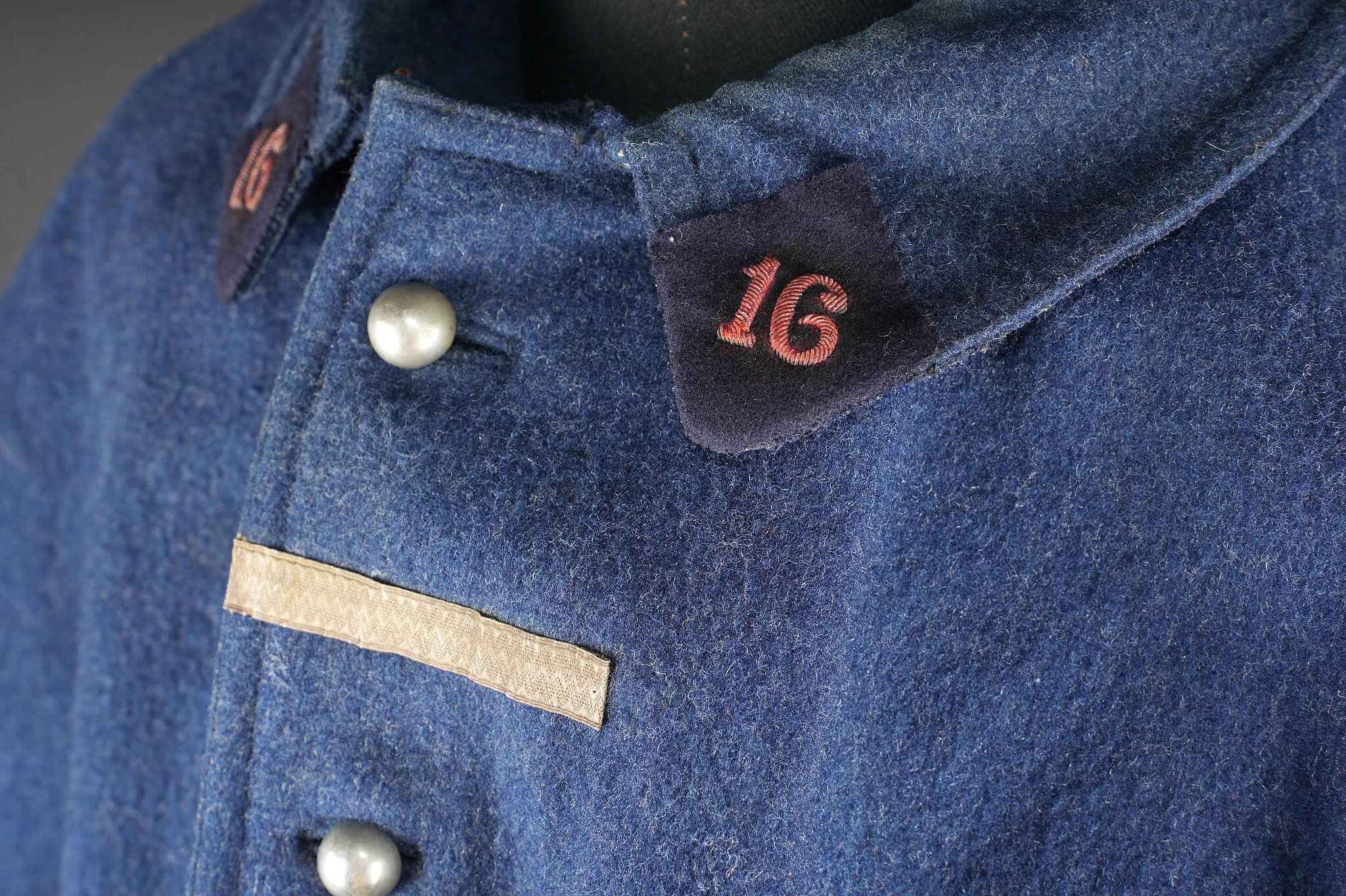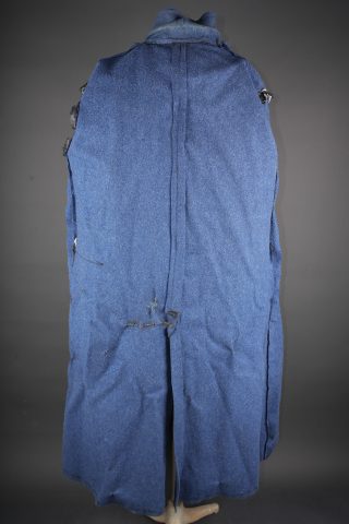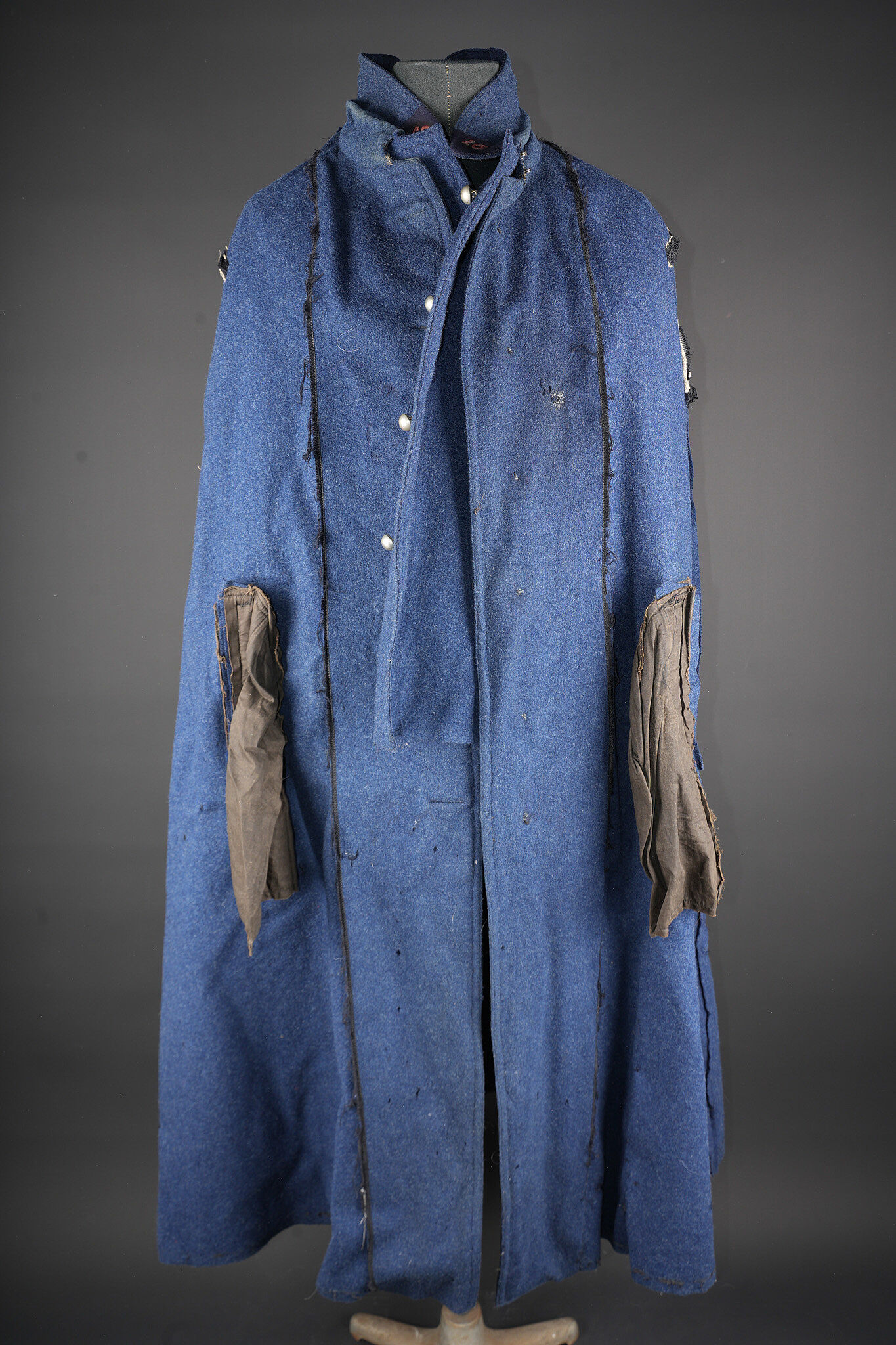 Manteau à rotonde 16ème train. Confectionné en drap gris de fer bleuté et se fermant par six boutons argentés lisses. L’intégralité de la doublure a été supprimée sauf au niveau des deux poches latérales. Deux grosses réparations d’environ 15cm à l’arrière, les retours de drap de chaque côtés sont entièrement collés afin de solidifier l’effet dû à l’absence de doublure. Pattes de col en drap noir, chiffres brodés cannetille réhaussés à la peinture rouge. Rotonde fixe également en drap gris de fer bleuté, directement cousue sur le manteau. Grade de sous lieutenant cousu d’origine. Greatcoat with cape 16th Train Battalion. Made of iron grey blue cloth and closing with six plain silvered buttons. The entire lining has been removed except in the two side pockets. Two large repairs of about 15 centimetres on the back and both cloth turn backs glued to reinforce the garment due to the missing lining. Black cloth collar patches with cannetille embroidered numerals enhanced in red paint. Fixed cape in matching cloth directly sewn to the coat. Original sub lieutenant rank insignia.