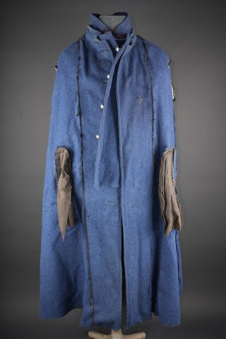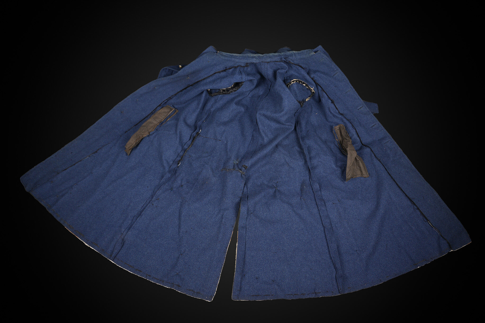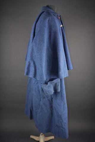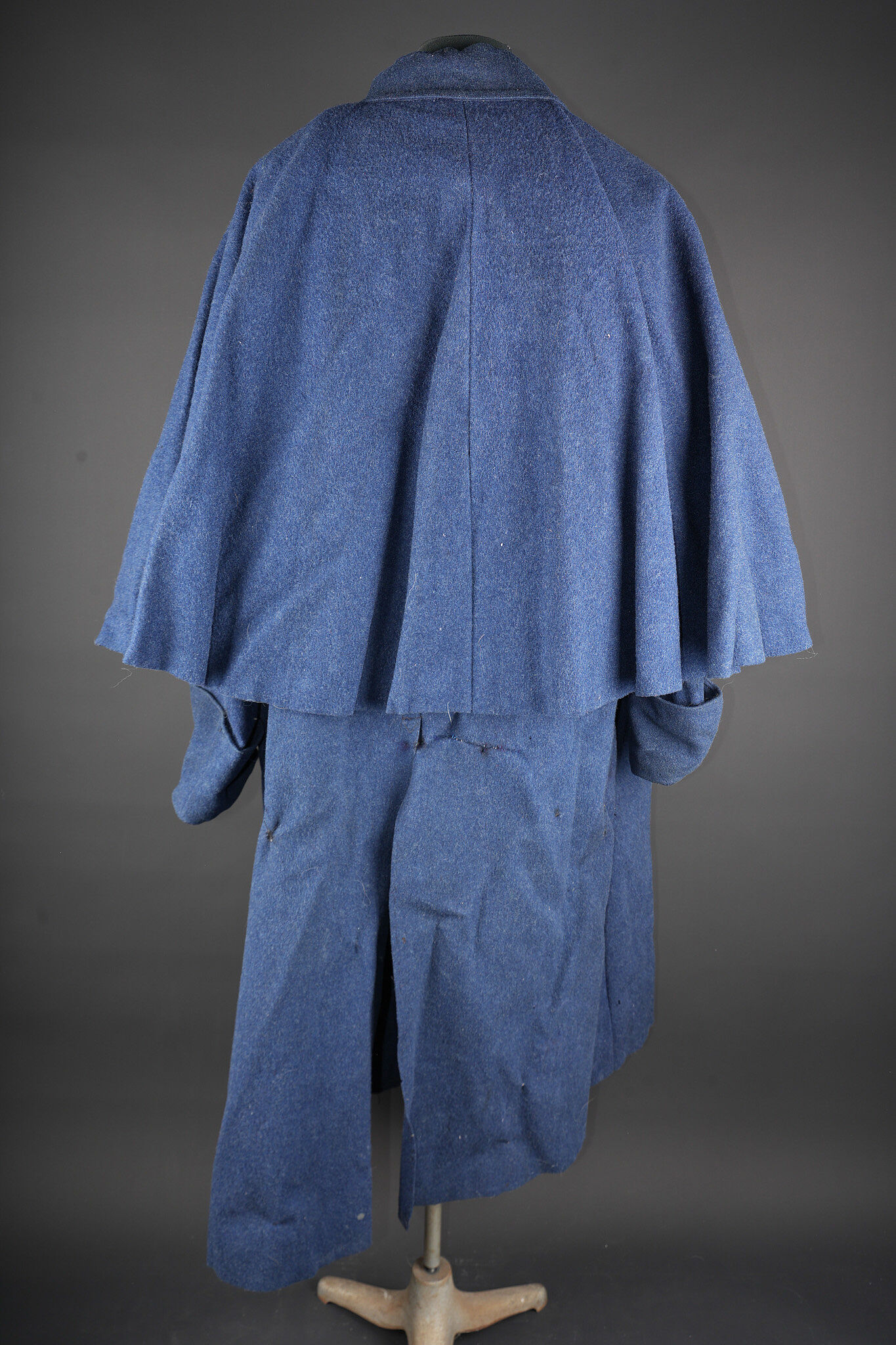 Détails de la vente >Manteau à rotonde 16ème train. Confectionné en drap gris de fer bleuté et se fermant par six boutons argentés lisses. L’intégralité de la doublure a été supprimée sauf au niveau... en savoir plus