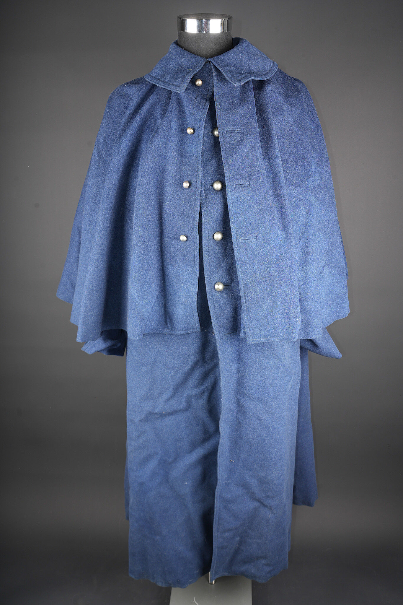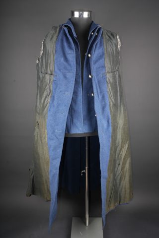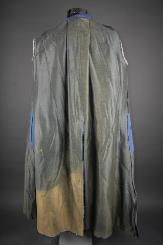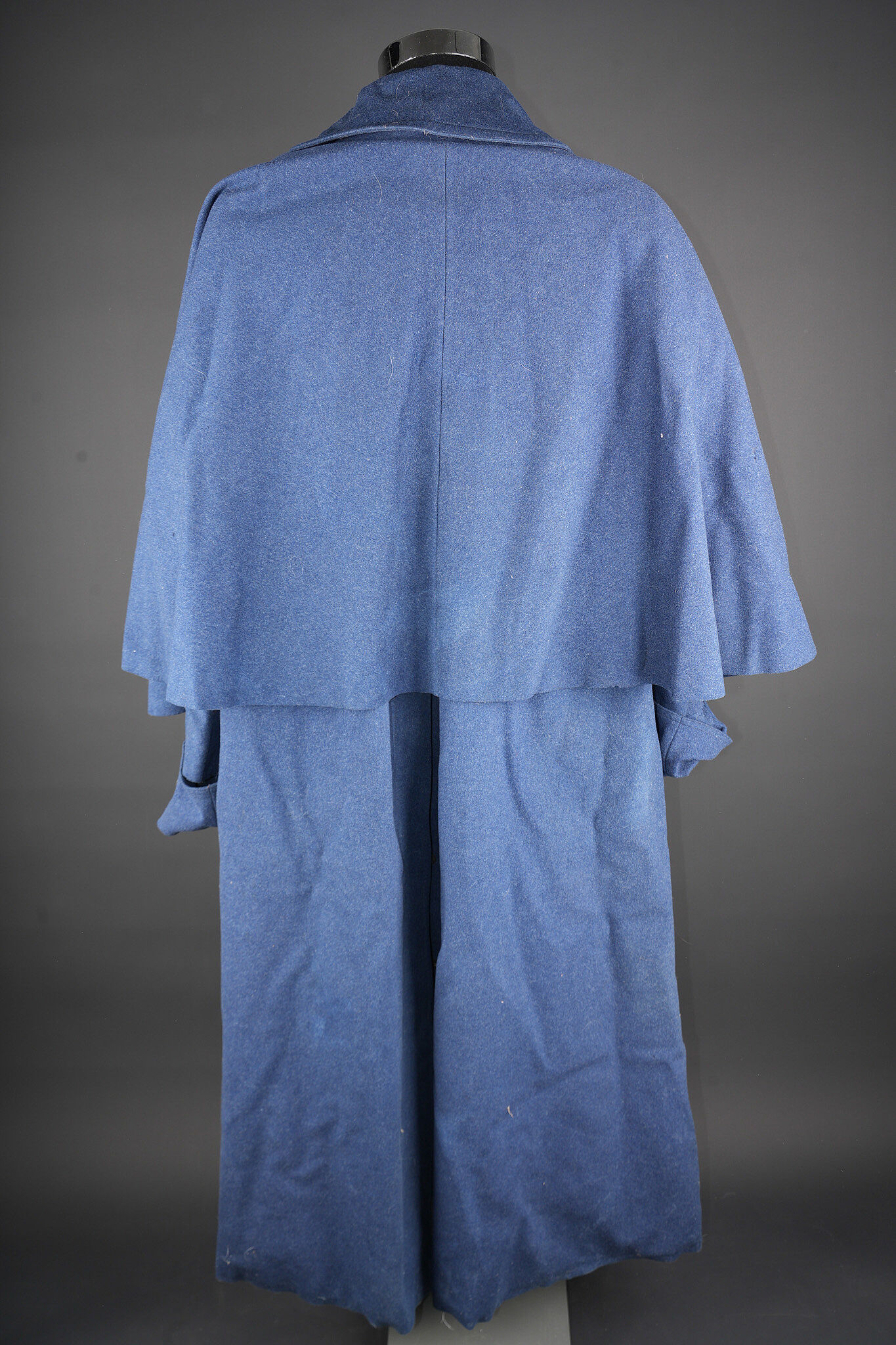 Manteau à rotonde. Confectionné en drap gris de fer bleuté et se fermant par six boutons dont un absent. Parements de manches coupés puis recollés, rotonde découpée et également collée et... en savoir plus