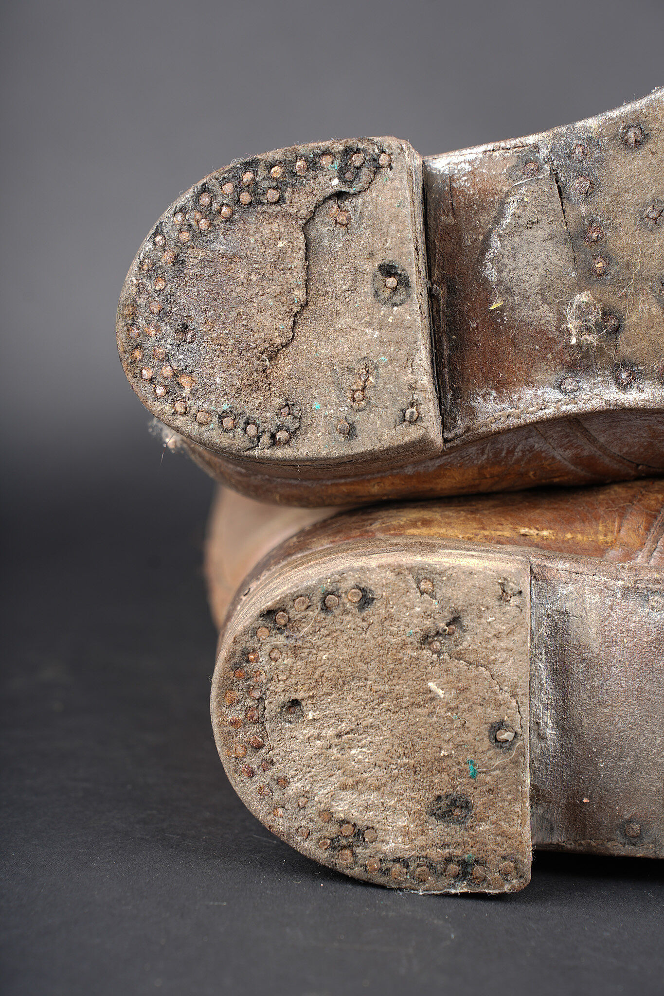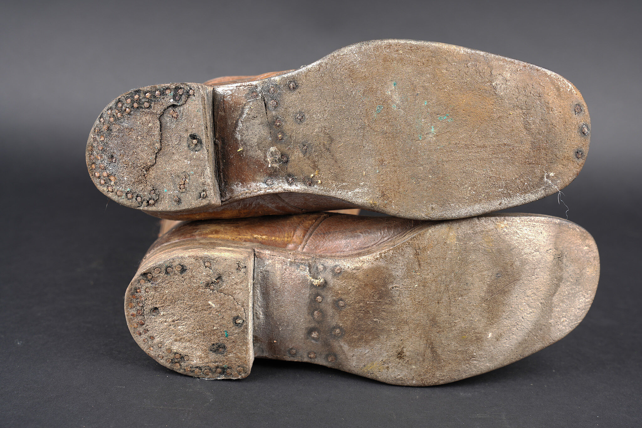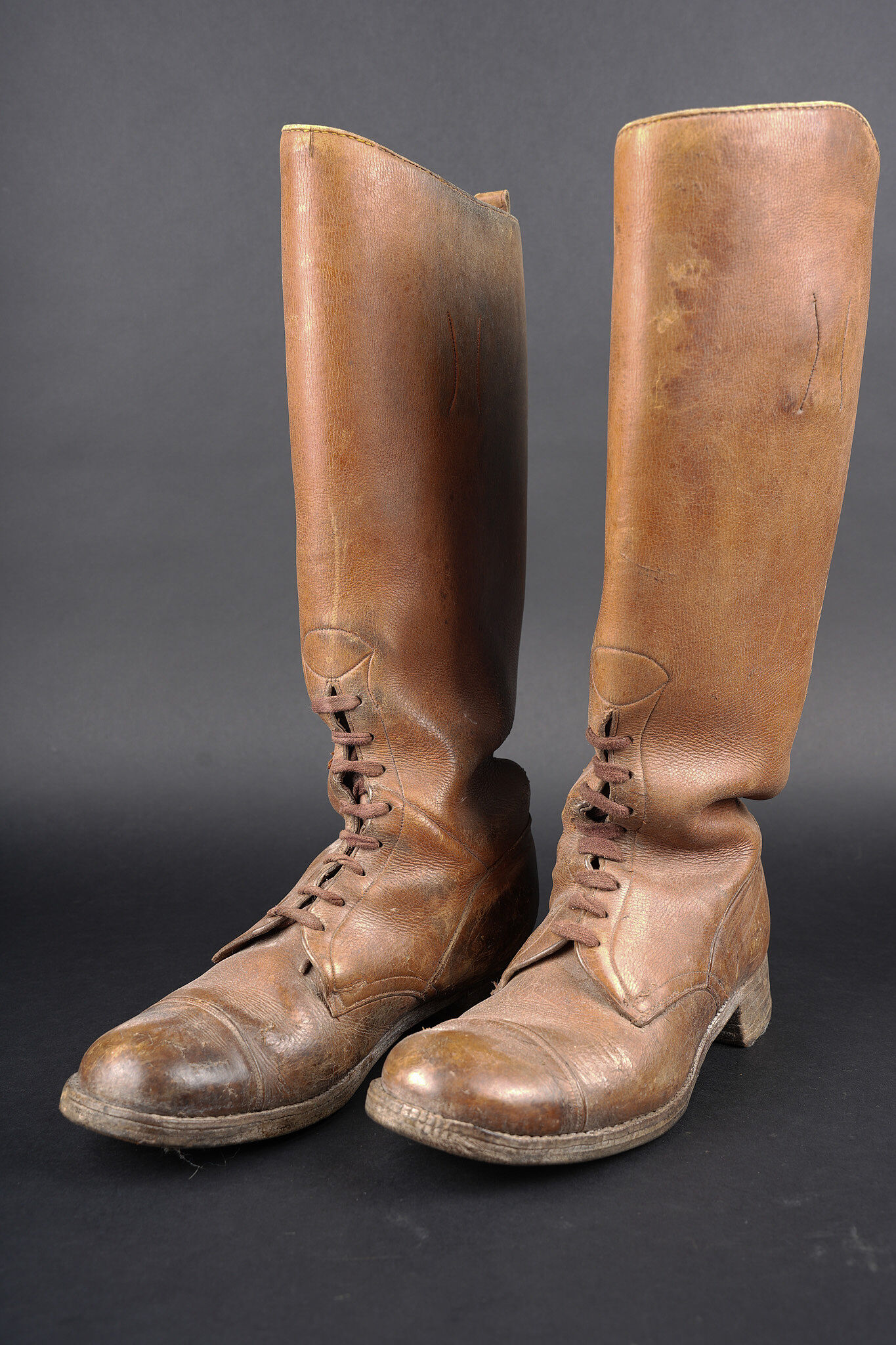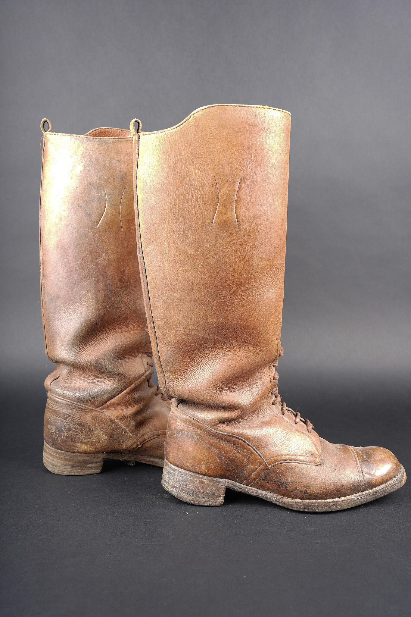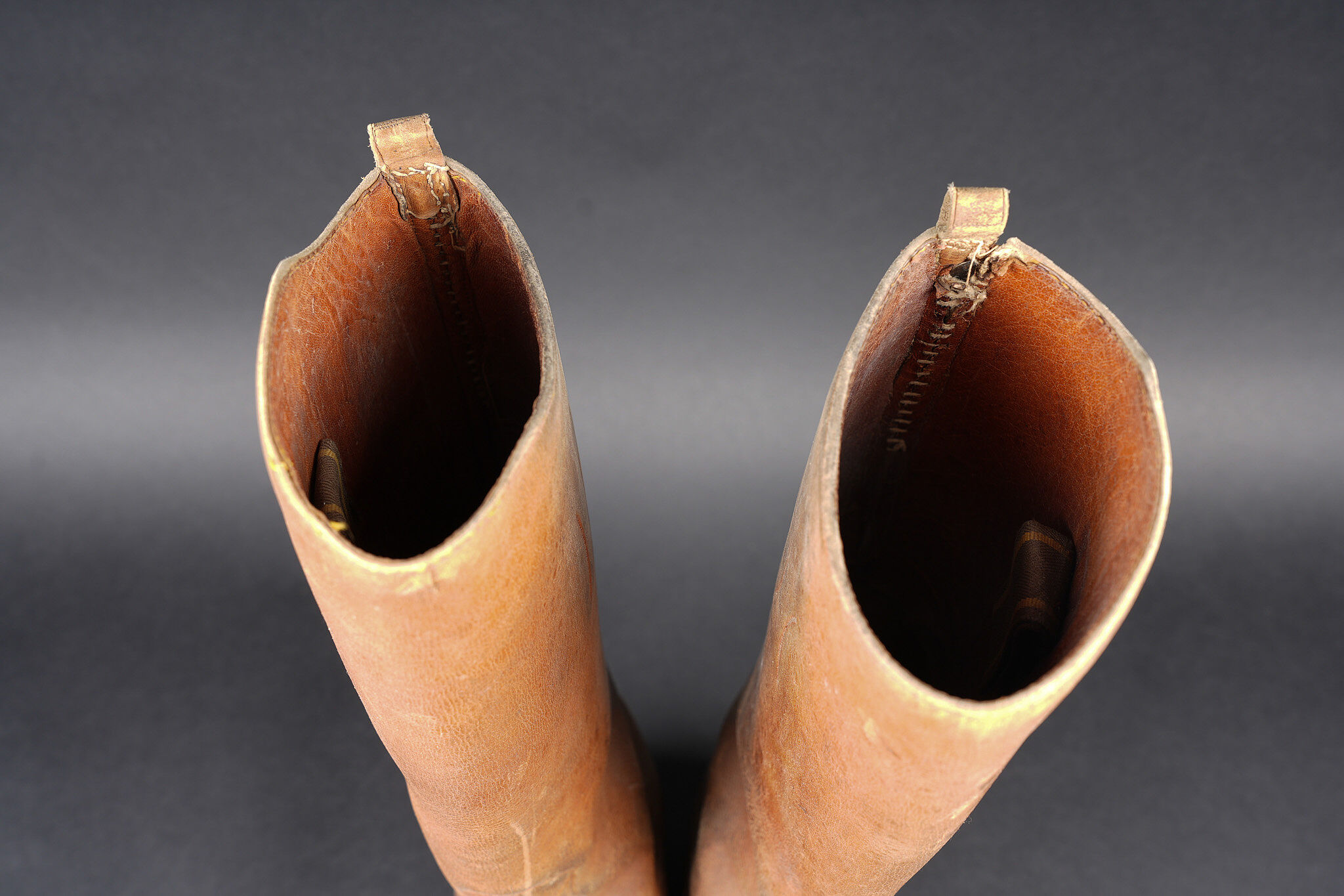 Paire de bottes coloniales. En cuir fauve et à bouts rapportés, laçage uniquement sur la partie basse. La botte droite ne possède plus qu’une seule tirette. Hauteur 43cm, Semelle 29cm. Coutures accidentées en haut de la tige de la botte gauche. Pair of colonial boots. Fawn leather with reinforced toes, lacing only on the lower section. Right boot retaining only one pull-tab. Height 43 cm, sole length 29 cm. Damaged stitching at the top of the left boot.