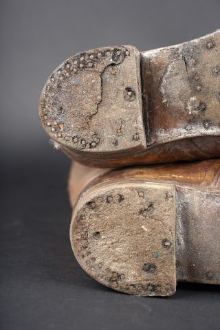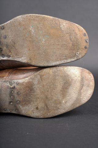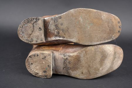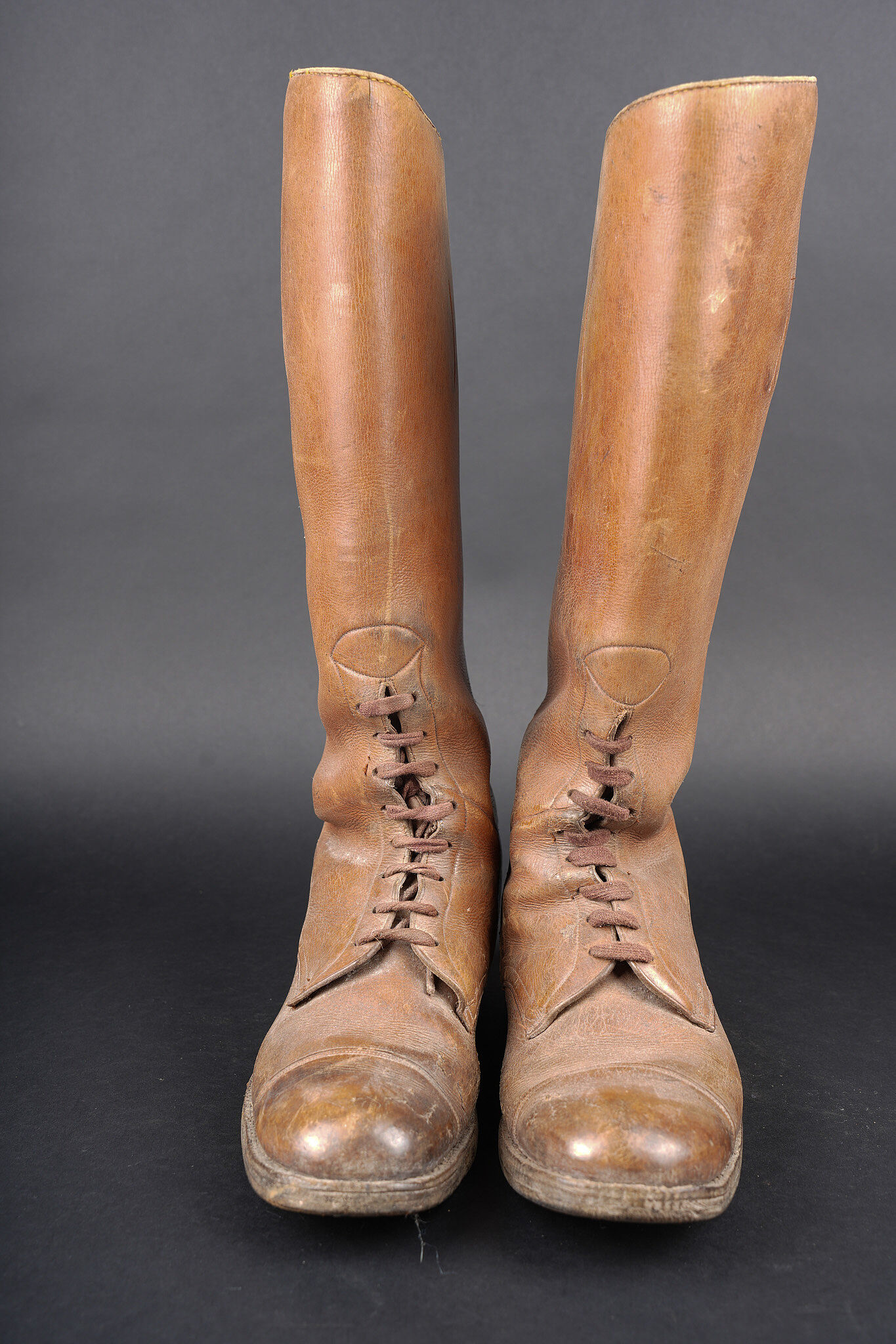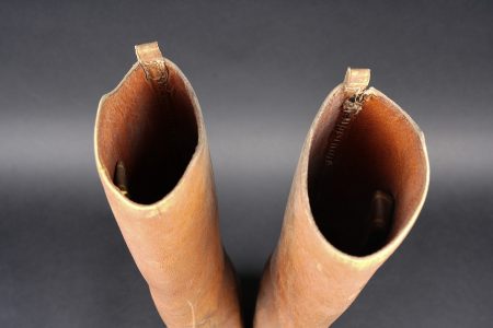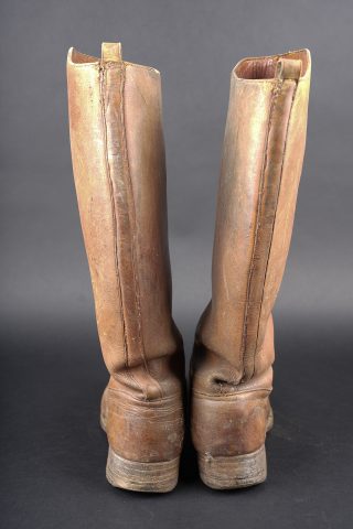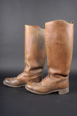 Paire de bottes coloniales. En cuir fauve et à bouts rapportés, laçage uniquement sur la partie basse. La botte droite ne possède plus qu’une seule tirette. Hauteur 43cm, Semelle 29cm.... en savoir plus