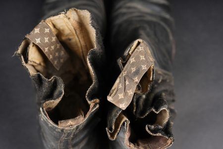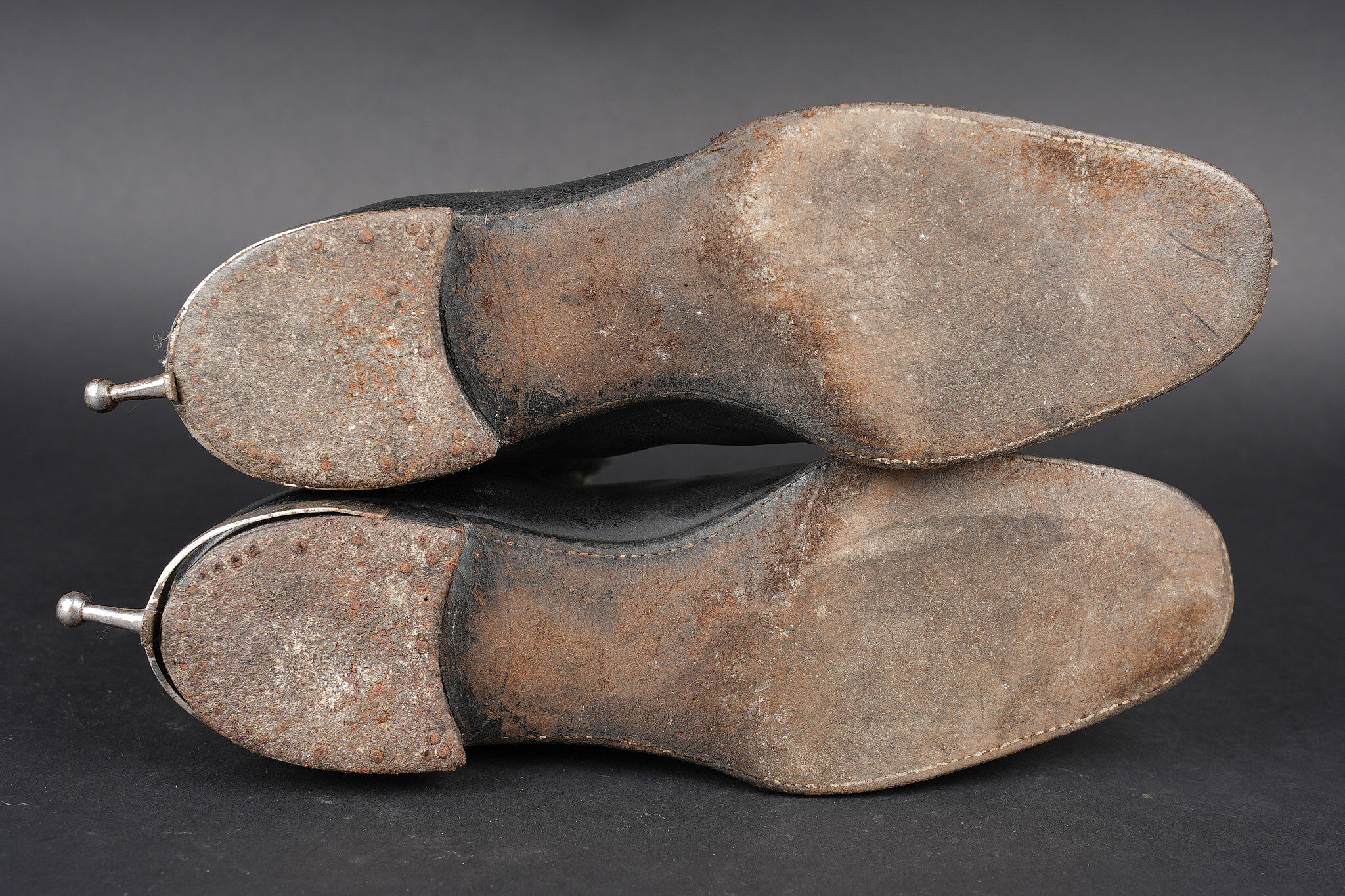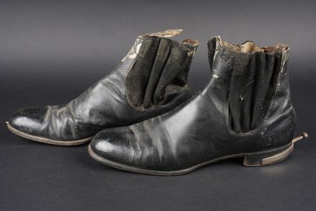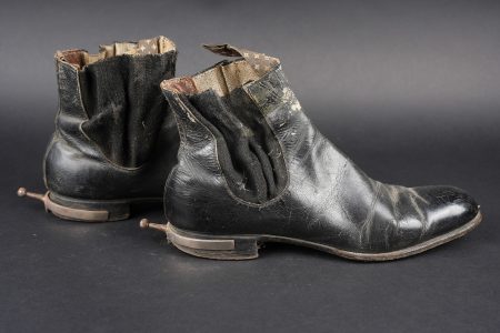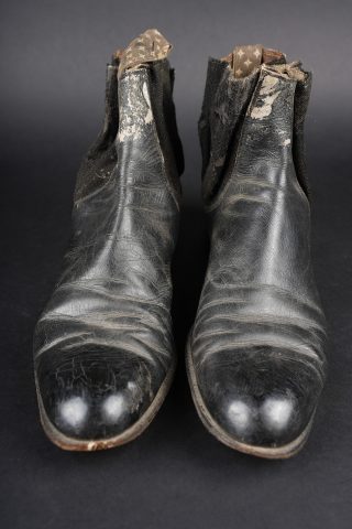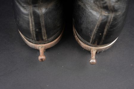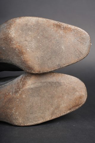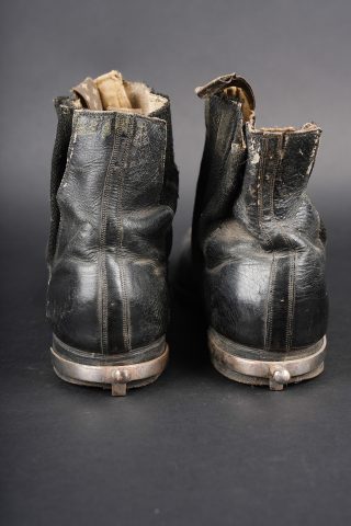 Détails de la vente >Paire de bottines 1931. En cuir noir vernis pour la grande tenue, élastiques aux chevilles en bon état général. Tirettes présentes ainsi que les éperons, doublure en coton écru. Semelles... en savoir plus