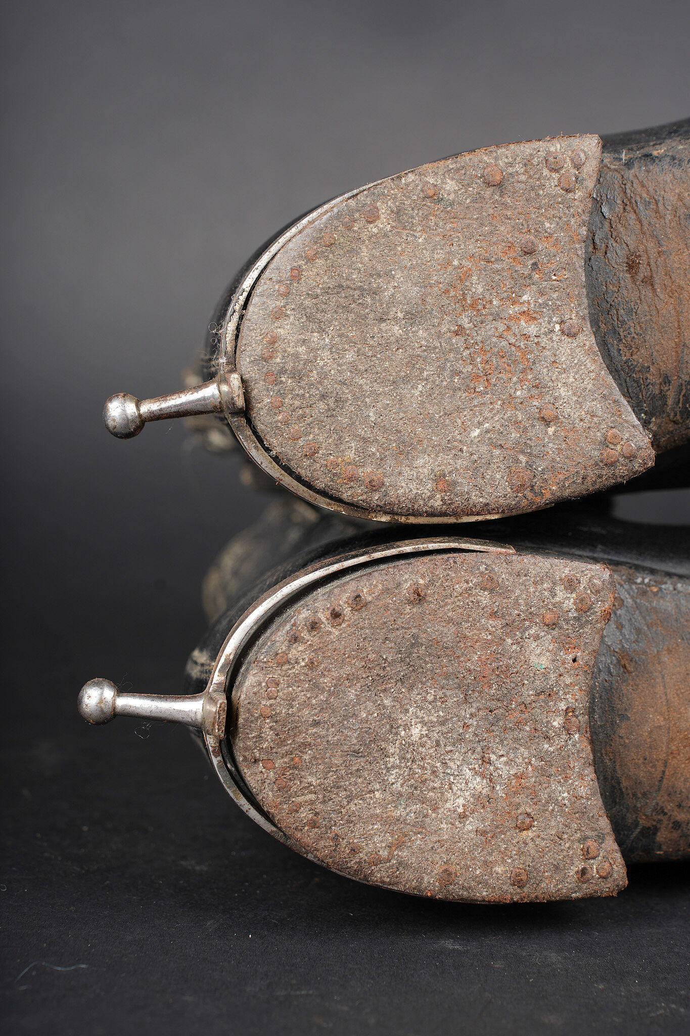 Paire de bottines 1931. En cuir noir vernis pour la grande tenue, élastiques aux chevilles en bon état général. Tirettes présentes ainsi que les éperons, doublure en coton écru. Semelles... en savoir plus