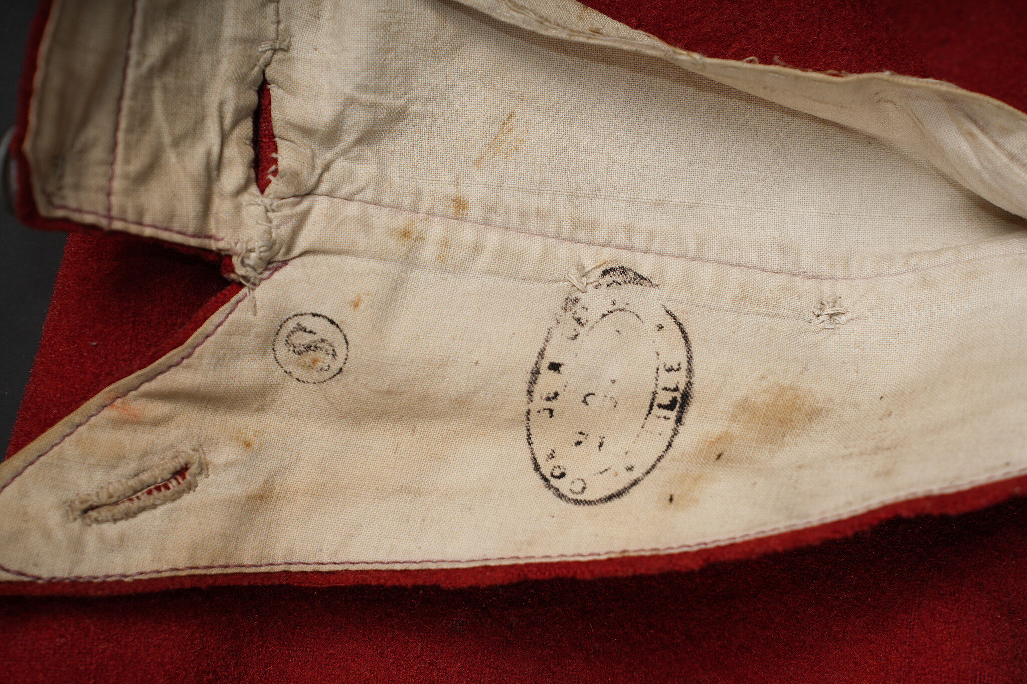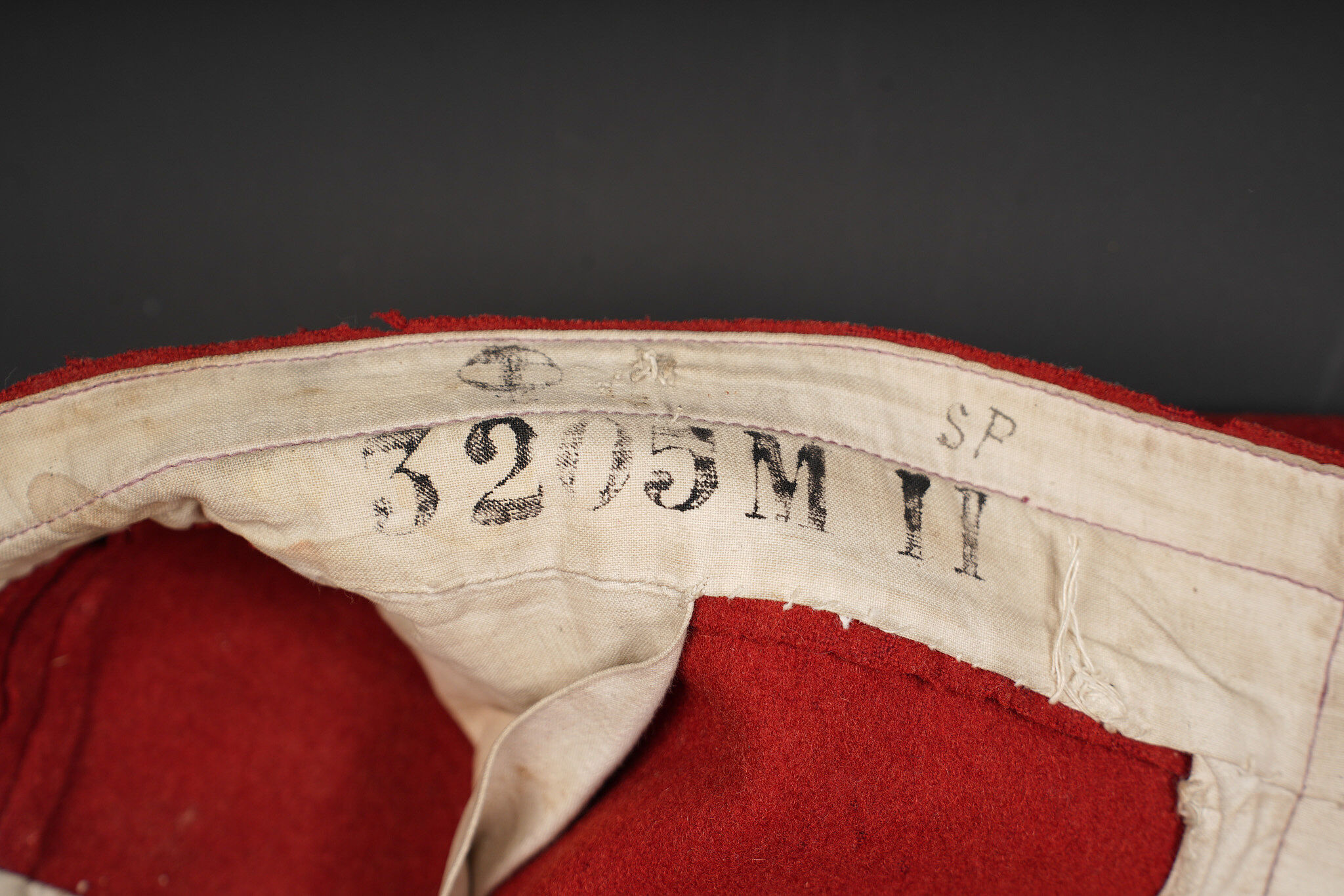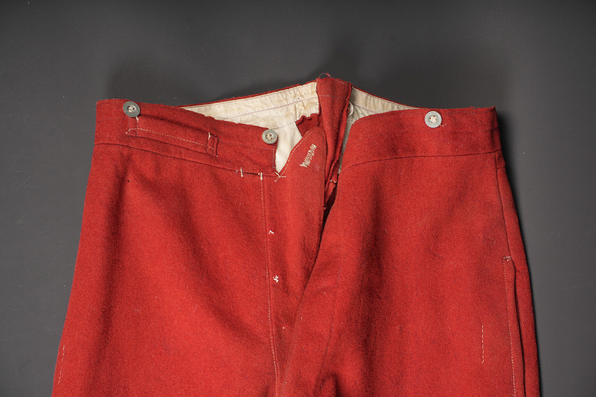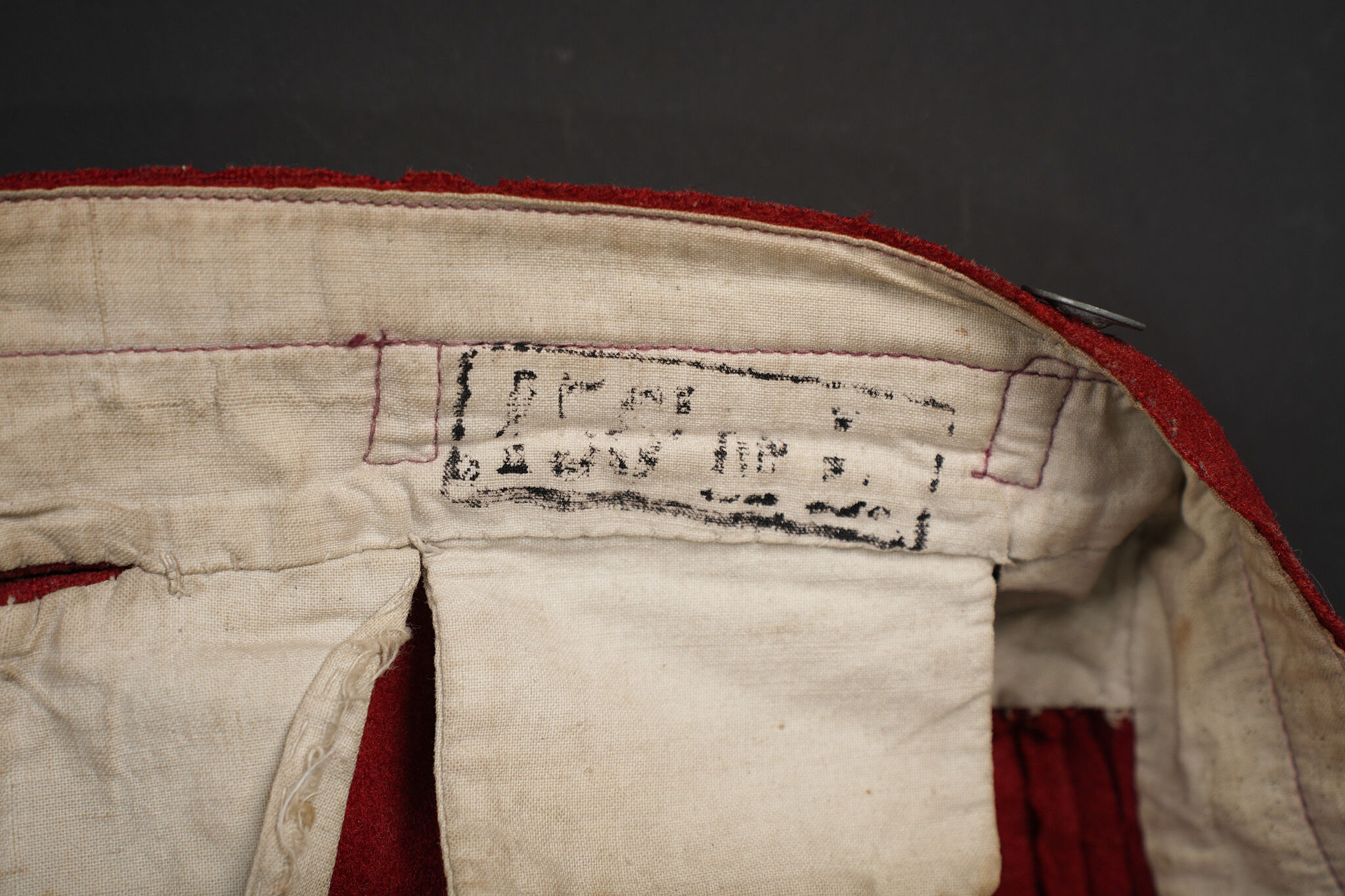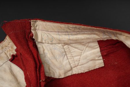Pantalon 1867 troupe. En drap garance possédant encore ses pattes à l’intérieur des poches, martingale présente. Se fermant par cinq boutons dont un seul est présent. Doublure en coton écru portant le tampon du 158ème de ligne, tampon de réception présent mais illisible, tampon de fabricant indiquant l’année 1888. Trousers Model 1867 other ranks. Garance cloth with internal pocket tabs still present and rear martingale. Five button front with only one remaining. Ecru cotton lining stamped 158th Line with a reception stamp illegible and a maker stamp dated 1888.
