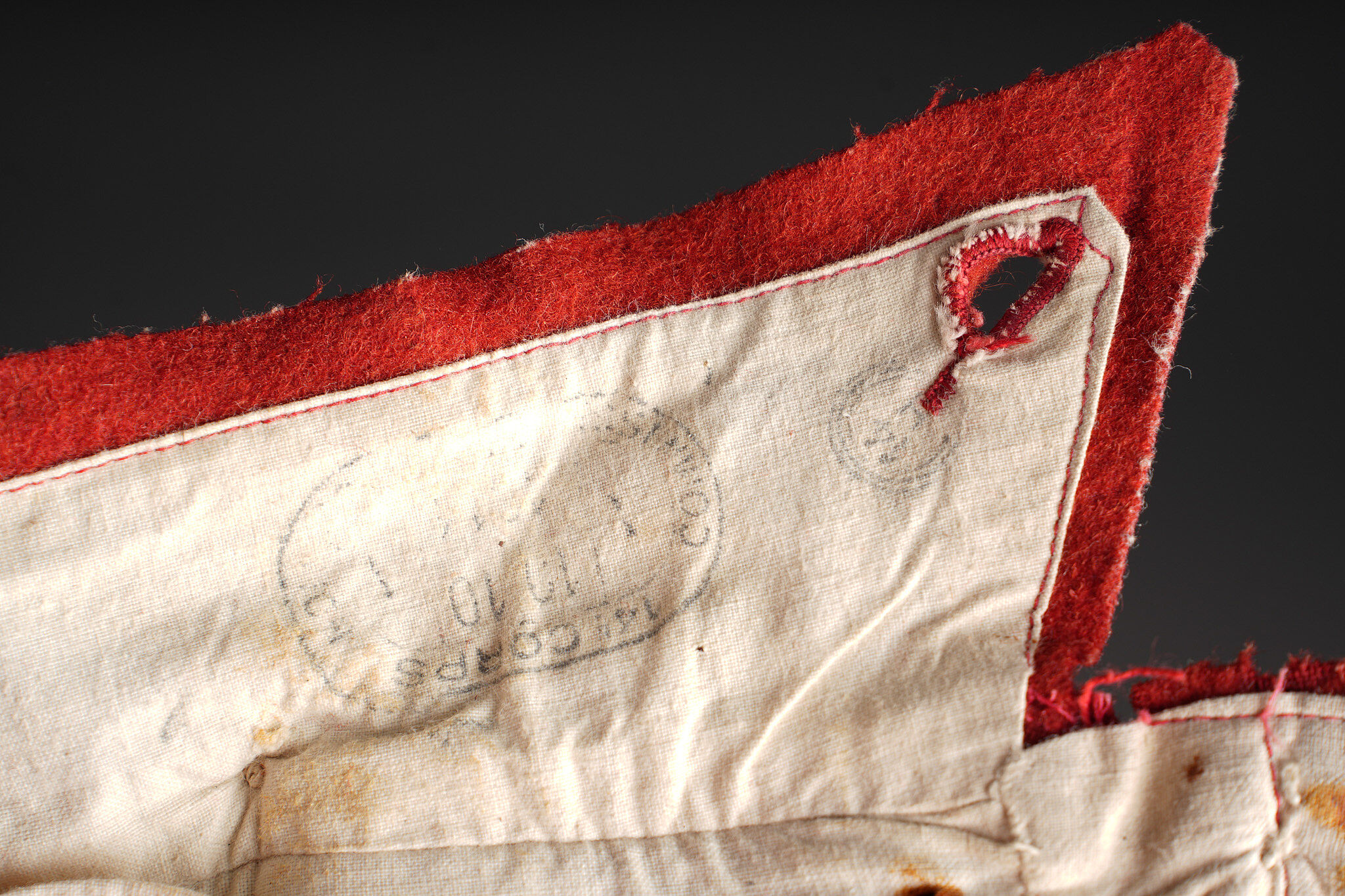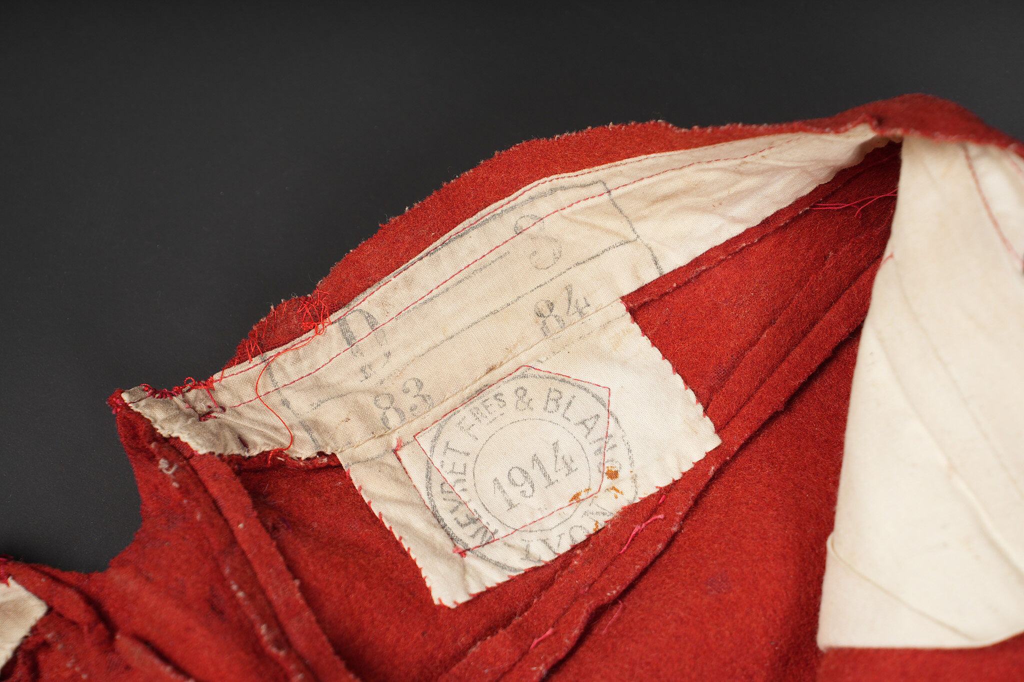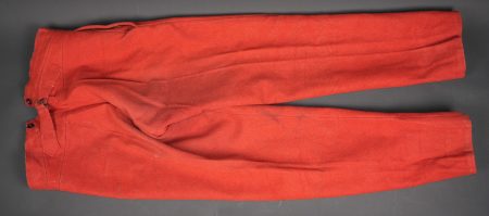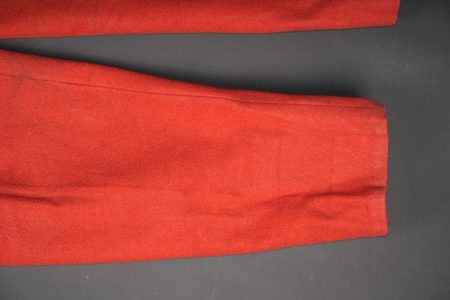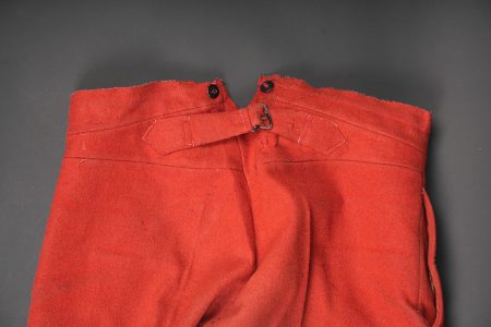 Pantalon 1867 troupe. En drap garance, pattes à l’intérieur des poches supprimées, martingales présentes. Le pantalon se ferme à l’aide de cinq boutons et un crochet. Doublure en coton écru possédant un tampon de fabricant 1914, tampon de réception daté 1914 également et un tampon de taille. Pièce en bon état général. Other ranks’ trousers Model 1867. Madder red cloth, internal pocket tabs removed, rear martingale straps present. Closure by five buttons and one hook. Ecru cotton lining with maker’s stamp dated 1914, acceptance stamp dated 1914 and size stamp. Overall good condition.