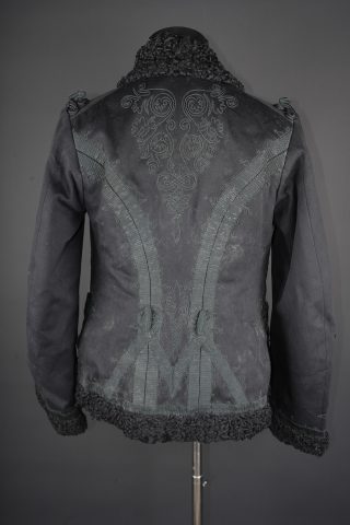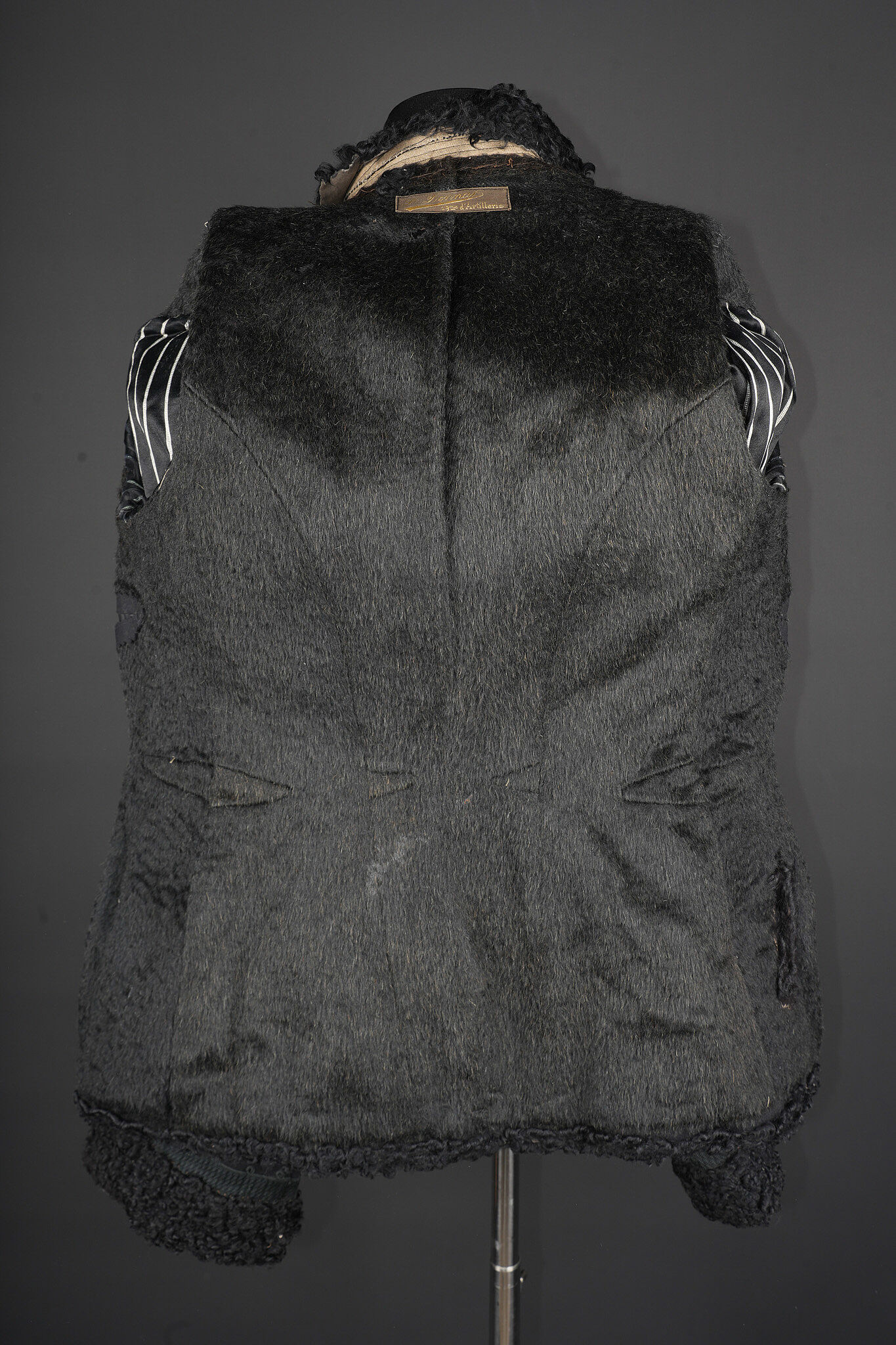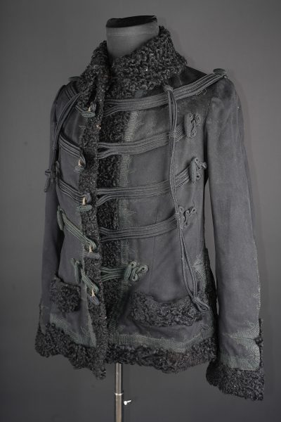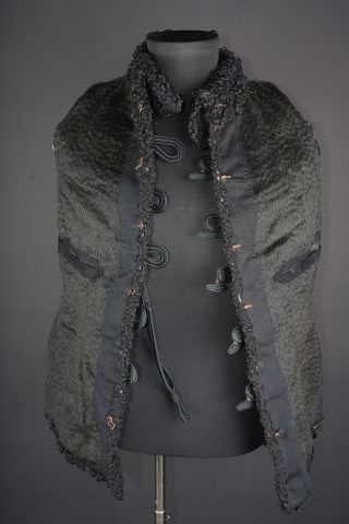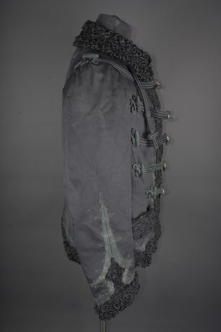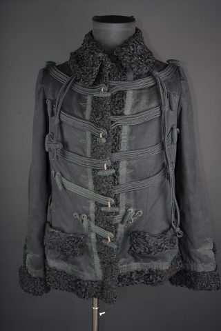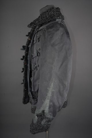Pelisse d’officier en astracan. Pelisse destinée aux officiers supérieurs, fabriquée en fin drap noir garni de cinq brandebourgs à quatre brins de tresse noires terminant par des... en savoir plus