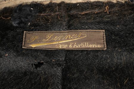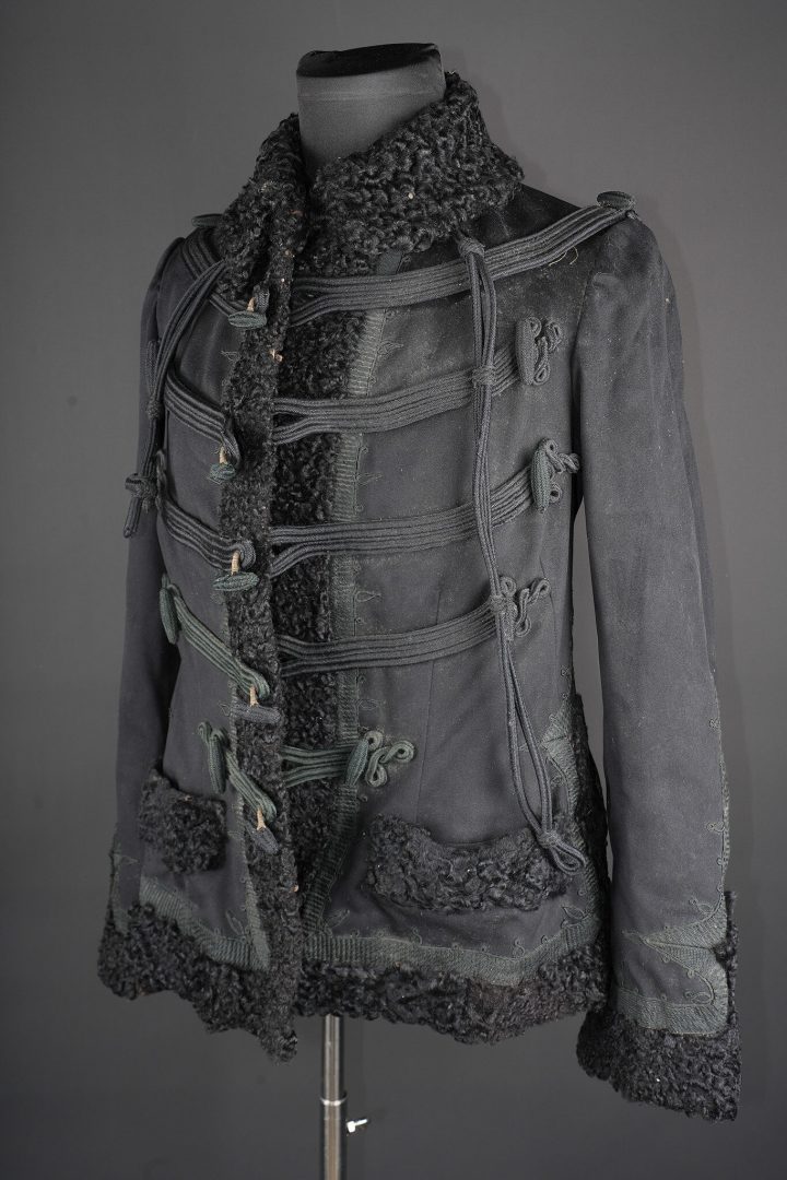 Pelisse d’officier en astracan. Pelisse destinée aux officiers supérieurs, fabriquée en fin drap noir garni de cinq brandebourgs à quatre brins de tresse noires terminant par des trèfles et fermant par des olives. Le col, les parements et les poches sont en astracan, col de forme Saxe. Entièrement doublé en fourrure, cordon de fourragère présent. Peu courant effet pour officier. Astrakhan officer’s pelisse. Garment intended for senior officers, made of fine black cloth with five brandebourg froggings in four strands of black braid ending in trefoils and fastening with olives. Collar, cuffs and pockets in astrakhan, Saxon-style collar. Fully fur-lined, aiguillette cord present. A scarce officer’s item.