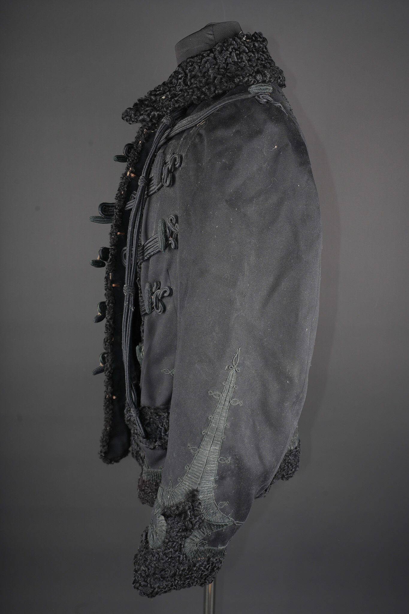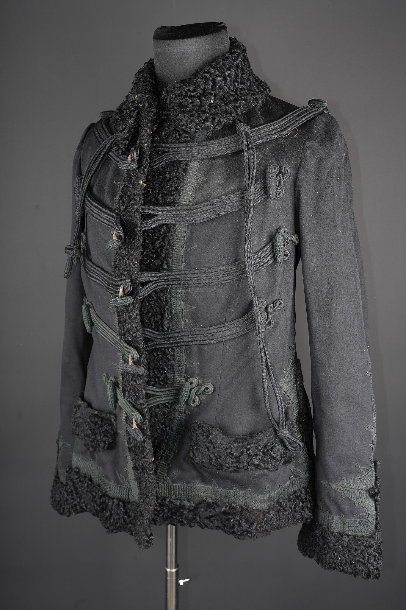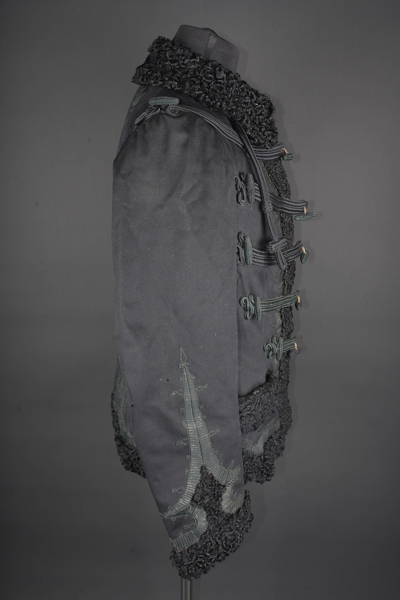 Détails de la vente >Pelisse d’officier en astracan. Pelisse destinée aux officiers supérieurs, fabriquée en fin drap noir garni de cinq brandebourgs à quatre brins de tresse noires terminant par des... en savoir plus