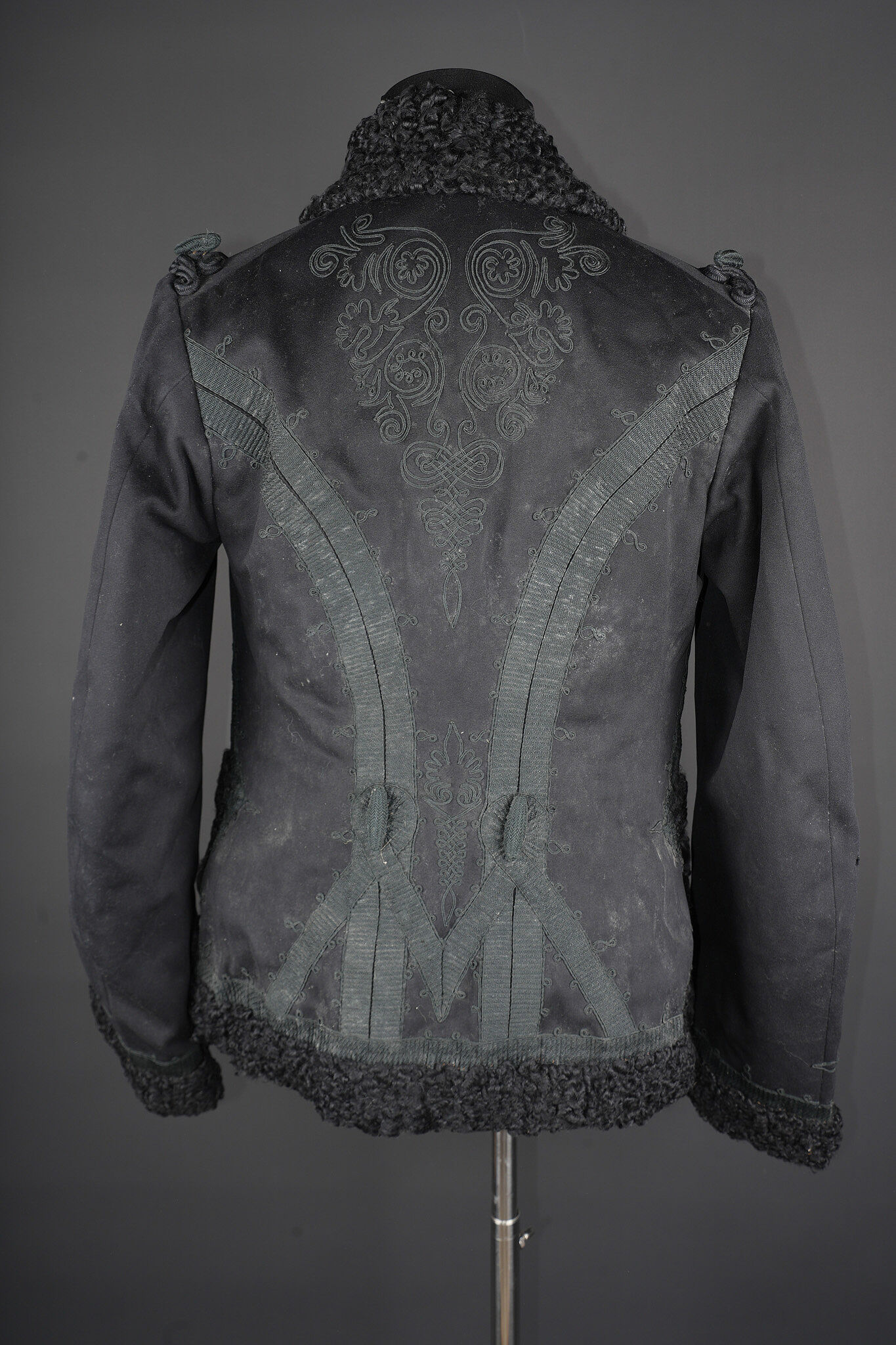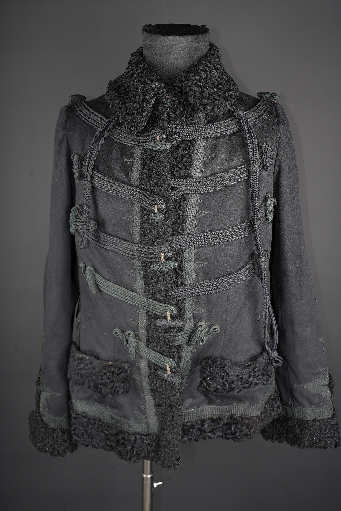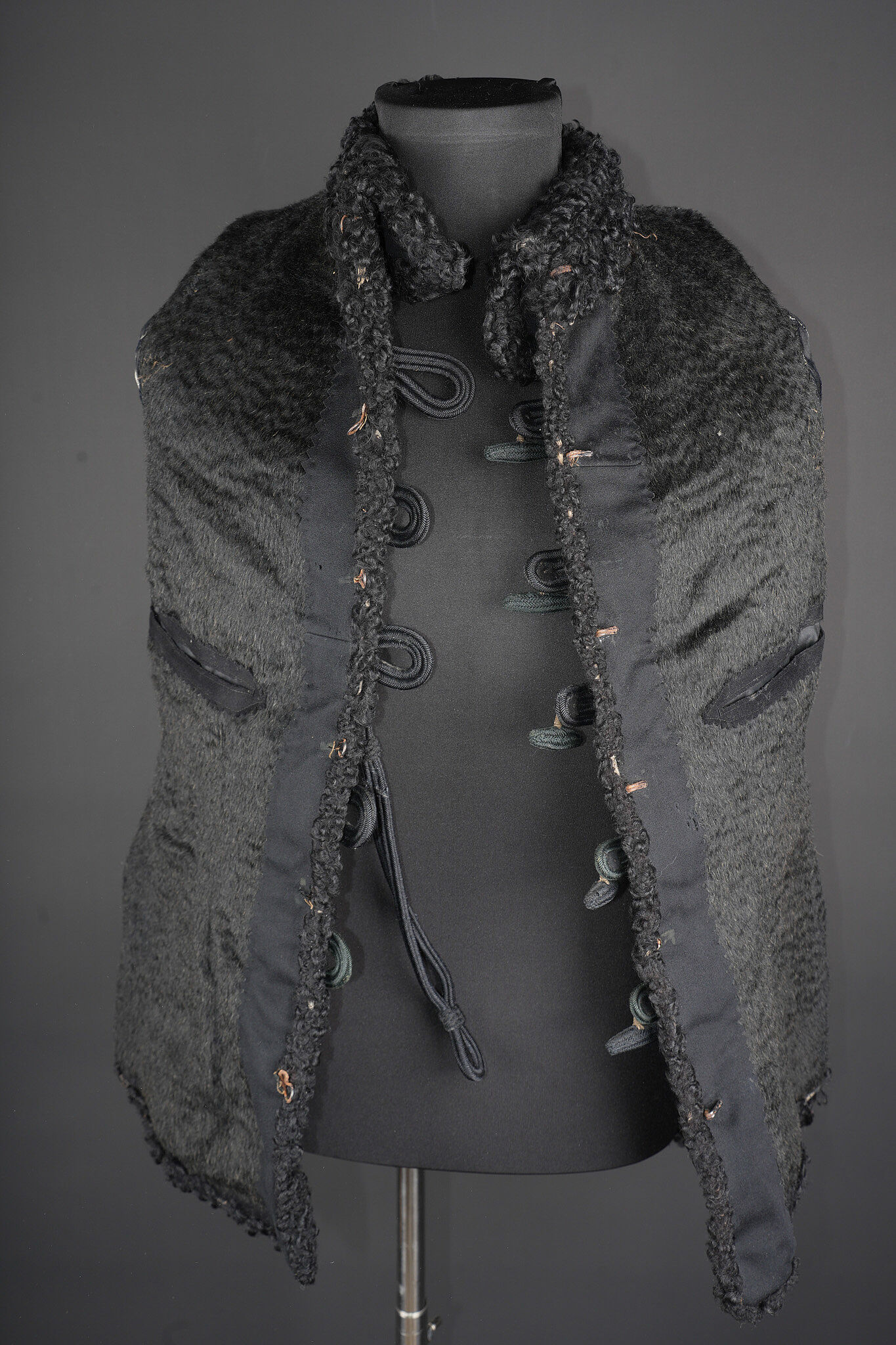 Détails de la vente >Pelisse d’officier en astracan. Pelisse destinée aux officiers supérieurs, fabriquée en fin drap noir garni de cinq brandebourgs à quatre brins de tresse noires terminant par des... en savoir plus