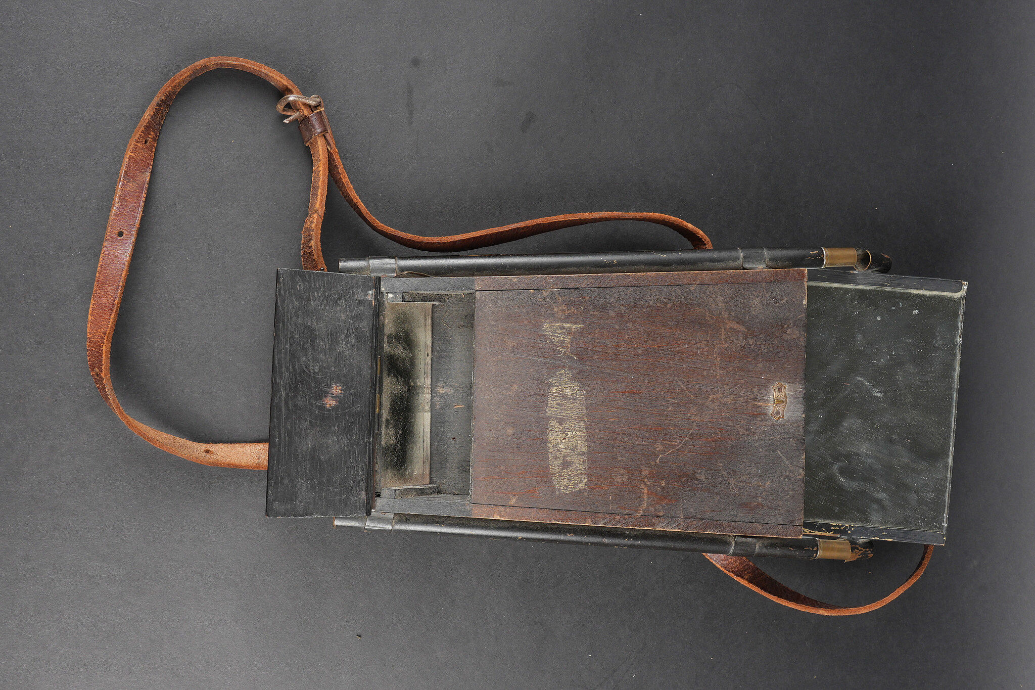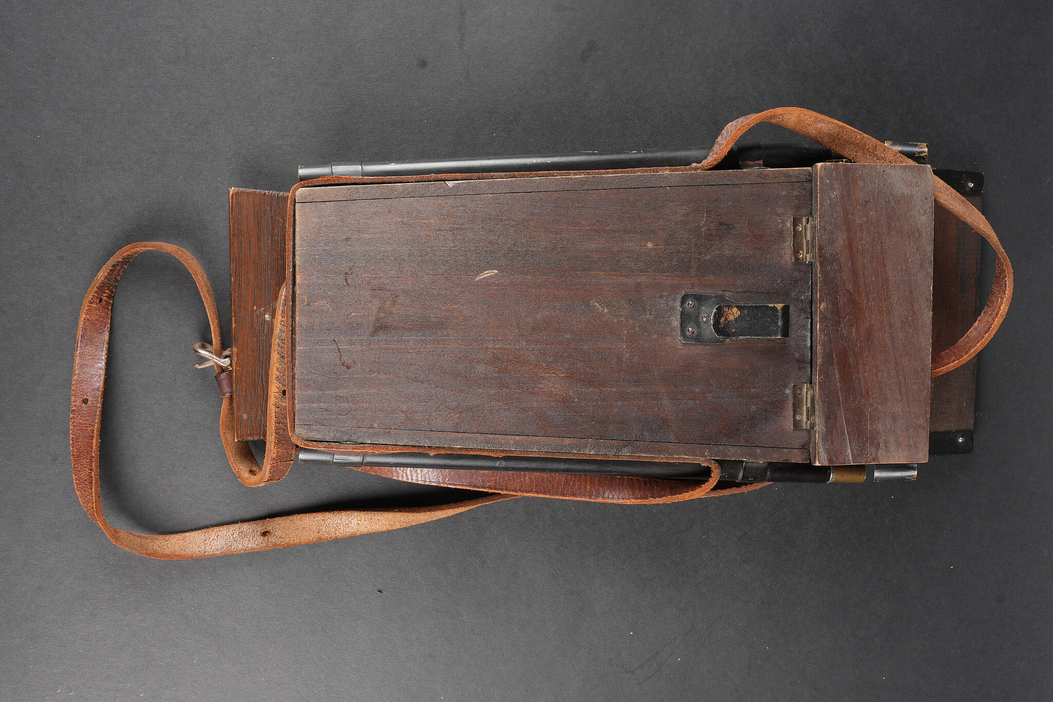 Périscope de tranchées. Petit périscope d’achat privé que se procuraient les officiers avant de partir au front, es miroirs sont présents ainsi que les deux pieds télescopiques. Coffre en bois, sangle en cuir d’origine avec un crochet de fixation pour le ceinturon. Trench periscope. Small private purchase periscope acquired by officers before departure for the front. Mirrors present as well as the two telescopic supports. Wooden case with original leather strap and belt hook.