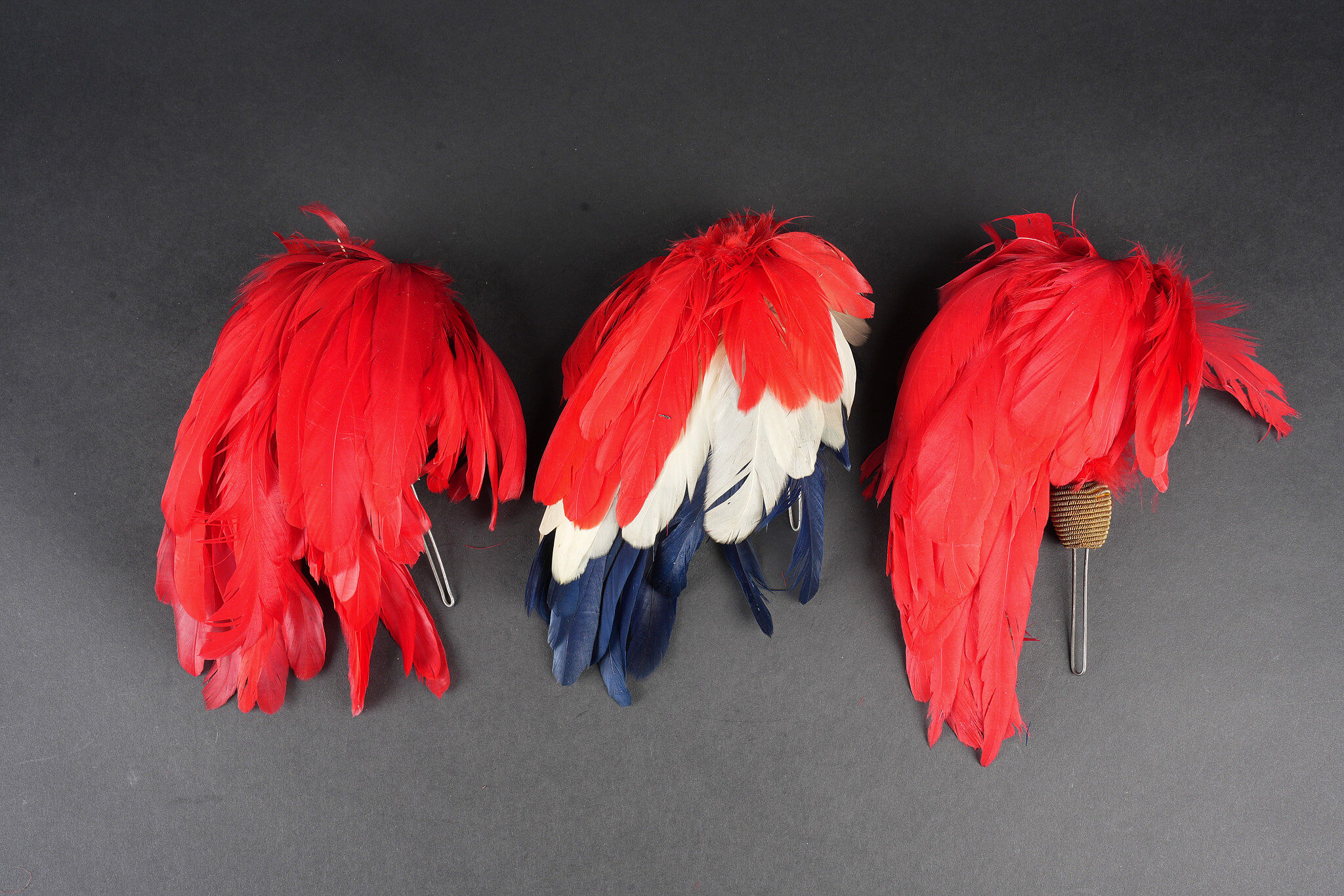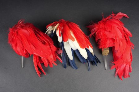 Plumets retombants. Deux plumets retombants rouges avec leur fixation et leurs olives. Un tricolore avec son système de fixation et son olive bleu foncée. Falling plumes. Two red falling plumes with their fittings and tulips, and one tricolour example with fixing system and dark blue tulip.