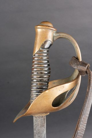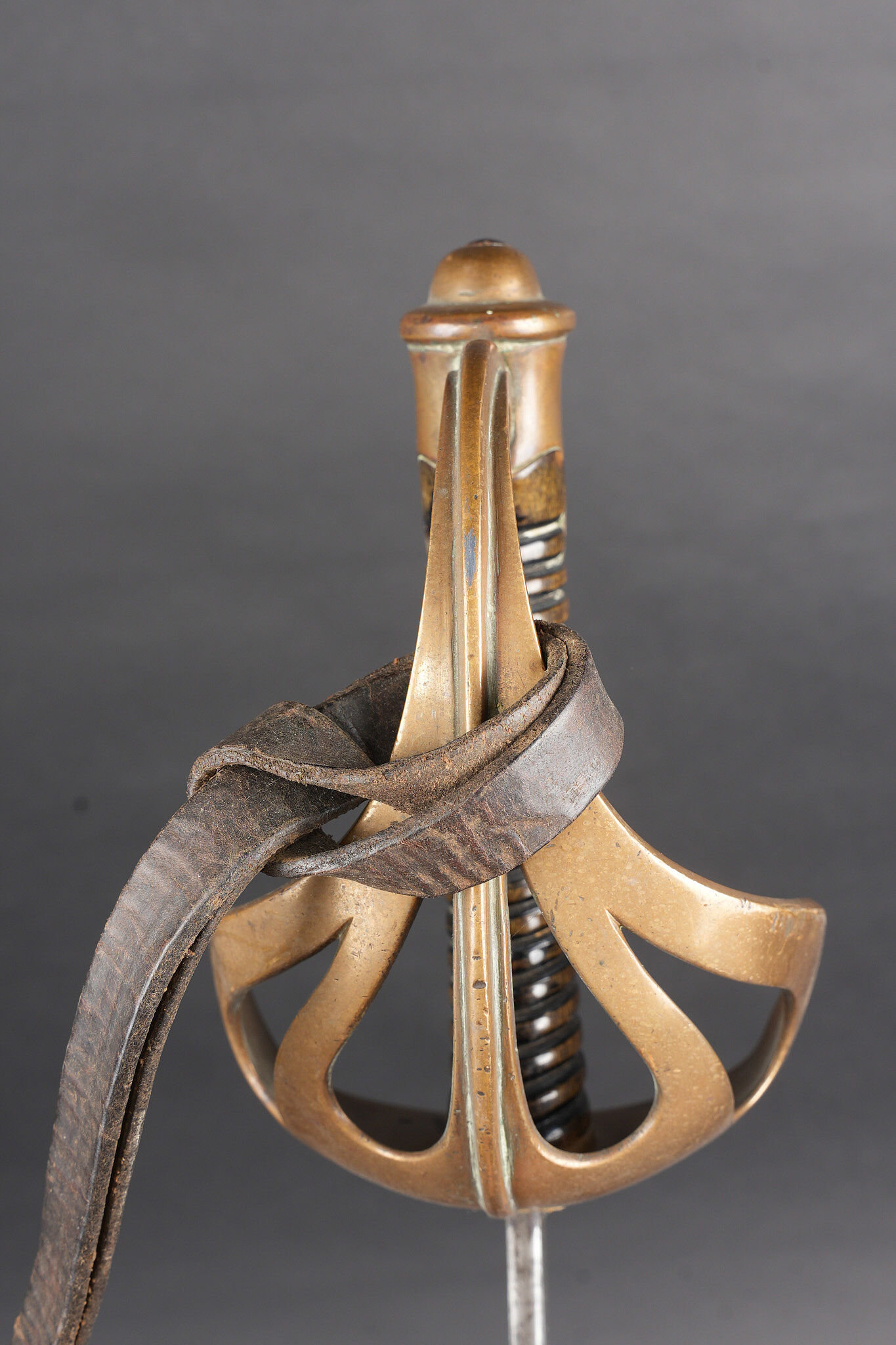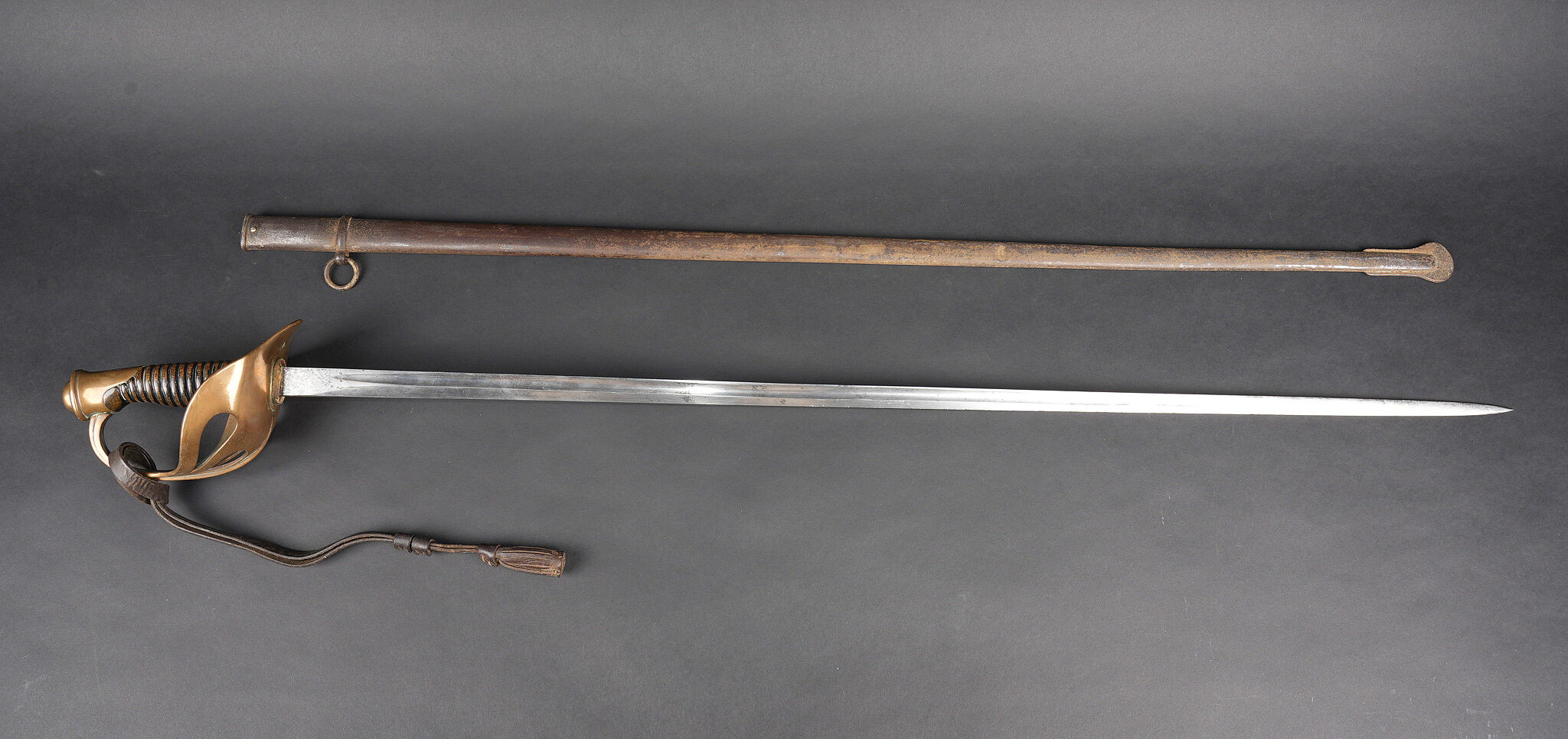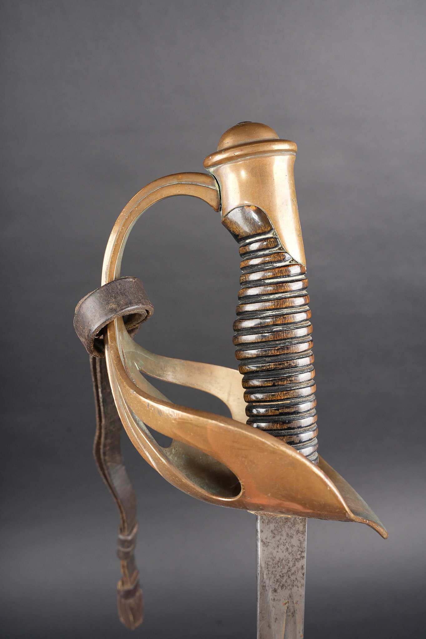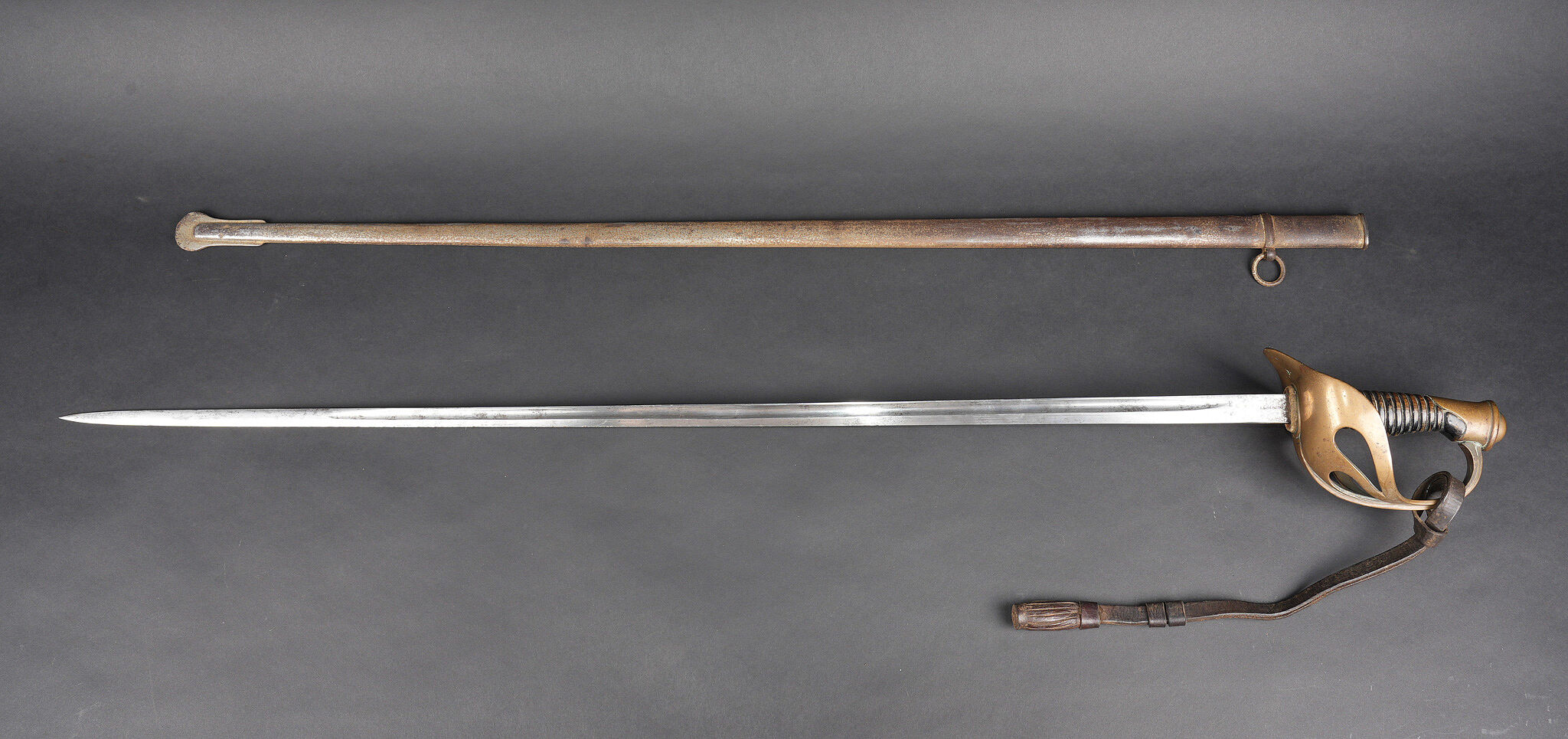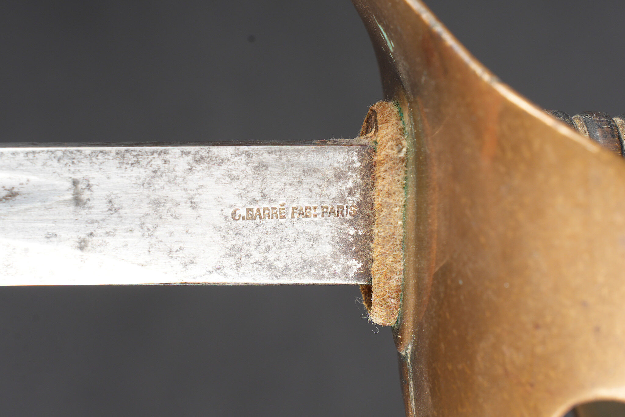 Sabre de cavalerie français modèle 1896 troupe. Monture laiton à coquille symétrique à 5 branches. Poignée en bois striée, filigrane absent. Calotte à courte queue, gravée des initiales PR. Lame de 94,5 cm, dos plat, marquée côté gauche du fourbisseur privé G. BARRE FABt PARIS, quelques traces de corrosion. Dragone cuir en bon état, avec matricule 25952 frappé sur le cordon. Fourreau fer terminé par un dard symétrique, un anneau de bélière. Légère corrosion, un coup. Bon état général. French Cavalry Sabre, Model 1896, Trooper Pattern Brass hilt with symmetrical five-branch guard. Ribbed wooden grip, wire binding absent. Short-tailed pommel engraved with initials PR. Flat-backed blade measuring 94.5 cm, left side marked G. BARRE FABt PARIS, private outfitter, with minor traces of corrosion. Leather sword knot in good condition, stamped with service number 25952 on the strap. Iron scabbard with symmetrical drag and single suspension ring. Light corrosion and one dent. Overall good condition.