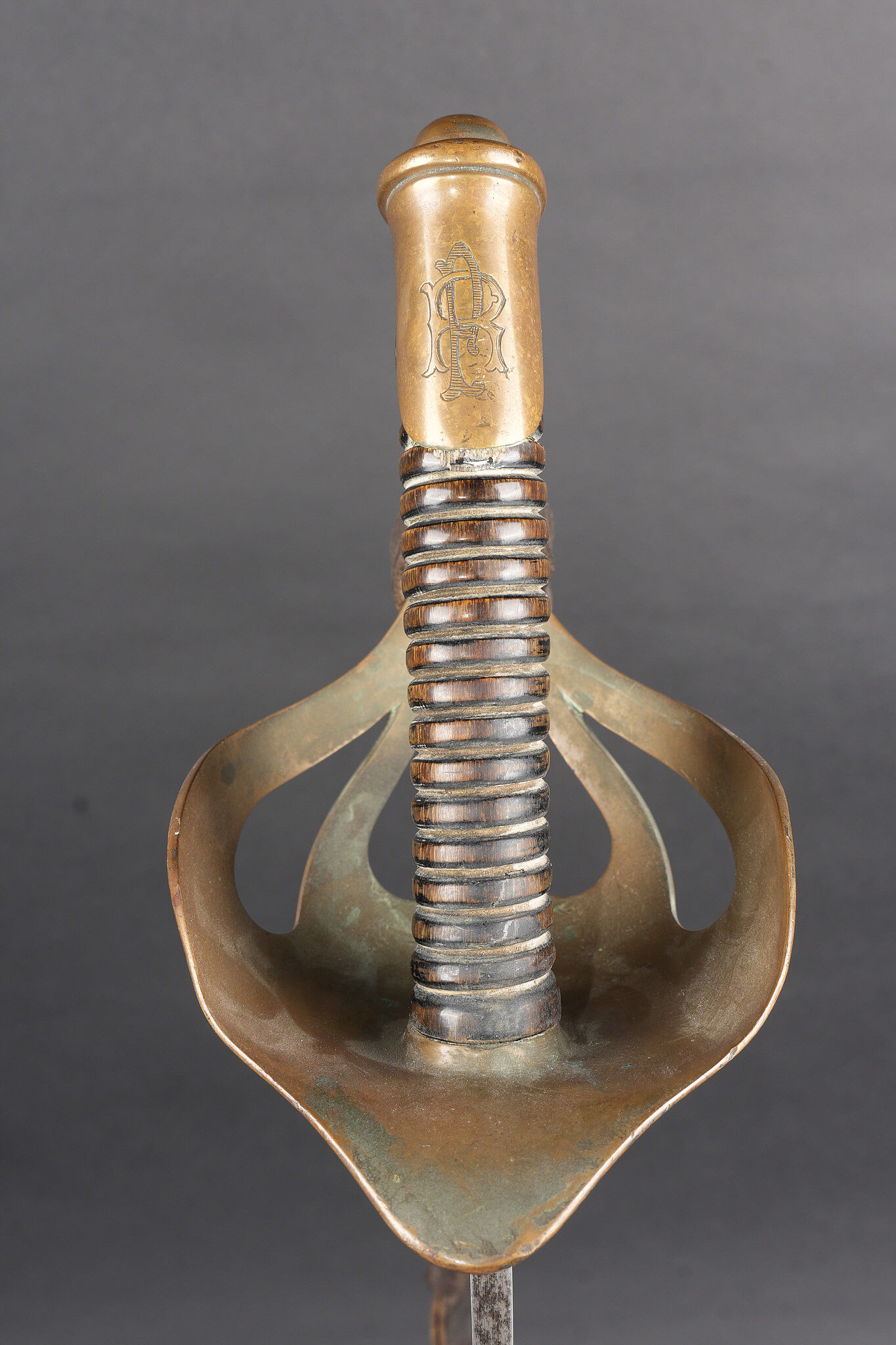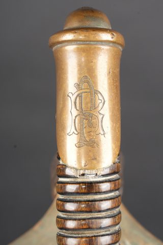 Détails de la vente >Sabre de cavalerie français modèle 1896 troupe. Monture laiton à coquille symétrique à 5 branches. Poignée en bois striée, filigrane absent. Calotte à courte queue, gravée des initiales... en savoir plus