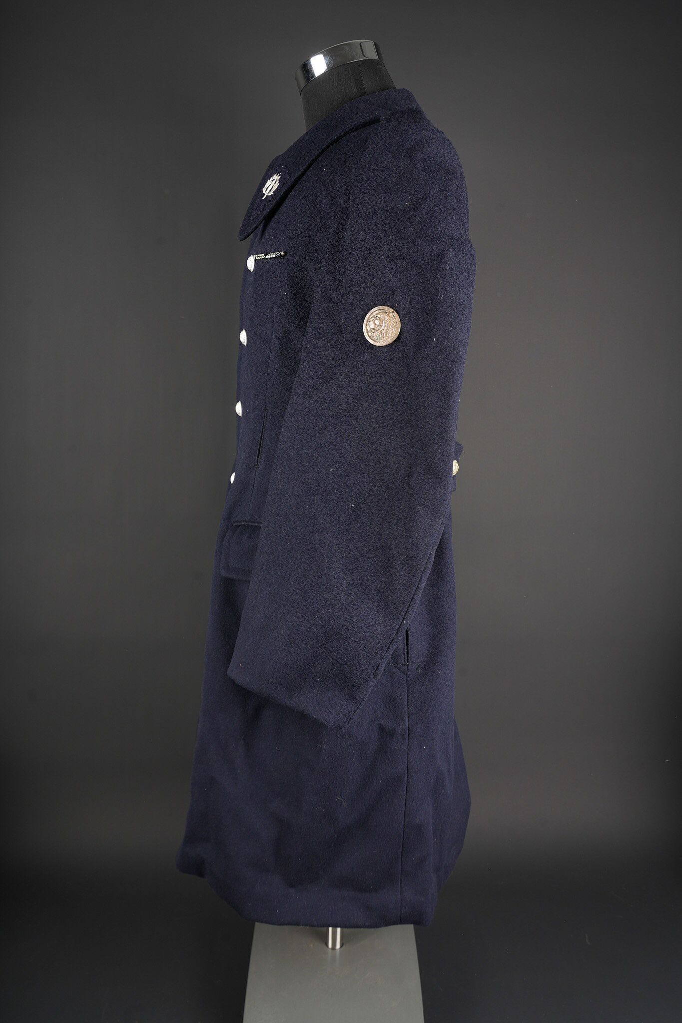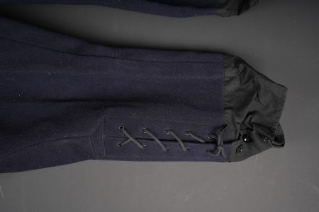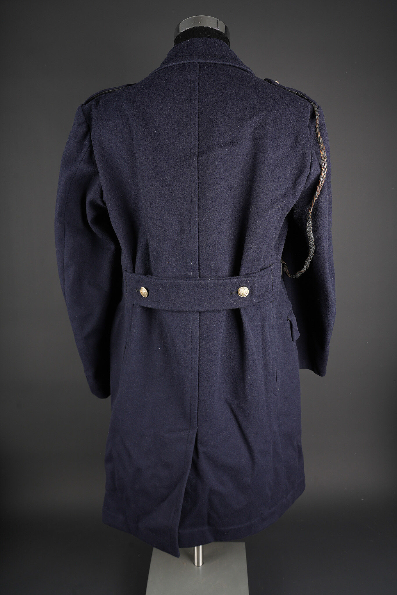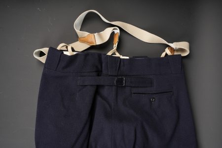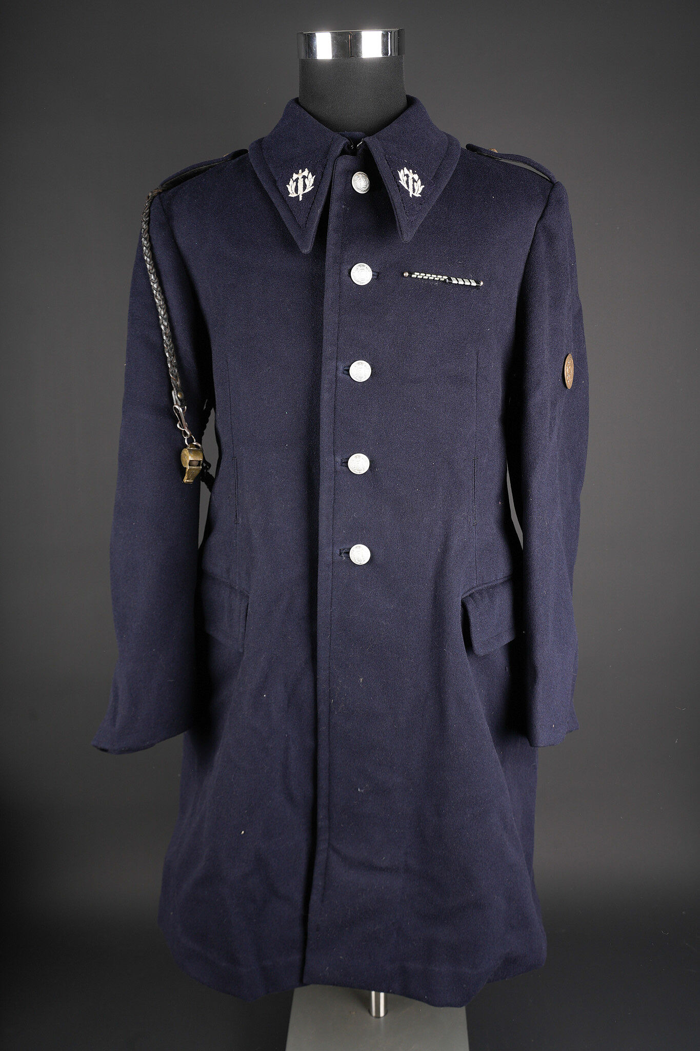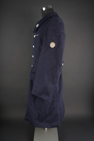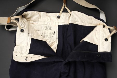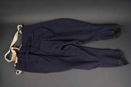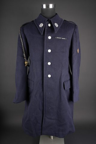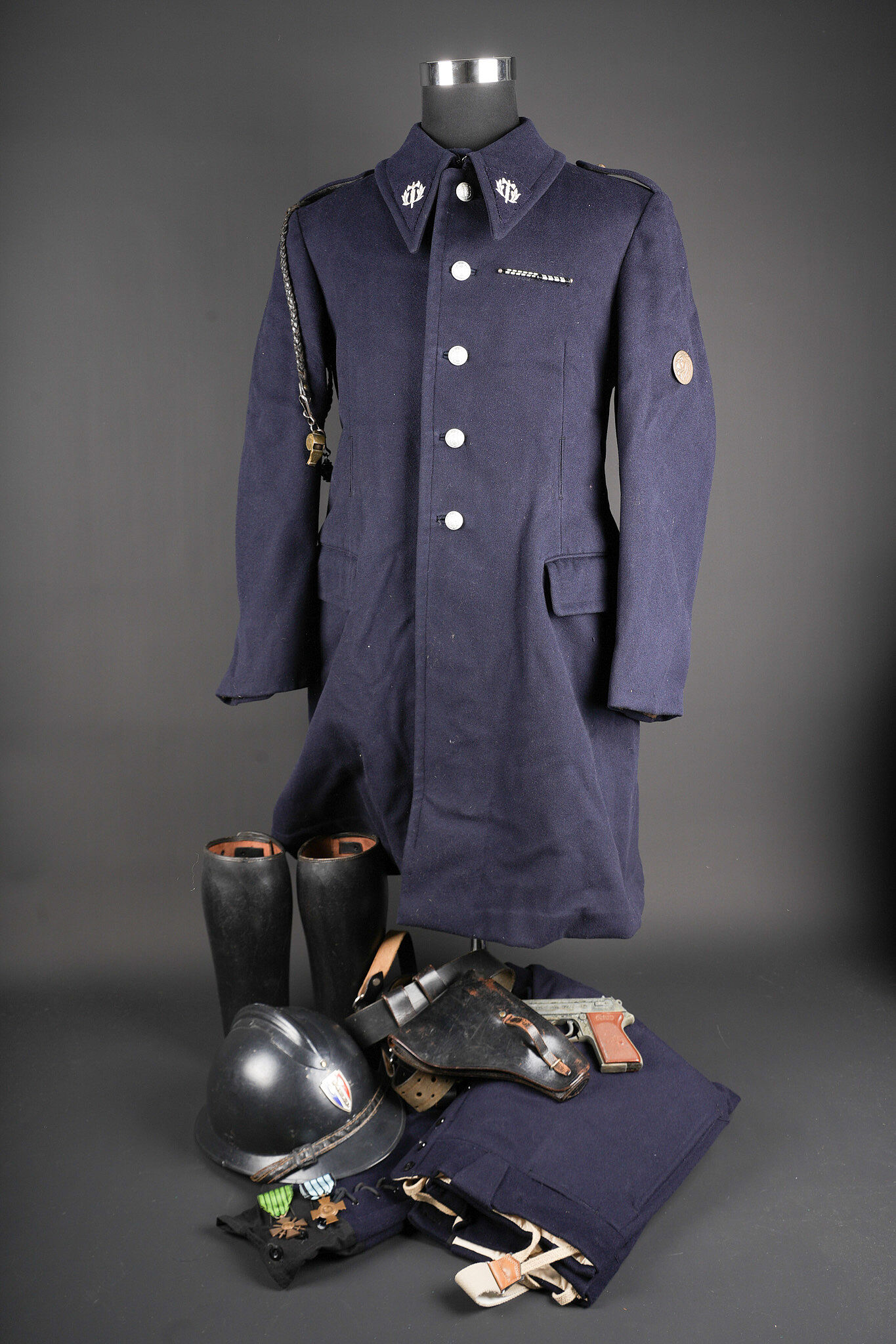 Tenue complète GMR. Comprenant un casque Adrian modèle 1926 reconditionné en noir et dont le cimier a été également reconditionné. Insigne de la police sous Vichy en métal émaillé avec francisque rapportée en métal possédant encore ses deux pattes d’origine. Coiffe en cuir noir de fabrication armistice, bandeau de laine kaki à huit agrafes. Jugulaire en simili cuir. Un manteau de GMR en laine bleue, pattes de col du modèle troupe brodées au fil de coton blanc. Sur le haut de la manche gauche est cousu l’insigne en métal des GMR à tête de lion. Effet se fermant par cinq boutons aux armes de la police d’Etat, doublure en satinette noire. Sur la poitrine sont fixés deux rappels de la Croix du combattant sous Vichy dans ses deux variantes. Sur l’épaule droite se trouve un cordon de cuir tressé retenant un sifflet orné de la francisque et des initiales P.N., dessoudé par endroits. Une culotte pantalon de fabrication armistice en drap de laine bleue, passants en trapèze, bas des jambes se fermant par lacets et trois boutons. Doublure en coton écru portant la taille 96L ainsi qu’un fabricant à Roubaix, avec ses bretelles. Effet parfaitement homogène avec le manteau. Une paire de guêtres noires en cuir, tamponnées 1943. Un ensemble ceinturon, baudrier et étui de pistolet pour PA MAB B, le tout en cuir noir. On y joint une Croix de guerre 1939 avec ruban vert Vichy et une Croix du combattant portant au revers les chiffres gravés 39-40, ruban dit du deuxième modèle sous Vichy. Tenue complète GMR. Comprising a Model 1926 Adrian helmet refurbished in black with the crest likewise refinished. Vichy period police badge in enamelled metal with applied francisque retaining its two original lugs. Armistice production black leather liner with khaki wool sweatband secured by eight clips. Simili leather chinstrap. Blue wool GMR greatcoat with other ranks pattern collar tabs embroidered in white cotton. On the upper left sleeve is sewn the metal GMR lion head badge. The garment fastens with five State Police buttons and is lined in black satinette. On the chest are two ribbon bars for the Vichy issue Combatant’s Cross in its two variants. On the right shoulder a braided leather lanyard retaining a whistle decorated with a francisque and the initials P.N., partly unsoldered. A pair of armistice manufacture breeches in blue wool with trapezoidal belt loops, lower legs closing by laces and three buttons, ecru cotton lining stamped size 96L and maker in Roubaix, complete with its braces. The set is perfectly matched to the greatcoat. A pair of black leather gaiters stamped 1943. A set consisting of belt, shoulder strap and pistol holster for MAB Model B automatic pistol in black leather. Included is a 1939 Croix de guerre with Vichy green ribbon and a Combatant’s Cross engraved 39-40 on the reverse with second pattern Vichy ribbon.