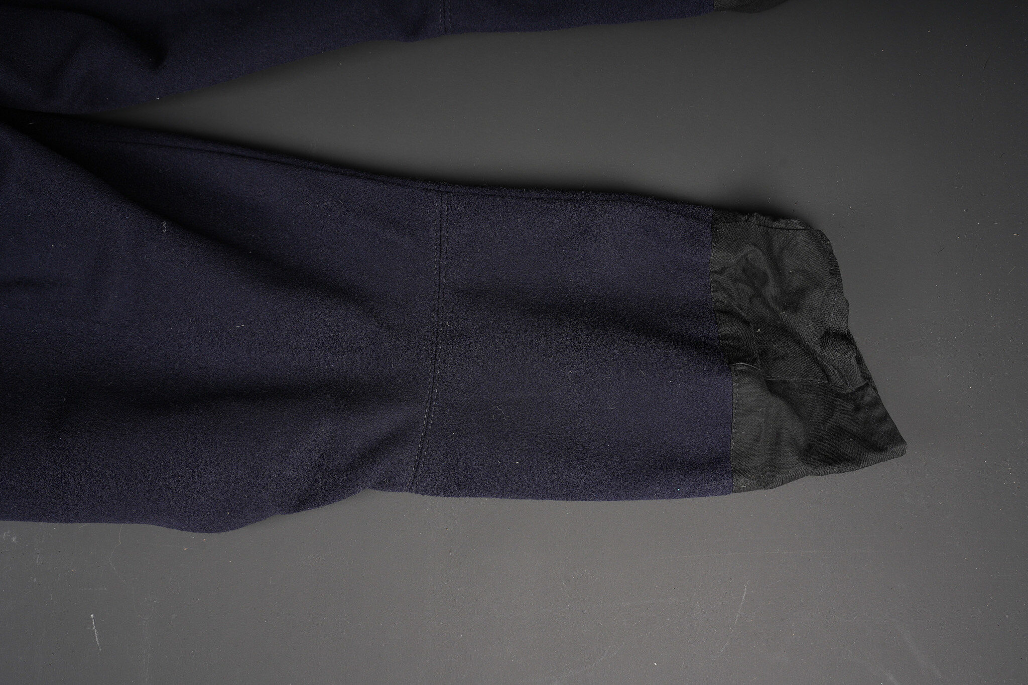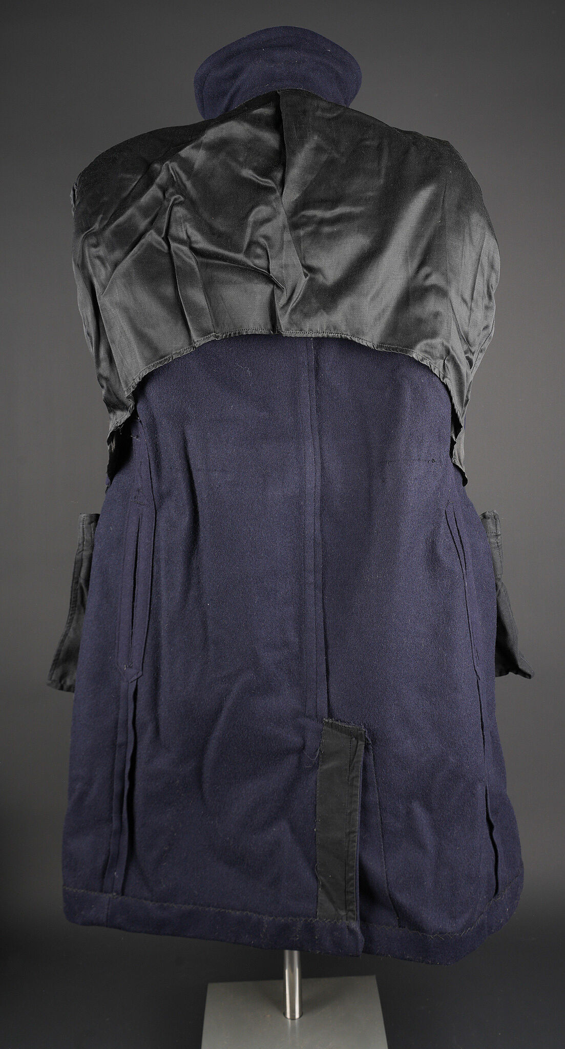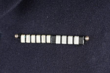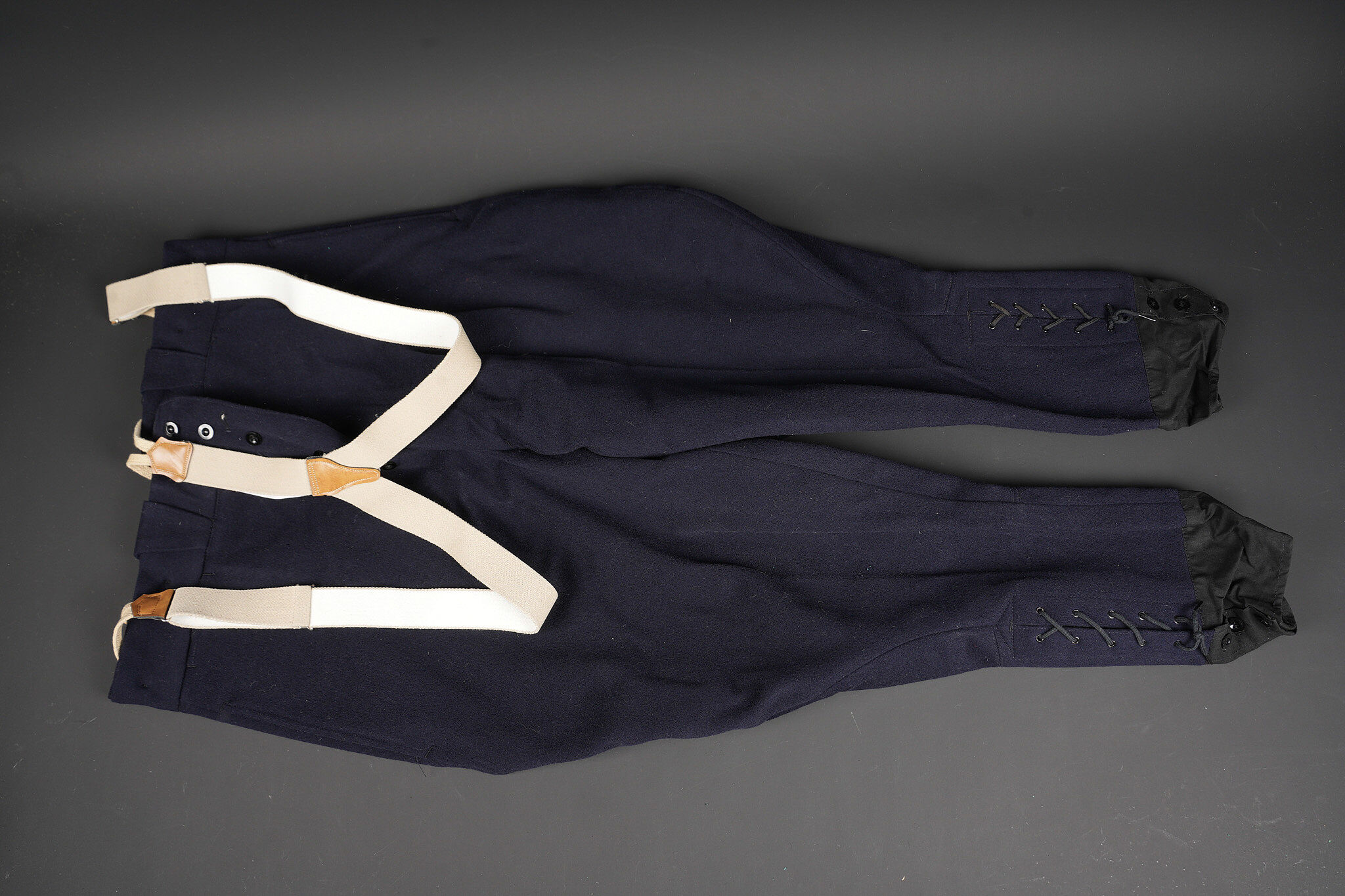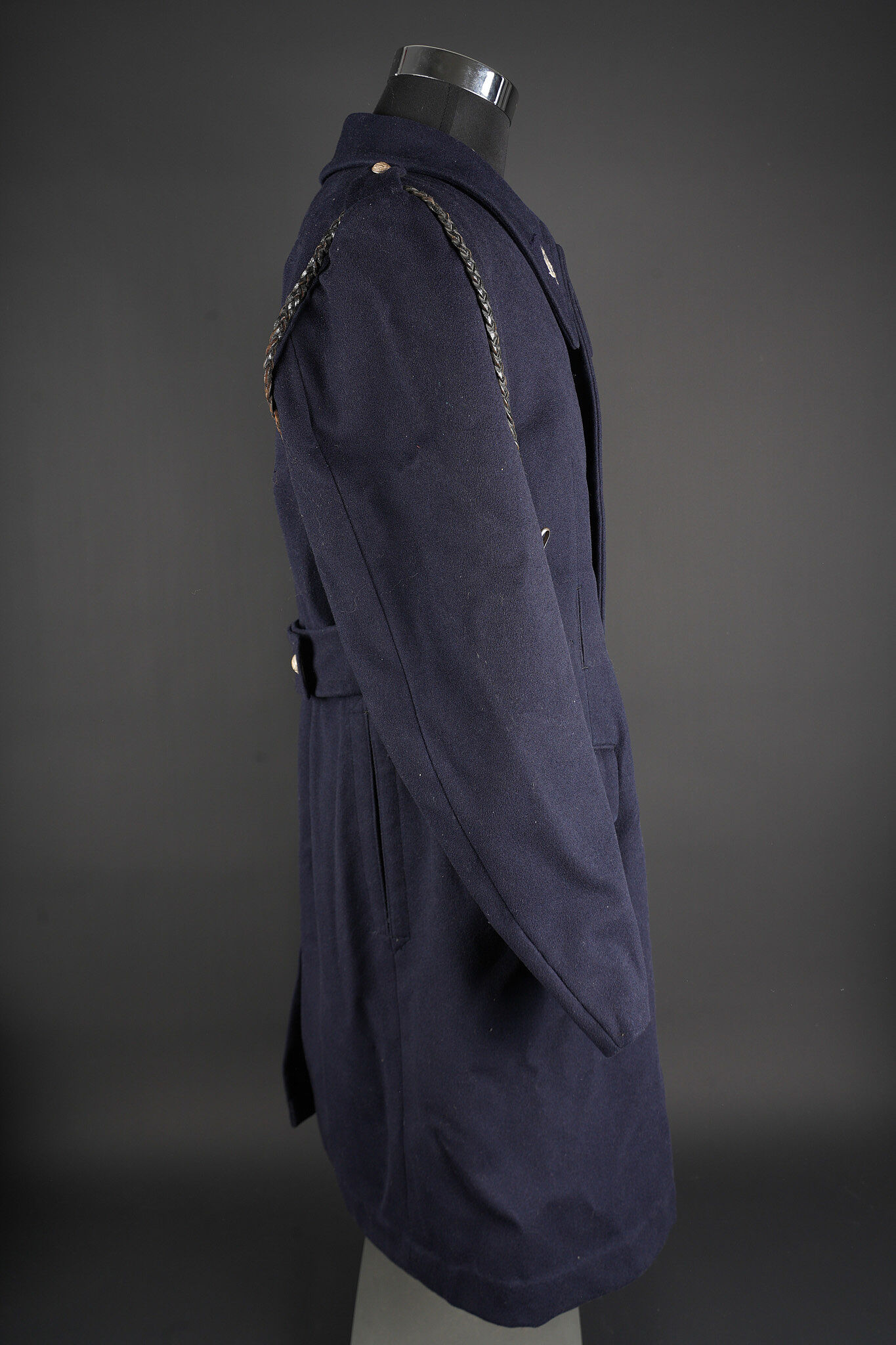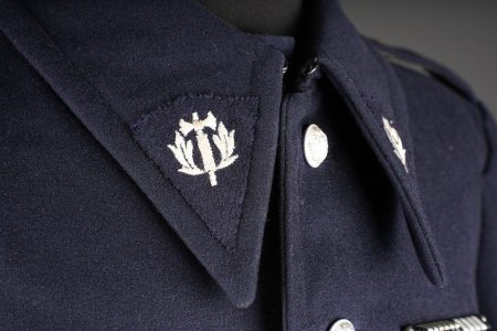 Tenue complète GMR. Comprenant un casque Adrian modèle 1926 reconditionné en noir et dont le cimier a été également reconditionné. Insigne de la police sous Vichy en métal émaillé avec francisque rapportée en métal possédant encore ses deux pattes d’origine. Coiffe en cuir noir de fabrication armistice, bandeau de laine kaki à huit agrafes. Jugulaire en simili cuir. Un manteau de GMR en laine bleue, pattes de col du modèle troupe brodées au fil de coton blanc. Sur le haut de la manche gauche est cousu l’insigne en métal des GMR à tête de lion. Effet se fermant par cinq boutons aux armes de la police d’Etat, doublure en satinette noire. Sur la poitrine sont fixés deux rappels de la Croix du combattant sous Vichy dans ses deux variantes. Sur l’épaule droite se trouve un cordon de cuir tressé retenant un sifflet orné de la francisque et des initiales P.N., dessoudé par endroits. Une culotte pantalon de fabrication armistice en drap de laine bleue, passants en trapèze, bas des jambes se fermant par lacets et trois boutons. Doublure en coton écru portant la taille 96L ainsi qu’un fabricant à Roubaix, avec ses bretelles. Effet parfaitement homogène avec le manteau. Une paire de guêtres noires en cuir, tamponnées 1943. Un ensemble ceinturon, baudrier et étui de pistolet pour PA MAB B, le tout en cuir noir. On y joint une Croix de guerre 1939 avec ruban vert Vichy et une Croix du combattant portant au revers les chiffres gravés 39-40, ruban dit du deuxième modèle sous Vichy. Tenue complète GMR. Comprising a Model 1926 Adrian helmet refurbished in black with the crest likewise refinished. Vichy period police badge in enamelled metal with applied francisque retaining its two original lugs. Armistice production black leather liner with khaki wool sweatband secured by eight clips. Simili leather chinstrap. Blue wool GMR greatcoat with other ranks pattern collar tabs embroidered in white cotton. On the upper left sleeve is sewn the metal GMR lion head badge. The garment fastens with five State Police buttons and is lined in black satinette. On the chest are two ribbon bars for the Vichy issue Combatant’s Cross in its two variants. On the right shoulder a braided leather lanyard retaining a whistle decorated with a francisque and the initials P.N., partly unsoldered. A pair of armistice manufacture breeches in blue wool with trapezoidal belt loops, lower legs closing by laces and three buttons, ecru cotton lining stamped size 96L and maker in Roubaix, complete with its braces. The set is perfectly matched to the greatcoat. A pair of black leather gaiters stamped 1943. A set consisting of belt, shoulder strap and pistol holster for MAB Model B automatic pistol in black leather. Included is a 1939 Croix de guerre with Vichy green ribbon and a Combatant’s Cross engraved 39-40 on the reverse with second pattern Vichy ribbon.