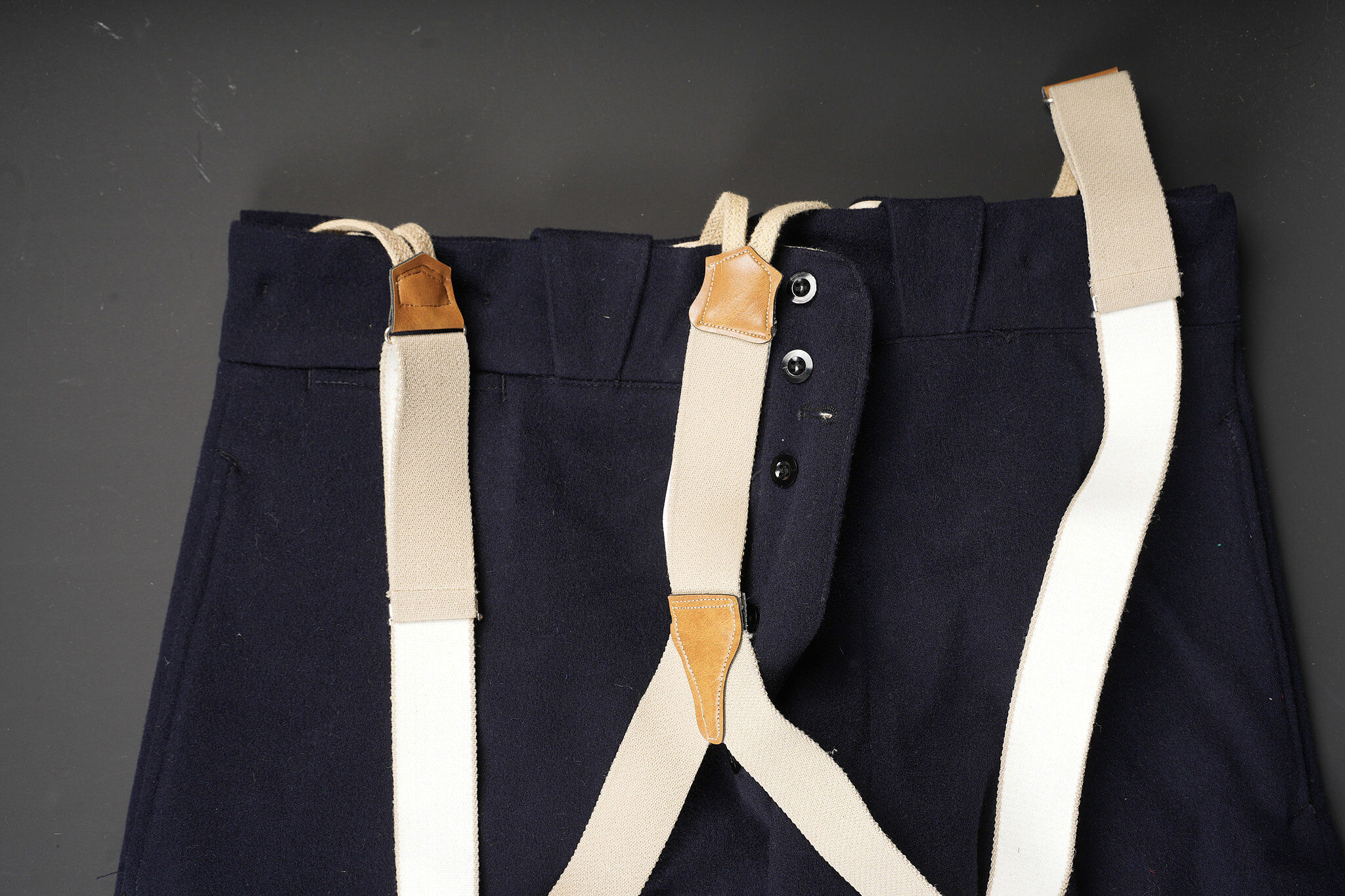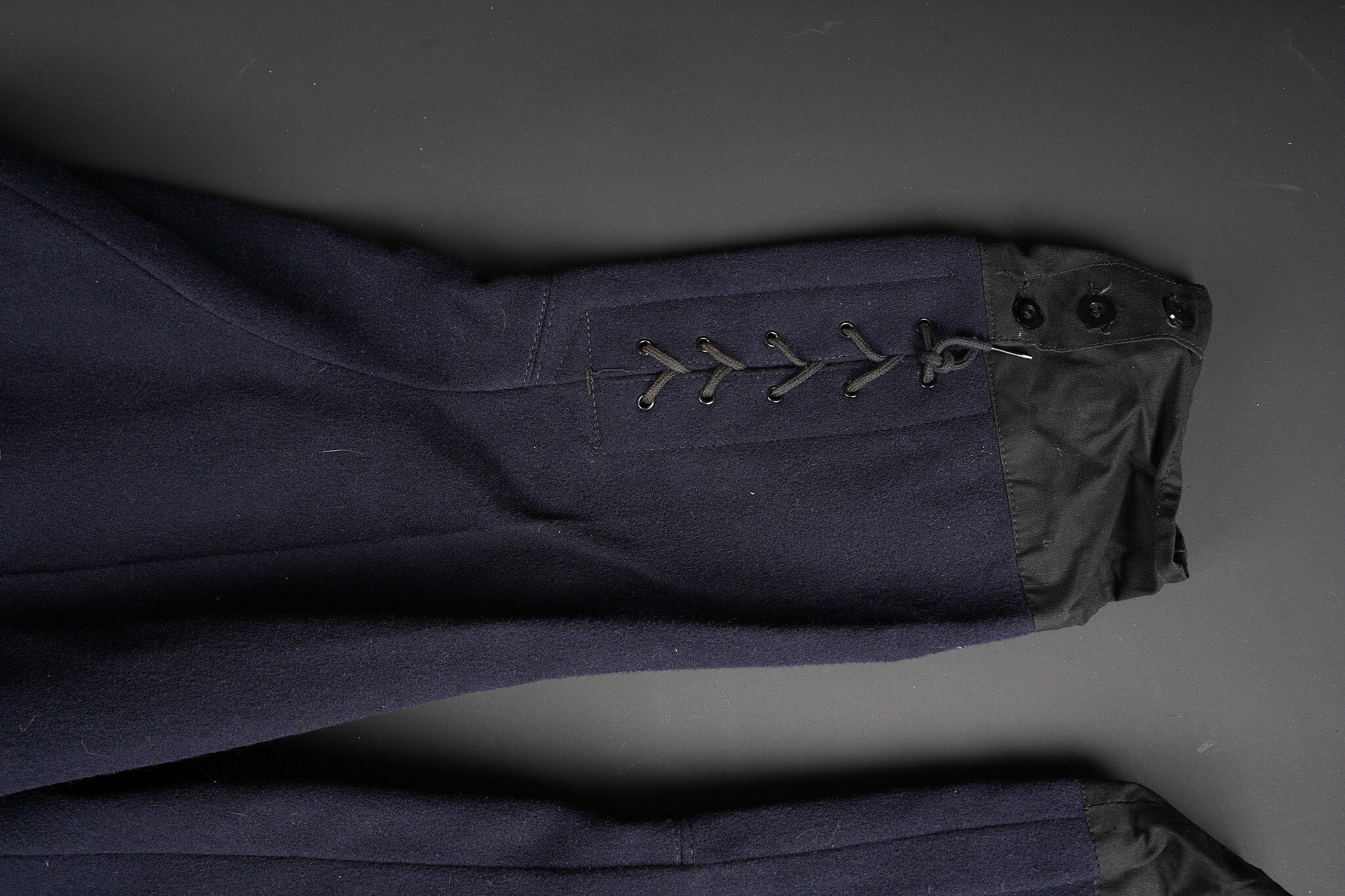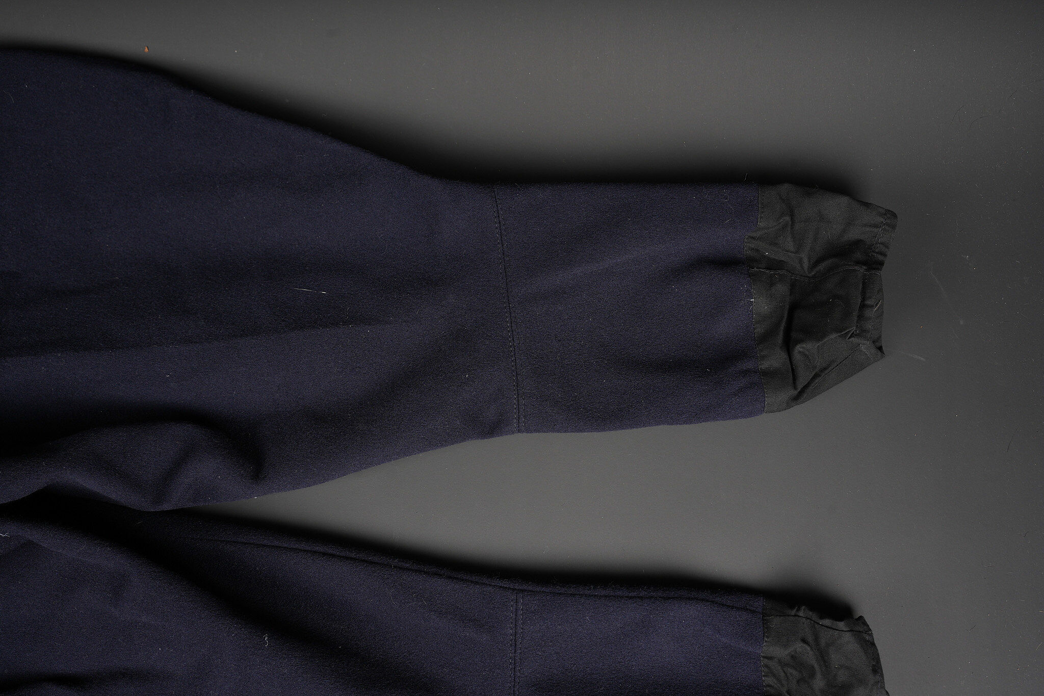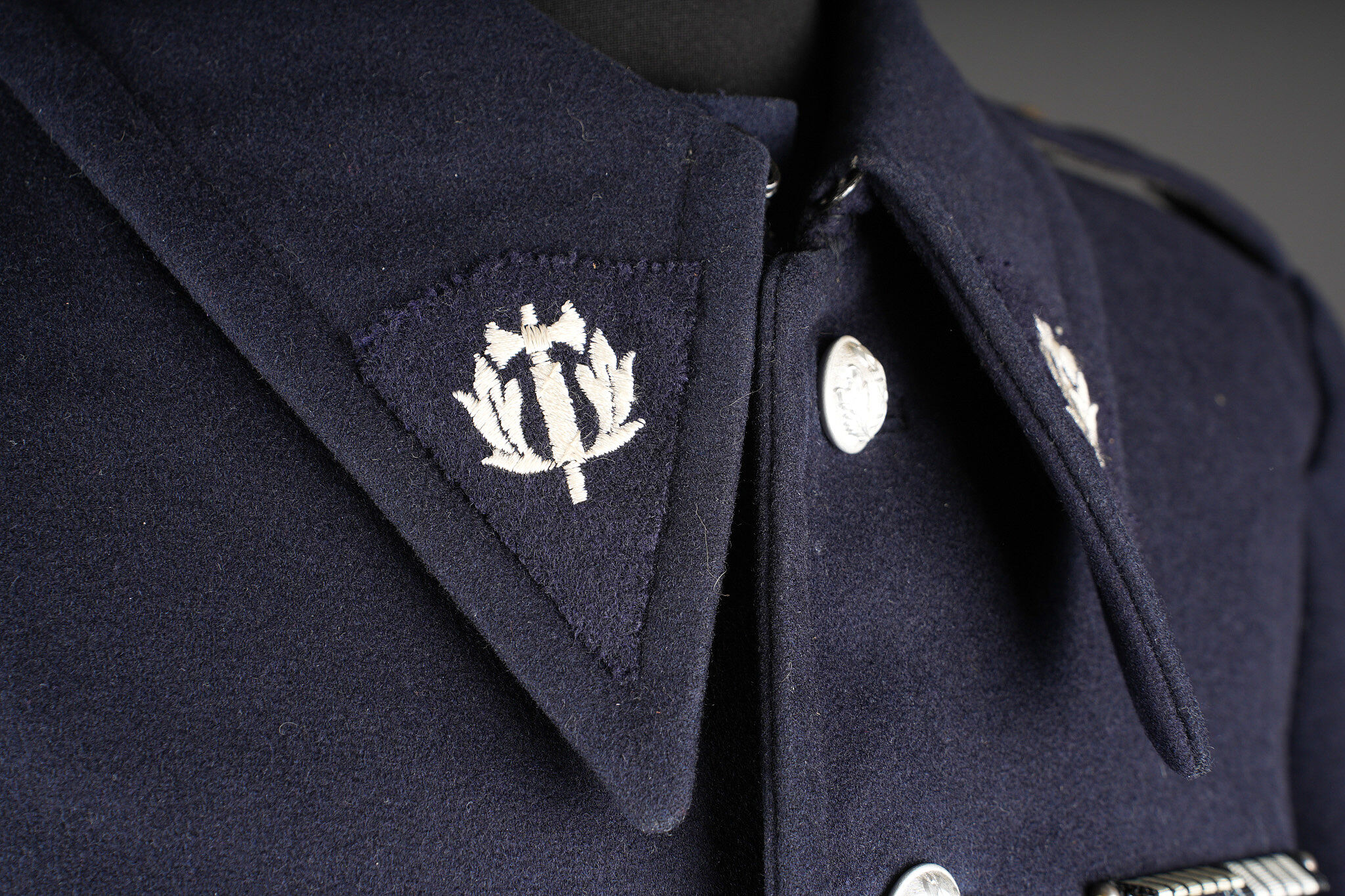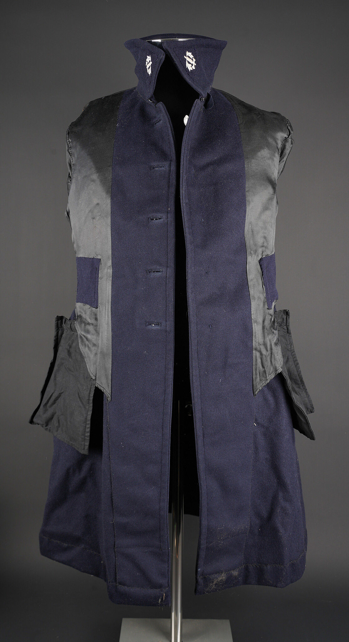 Tenue complète GMR. Comprenant un casque Adrian modèle 1926 reconditionné en noir et dont le cimier a été également reconditionné. Insigne de la police sous Vichy en métal émaillé avec francisque rapportée en métal possédant encore ses deux pattes d’origine. Coiffe en cuir noir de fabrication armistice, bandeau de laine kaki à huit agrafes. Jugulaire en simili cuir. Un manteau de GMR en laine bleue, pattes de col du modèle troupe brodées au fil de coton blanc. Sur le haut de la manche gauche est cousu l’insigne en métal des GMR à tête de lion. Effet se fermant par cinq boutons aux armes de la police d’Etat, doublure en satinette noire. Sur la poitrine sont fixés deux rappels de la Croix du combattant sous Vichy dans ses deux variantes. Sur l’épaule droite se trouve un cordon de cuir tressé retenant un sifflet orné de la francisque et des initiales P.N., dessoudé par endroits. Une culotte pantalon de fabrication armistice en drap de laine bleue, passants en trapèze, bas des jambes se fermant par lacets et trois boutons. Doublure en coton écru portant la taille 96L ainsi qu’un fabricant à Roubaix, avec ses bretelles. Effet parfaitement homogène avec le manteau. Une paire de guêtres noires en cuir, tamponnées 1943. Un ensemble ceinturon, baudrier et étui de pistolet pour PA MAB B, le tout en cuir noir. On y joint une Croix de guerre 1939 avec ruban vert Vichy et une Croix du combattant portant au revers les chiffres gravés 39-40, ruban dit du deuxième modèle sous Vichy. Tenue complète GMR. Comprising a Model 1926 Adrian helmet refurbished in black with the crest likewise refinished. Vichy period police badge in enamelled metal with applied francisque retaining its two original lugs. Armistice production black leather liner with khaki wool sweatband secured by eight clips. Simili leather chinstrap. Blue wool GMR greatcoat with other ranks pattern collar tabs embroidered in white cotton. On the upper left sleeve is sewn the metal GMR lion head badge. The garment fastens with five State Police buttons and is lined in black satinette. On the chest are two ribbon bars for the Vichy issue Combatant’s Cross in its two variants. On the right shoulder a braided leather lanyard retaining a whistle decorated with a francisque and the initials P.N., partly unsoldered. A pair of armistice manufacture breeches in blue wool with trapezoidal belt loops, lower legs closing by laces and three buttons, ecru cotton lining stamped size 96L and maker in Roubaix, complete with its braces. The set is perfectly matched to the greatcoat. A pair of black leather gaiters stamped 1943. A set consisting of belt, shoulder strap and pistol holster for MAB Model B automatic pistol in black leather. Included is a 1939 Croix de guerre with Vichy green ribbon and a Combatant’s Cross engraved 39-40 on the reverse with second pattern Vichy ribbon.