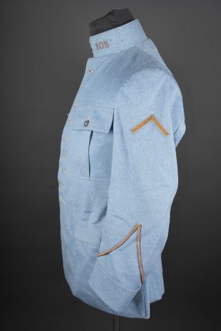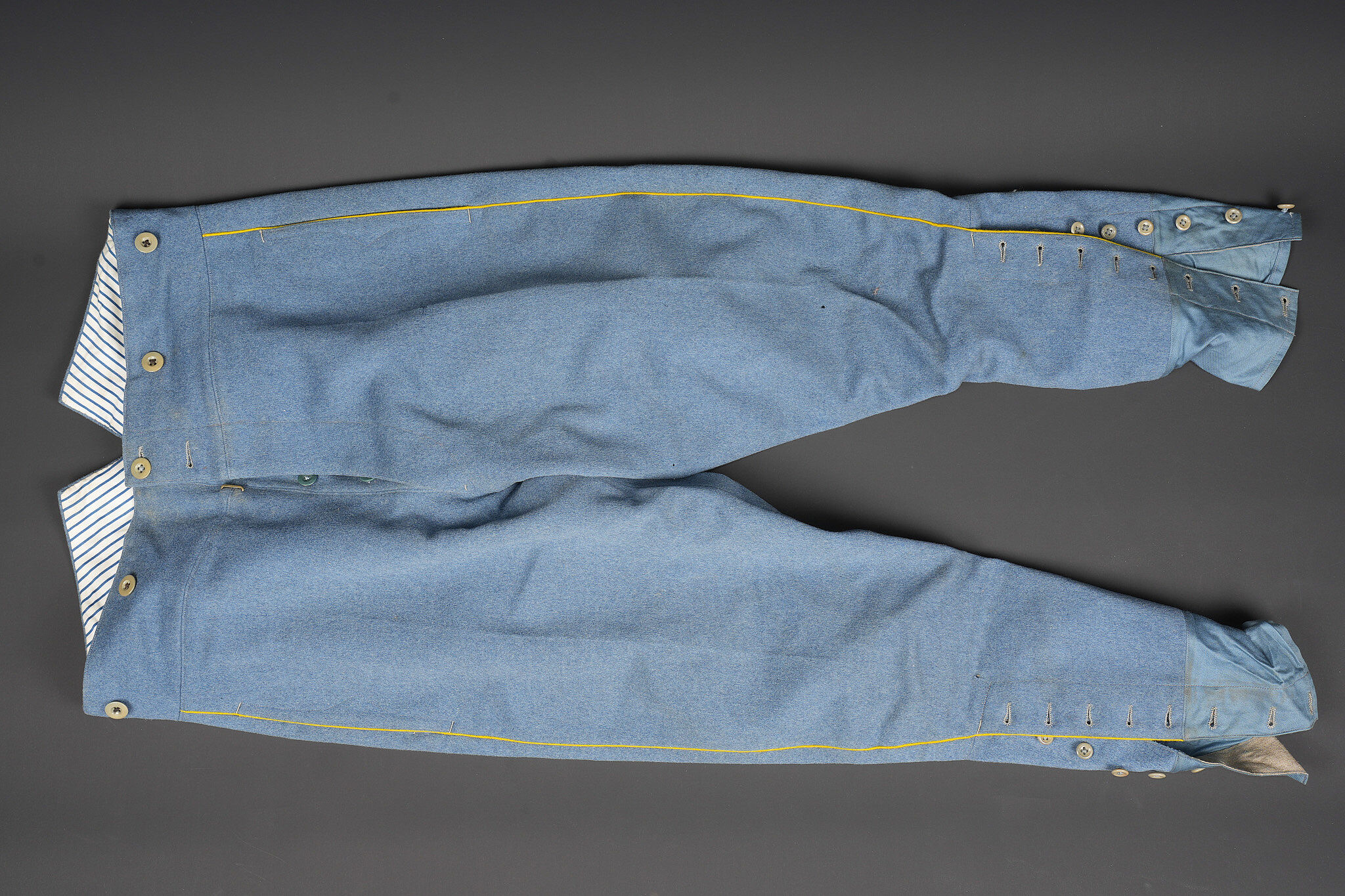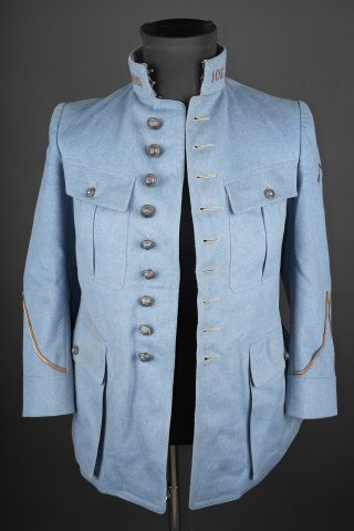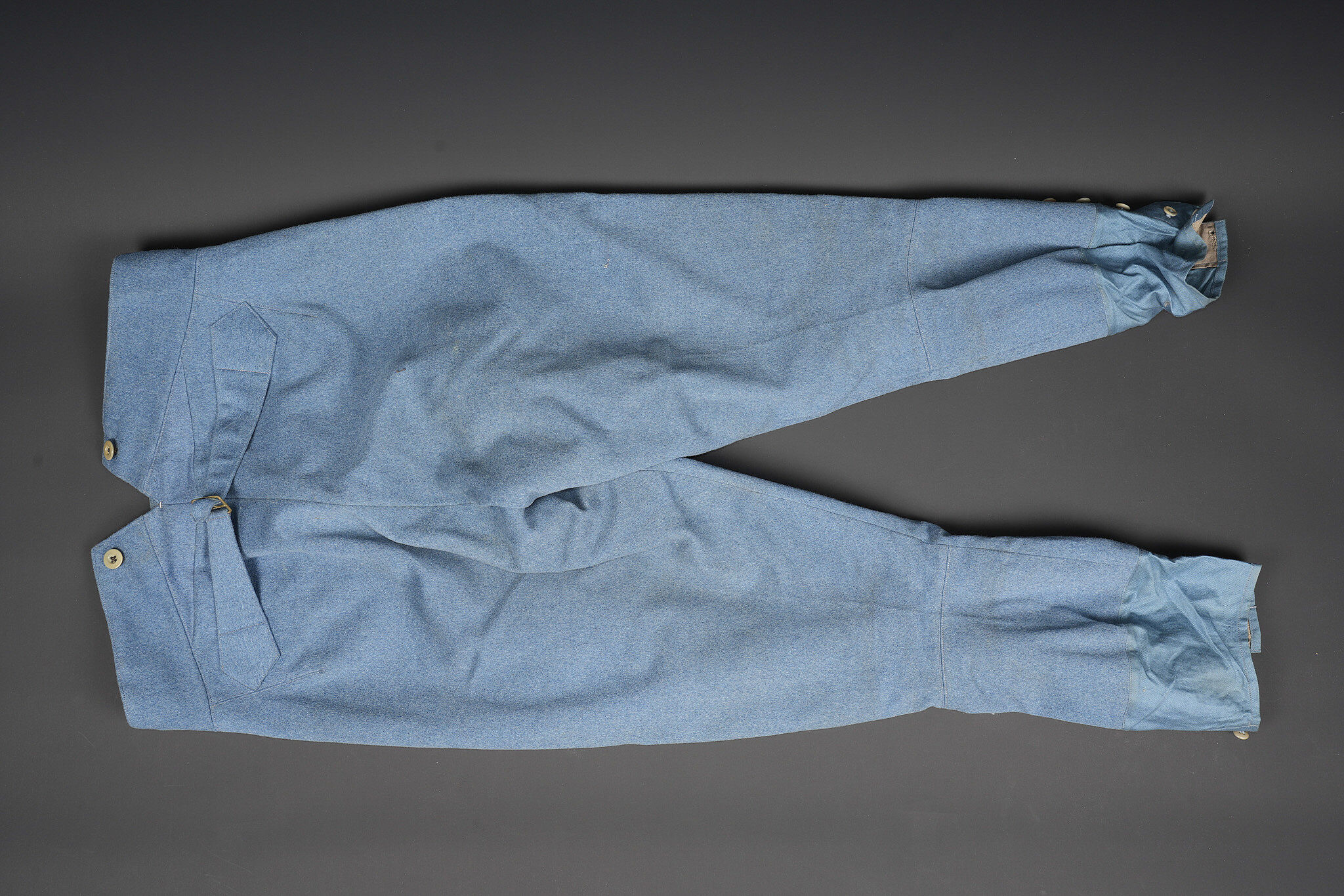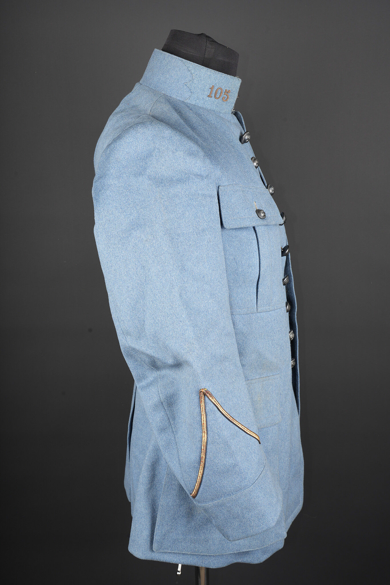Uniforme d’adjudant du 105ème d’infanterie. Comprenant une veste à quatre poches entièrement confectionnée en fin drap bleu horizon, pattes de col bleu horizon possédant le chiffre 105 brodé cannetille, ce régiment était en garnison à Riom. Se fermant sur le devant par neuf boutons aux armes de l’infanterie, doublure en coton ne portant pas de marquage. Culotte officier bleu horizon. Entièrement en drap fin bleu horizon dit officier, se fermant par sept boutons, passepoil jonquille de l’infanterie. Doublure en coton rayé, manchettes se fermant à l’aide de huit boutons et se terminant par une partie en tissu. Adjutant’s uniform of the 105th Infantry Regiment. Comprising a four-pocket tunic entirely tailored in fine horizon blue wool cloth. Horizon blue collar tabs bearing the number 105 embroidered in bullion wire; this regiment was garrisoned in Riom. Front fastening with nine infantry-pattern buttons. Cotton lining without visible markings. Officer-style horizon blue breeches. Entirely made of fine officer-grade horizon blue wool cloth, fastening with seven buttons, with jonquil-yellow infantry piping. Interior lined in striped cotton. Lower leg cuffs fastening with eight buttons and ending in a cloth extension.