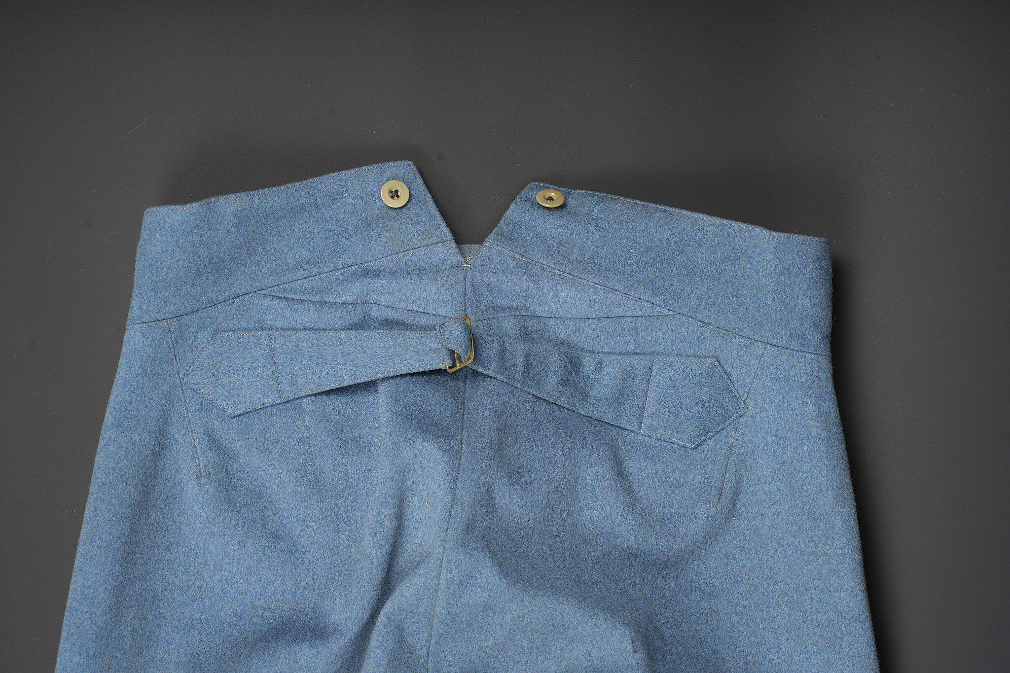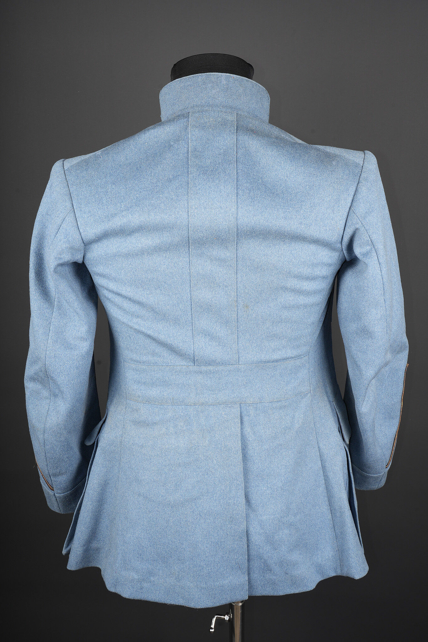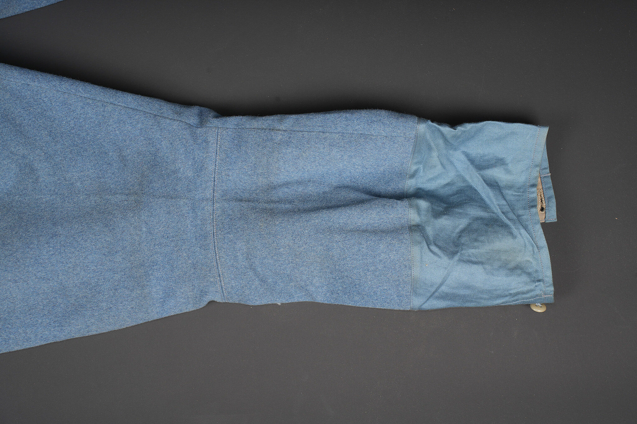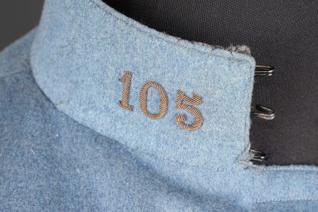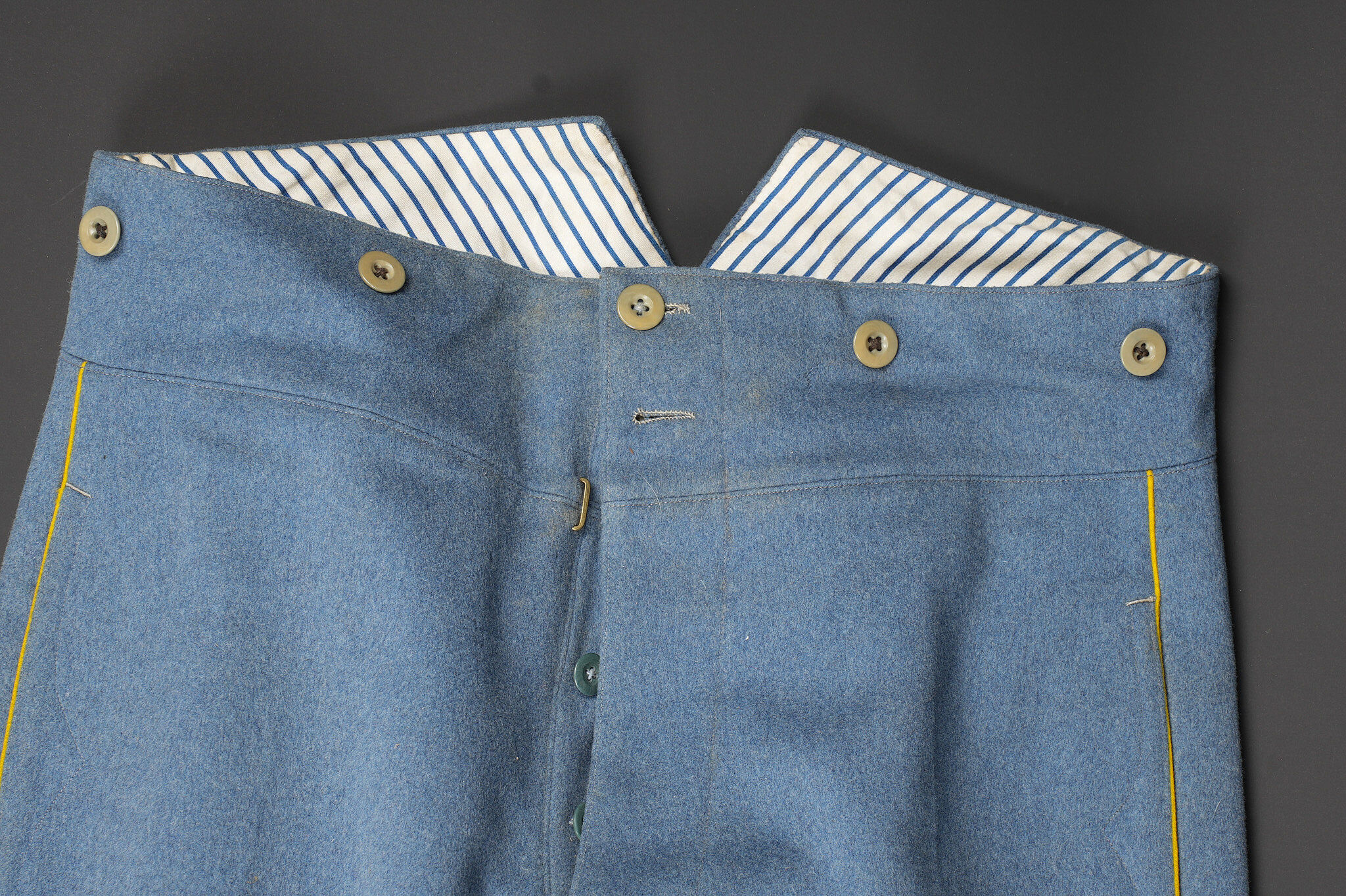 Uniforme d’adjudant du 105ème d’infanterie. Comprenant une veste à quatre poches entièrement confectionnée en fin drap bleu horizon, pattes de col bleu horizon possédant le chiffre 105 brodé cannetille, ce régiment était en garnison à Riom. Se fermant sur le devant par neuf boutons aux armes de l’infanterie, doublure en coton ne portant pas de marquage. Culotte officier bleu horizon. Entièrement en drap fin bleu horizon dit officier, se fermant par sept boutons, passepoil jonquille de l’infanterie. Doublure en coton rayé, manchettes se fermant à l’aide de huit boutons et se terminant par une partie en tissu. Adjutant’s uniform of the 105th Infantry Regiment. Comprising a four-pocket tunic entirely tailored in fine horizon blue wool cloth. Horizon blue collar tabs bearing the number 105 embroidered in bullion wire; this regiment was garrisoned in Riom. Front fastening with nine infantry-pattern buttons. Cotton lining without visible markings. Officer-style horizon blue breeches. Entirely made of fine officer-grade horizon blue wool cloth, fastening with seven buttons, with jonquil-yellow infantry piping. Interior lined in striped cotton. Lower leg cuffs fastening with eight buttons and ending in a cloth extension.