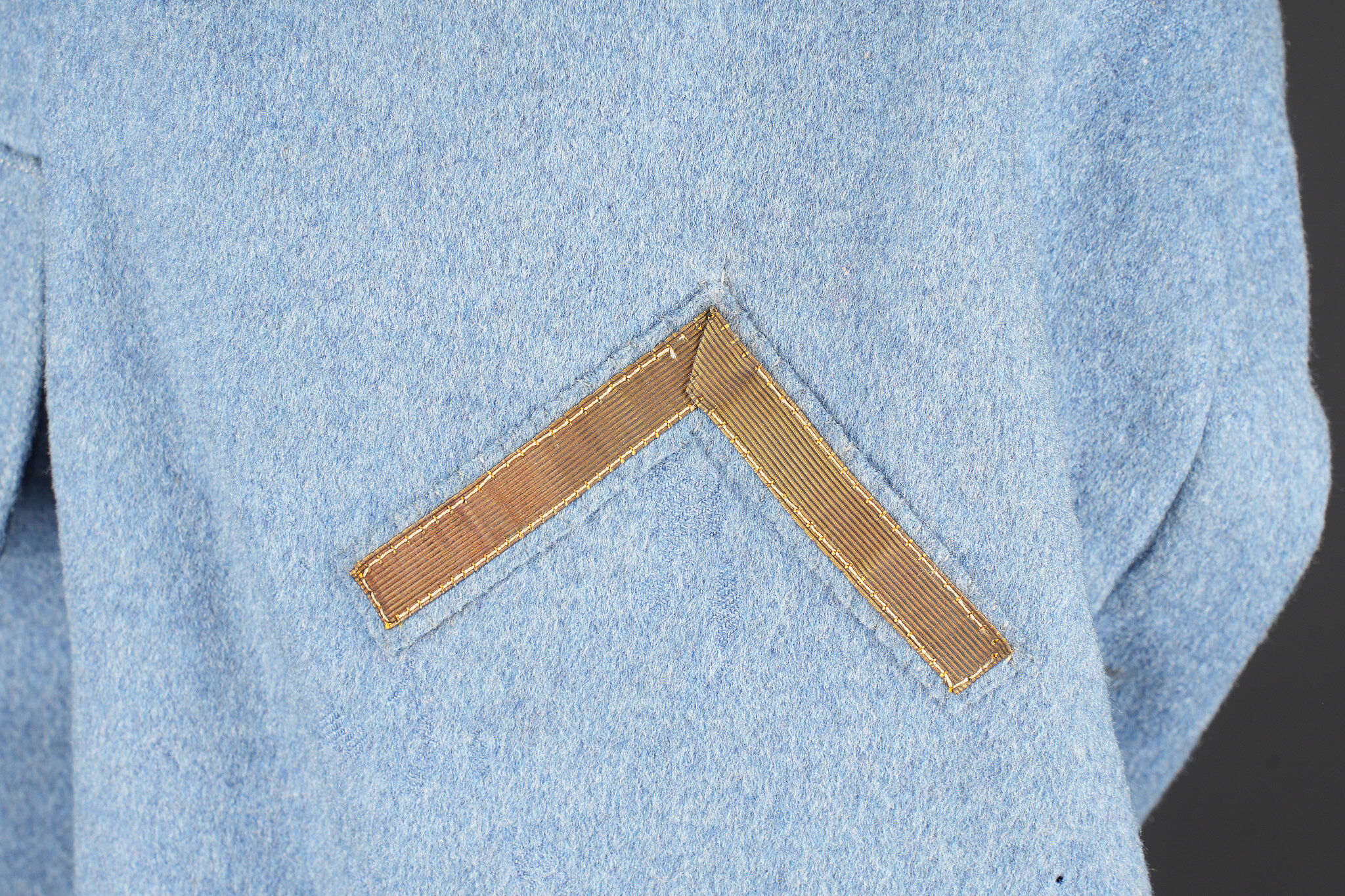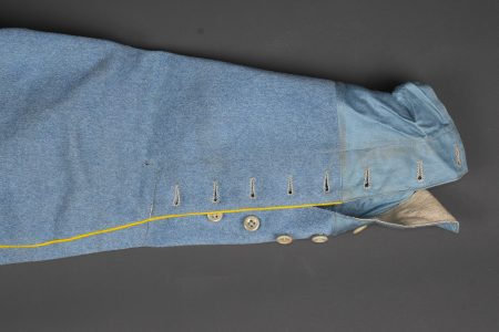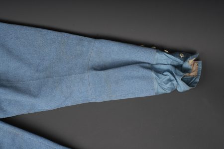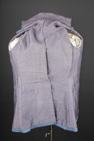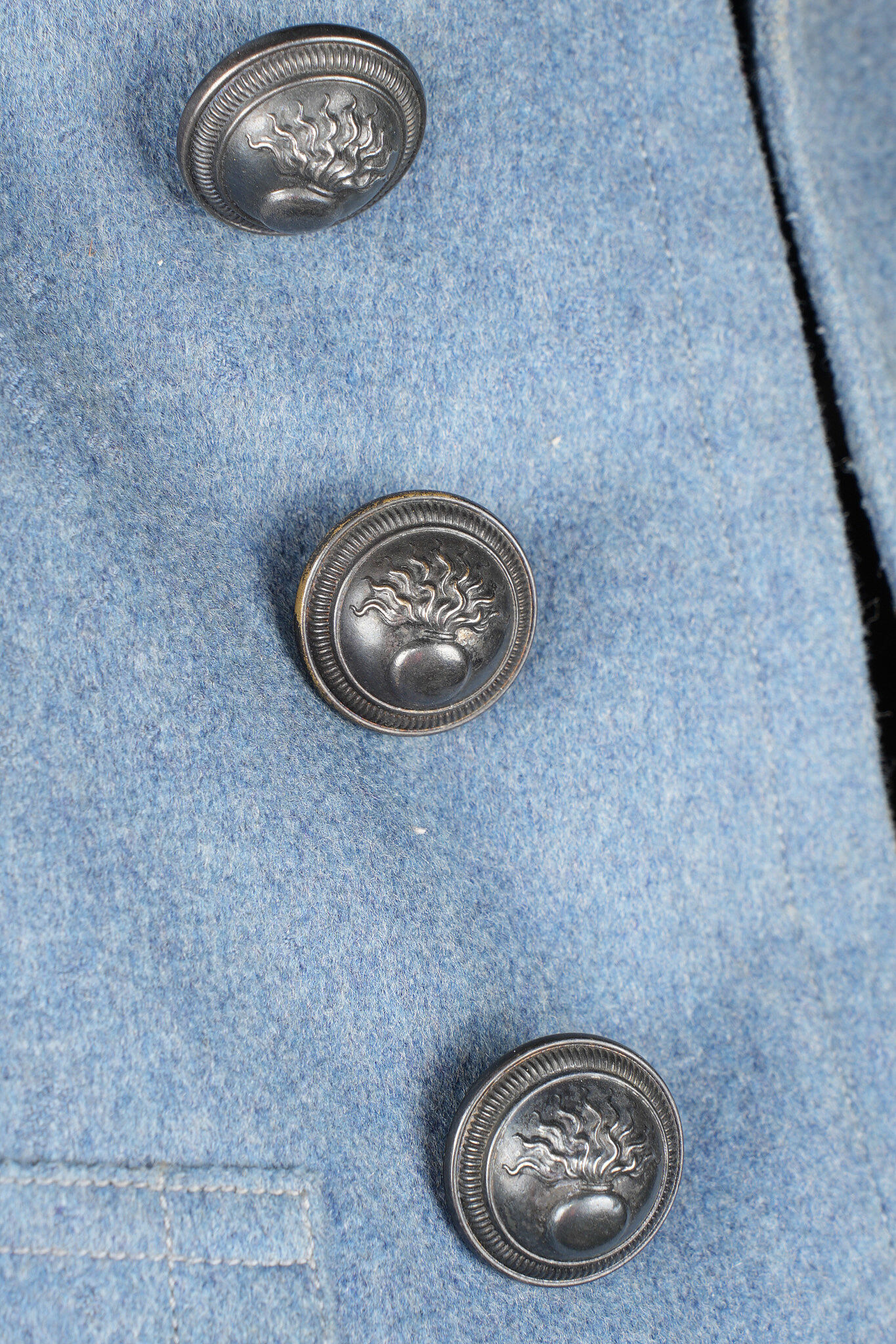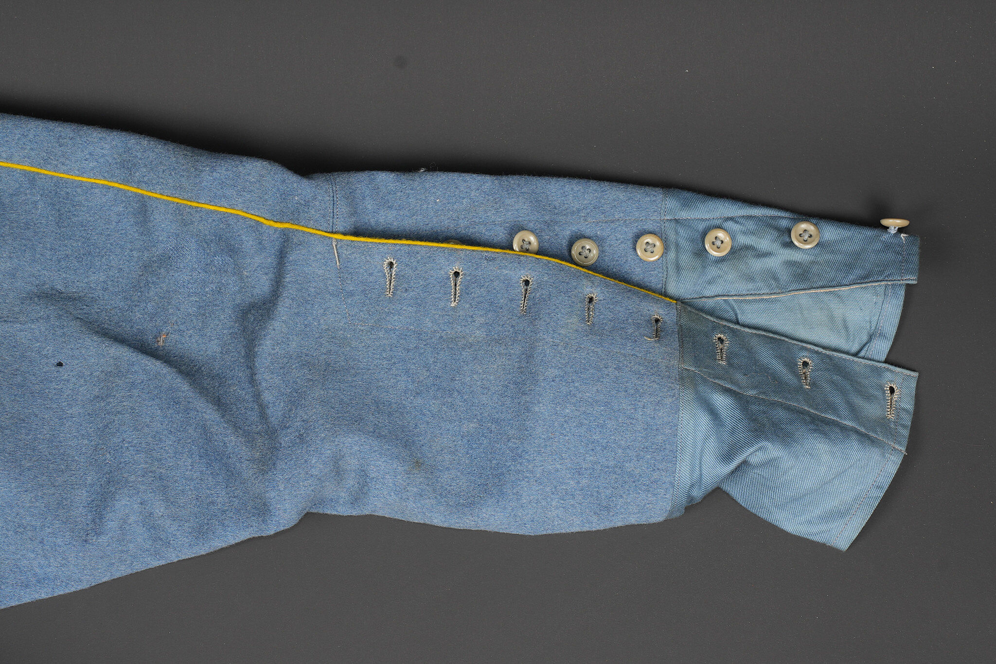 Uniforme d’adjudant du 105ème d’infanterie. Comprenant une veste à quatre poches entièrement confectionnée en fin drap bleu horizon, pattes de col bleu horizon possédant le chiffre 105 brodé cannetille, ce régiment était en garnison à Riom. Se fermant sur le devant par neuf boutons aux armes de l’infanterie, doublure en coton ne portant pas de marquage. Culotte officier bleu horizon. Entièrement en drap fin bleu horizon dit officier, se fermant par sept boutons, passepoil jonquille de l’infanterie. Doublure en coton rayé, manchettes se fermant à l’aide de huit boutons et se terminant par une partie en tissu. Adjutant’s uniform of the 105th Infantry Regiment. Comprising a four-pocket tunic entirely tailored in fine horizon blue wool cloth. Horizon blue collar tabs bearing the number 105 embroidered in bullion wire; this regiment was garrisoned in Riom. Front fastening with nine infantry-pattern buttons. Cotton lining without visible markings. Officer-style horizon blue breeches. Entirely made of fine officer-grade horizon blue wool cloth, fastening with seven buttons, with jonquil-yellow infantry piping. Interior lined in striped cotton. Lower leg cuffs fastening with eight buttons and ending in a cloth extension.