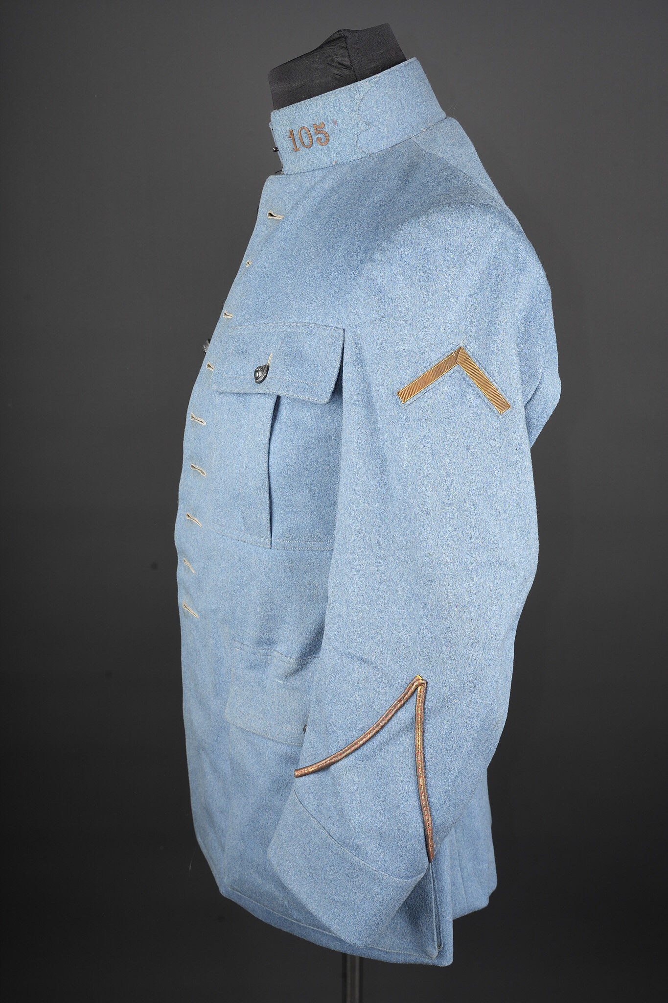 Uniforme d’adjudant du 105ème d’infanterie. Comprenant une veste à quatre poches entièrement confectionnée en fin drap bleu horizon, pattes de col bleu horizon possédant le... en savoir plus