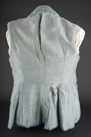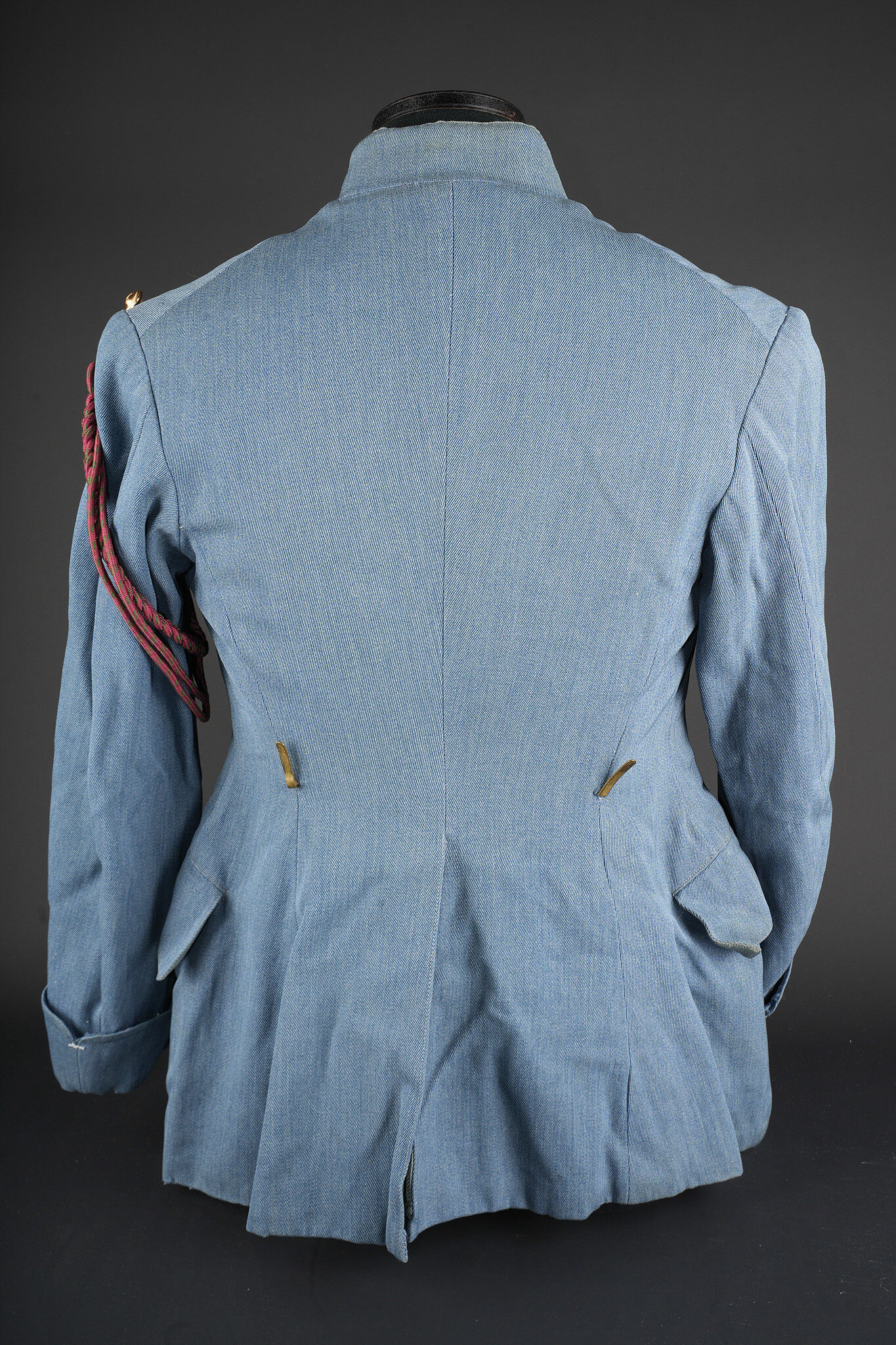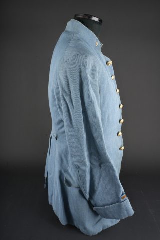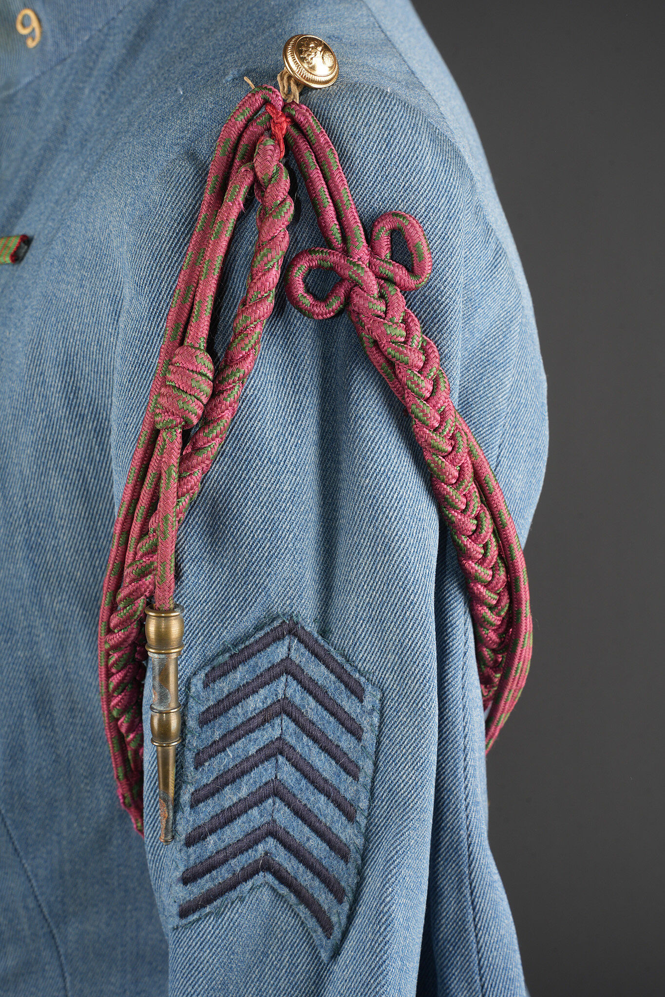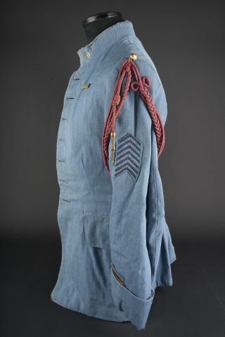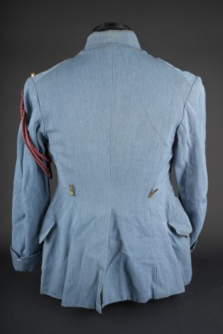Vareuse d’un sous-lieutenant du 9e RI. En fin drap bleu horizon, fermant par 7 boutons de l’arme. Col droit avec chiffres 9 métalliques. Rappel de Croix de Guerre. Grade de sous-lieutenant sur drap bleu horizon au bas des manches. 7 chevrons de présence au front au bras gauche, avec fourragère aux couleurs de la Croix de Guerre. Doublure de soie bleue. Usure, quelques réparations minimes. Horizon blue tunic of a second lieutenant, 9th Infantry Regiment Fine horizon blue cloth tunic fastening with seven branch buttons. Stand-up collar fitted with metallic numeral 9. Ribbon bar for the Croix de Guerre. Second lieutenant rank braid on horizon blue backing at the lower sleeves. Seven overseas service chevrons on the left sleeve, with Croix de Guerre fourragère. Blue silk lining. Showing wear with a few minor repairs.