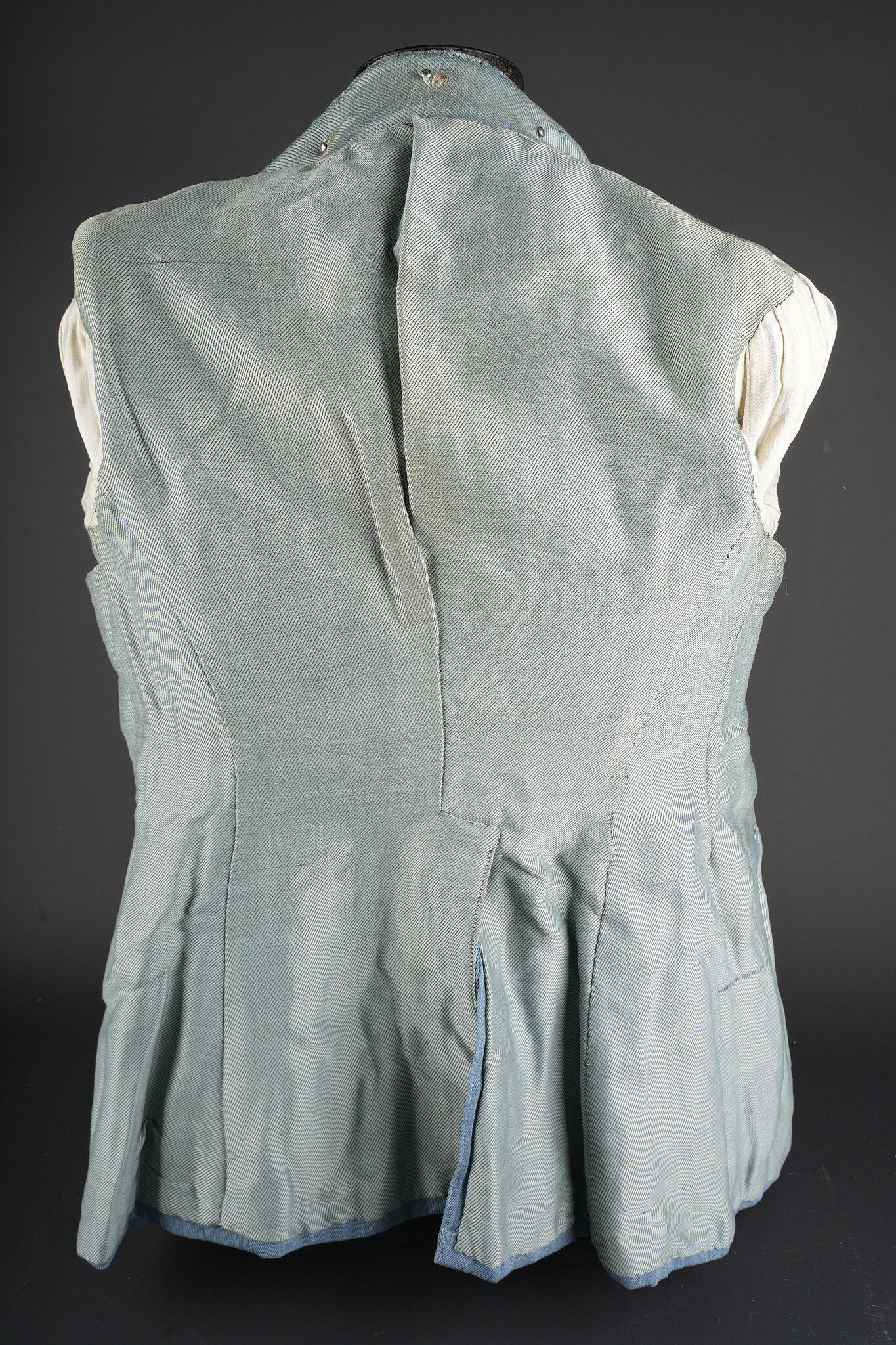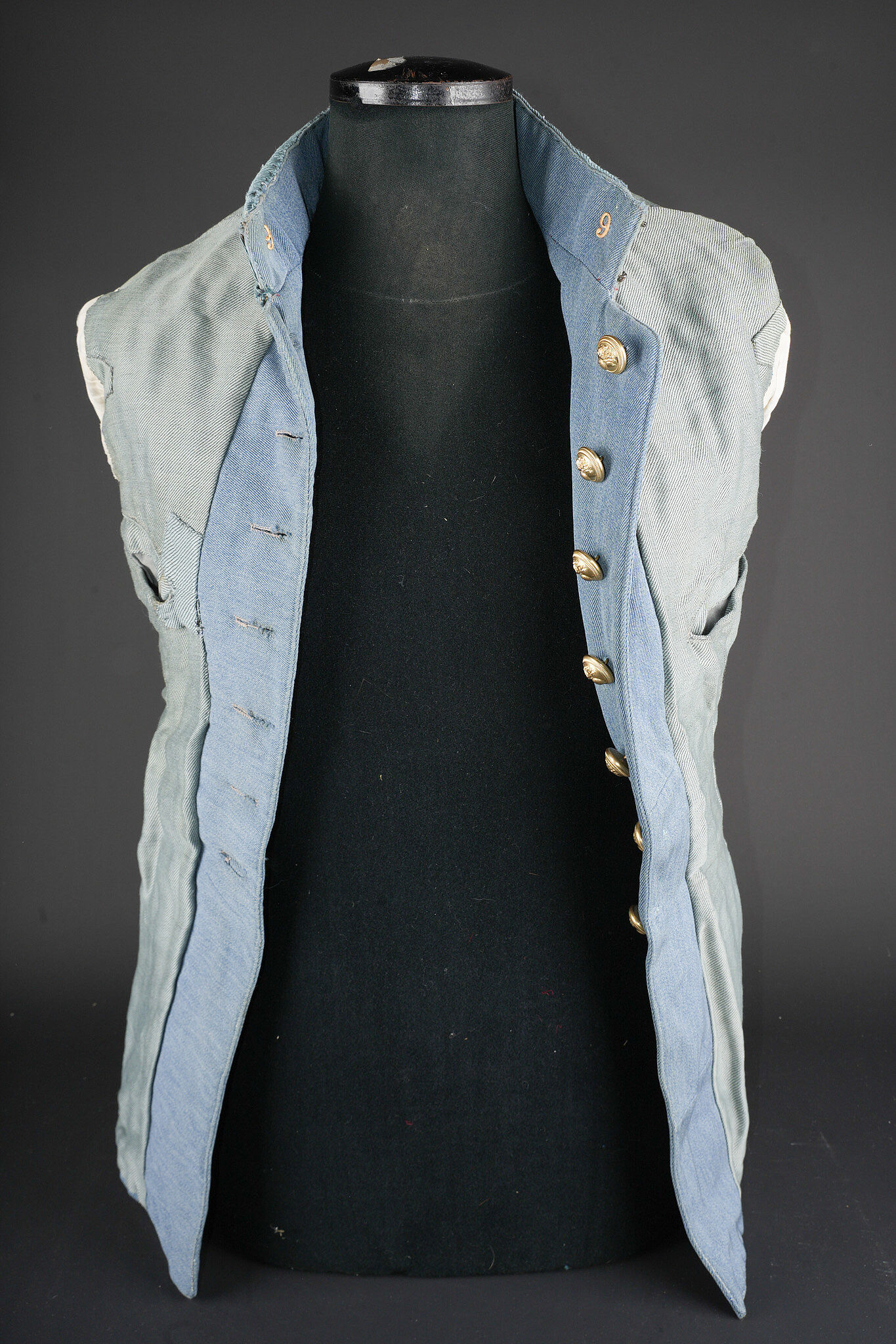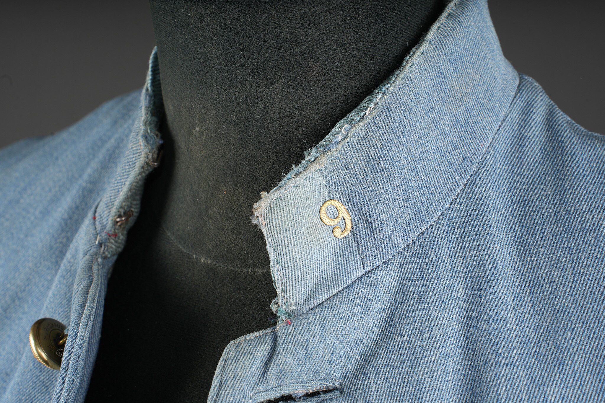 Vareuse d’un sous-lieutenant du 9e RI. En fin drap bleu horizon, fermant par 7 boutons de l’arme. Col droit avec chiffres 9 métalliques. Rappel de Croix de Guerre. Grade de sous-lieutenant sur drap bleu horizon au bas des manches. 7 chevrons de présence au front au bras gauche, avec fourragère aux couleurs de la Croix de Guerre. Doublure de soie bleue. Usure, quelques réparations minimes. Horizon blue tunic of a second lieutenant, 9th Infantry Regiment Fine horizon blue cloth tunic fastening with seven branch buttons. Stand-up collar fitted with metallic numeral 9. Ribbon bar for the Croix de Guerre. Second lieutenant rank braid on horizon blue backing at the lower sleeves. Seven overseas service chevrons on the left sleeve, with Croix de Guerre fourragère. Blue silk lining. Showing wear with a few minor repairs.